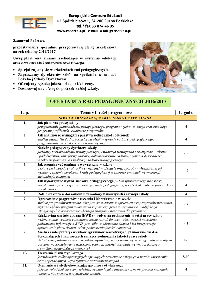 Europejskie Centrum Edukacji ul. Spółdzielców 1, 34-200 Sucha Beskidzka tel./ fax 33 874 46 05 www.ece.szkola.pl e-mail: [email protected] Szanowni Państwo, przedstawiamy specjalnie przygotowaną ofertę szkoleniową na rok szkolny 2016/2017. Uwzględnia ona zmiany zachodzące w systemie edukacji oraz oczekiwania środowiska oświatowego. Specjalizujemy się w szkoleniach rad pedagogicznych. Zapraszamy dyrektorów szkół na spotkania w ramach Lokalnej Szkoły Dyrektorów. Oferujemy wysoką jakość usług i niskie ceny. Dostosowujemy ofertę do potrzeb każdej szkoły. OFERTA DLA RAD PEDAGOGICZNYCH 2016/2017 L. p. 1. 2. 3. 4. 5. 6. 7. 8. 9. 10. 11. Tematy i treści programowe SZKOŁA PRZYJAZNA, NOWOCZESNA I EFEKTYWNA Jak planować pracę szkoły przygotowanie planu nadzoru pedagogicznego, programu wychowawczego oraz szkolnego programu profilaktyki; ewaluacja programów Jak analizować wymagania państwa wobec szkół i placówek analiza załącznika do Rozporządzenia MEN w sprawie nadzoru pedagogicznego; przygotowanie szkoły do realizacji ww. wymagań Nadzór pedagogiczny dyrektora szkoły podstawy prawne nadzoru pedagogicznego; ewaluacja wewnętrzna i zewnętrzna – różnice i podobieństwa; inne formy nadzoru; dokumentowanie nadzoru; wymiana doświadczeń w zakresie planowania i realizacji nadzoru pedagogicznego Jak organizować ewaluację wewnętrzną w szkole istota, cele i metody ewaluacji wewnętrznej w oświacie oraz sposoby wykorzystania jej wyników; zadania dyrektora i rady pedagogicznej w zakresie ewaluacji wewnętrznej, metodologia ewaluacji Jak wykorzystać wyniki nadzoru pedagogicznego, w tym sprawowanego nad szkołą lub placówką przez organ sprawujący nadzór pedagogiczny, w celu doskonalenia pracy szkoły lub placówki Rola dyrektora w doskonaleniu zawodowym nauczycieli i rozwoju szkoły Opracowanie programów nauczania i ich wdrażanie w szkole modele programów nauczania, akty prawne związane z opracowaniem programów nauczania, kryteria wyboru programu nauczania napisanego przez innego autora, modyfikacja istniejącego lub opracowanie własnego programu nauczania dla przedmiotu Edukacyjna wartość dodana (EWD) – wpływ na podnoszenie jakości pracy szkoły wykorzystanie wyników egzaminów zewnętrznych do oceny efektywności nauczania, podstawowe informacje o EWD, prawidłowe odczytanie danych i ich interpretacja, opracowanie planu działań celem podnoszenia jakości nauczania Analiza i interpretacja wyników egzaminów zewnętrznych, planowanie działań doskonalących i naprawczych na rzecz podnoszenia jakości pracy szkoły statystyczne podstawy analizy wyników egzaminu, opracowanie wyników egzaminów w ujęciu ilościowym, formułowanie wniosków, ocena zgodności oceniania wewnątrzszkolnego z wynikami egzaminów zewnętrznych Tworzenie planu wynikowego formułowanie celów operacyjnych opisujących zamierzone osiągnięcia ucznia, taksonomia celów operacyjnych, wyodrębnianie poziomów wymagań Ocenianie w świetle obowiązującego prawa oświatowego pojęcie, rola i funkcja oceny szkolnej, ocenianie jako integralny element procesu nauczania i uczenia się, ocena a motywowanie uczniów 1 L. godz. 4 4 4-6 4-6 4 4 4-5 4-5 4-5 8-10 4 12. 13. 14. 15. 16. 17. 18. 19. 20. 21. 22. 23. 24. 25. 26. Ocenianie kształtujące w teorii i praktyce idea i elementy oceniania kształtującego, ćwiczenia ilustrujące stosowanie oceniania kształtującego, ocena sumująca a ocena kształtująca; dlaczego uczeń powinien znać cel lekcji, jak zadawać uczniom dobre pytania, ocena koleżeńska i samoocena, korzyści i trudności związane z oceną kształtującą Innowacje i eksperymenty pedagogiczne – nowoczesna oferta edukacyjna szkoły koncepcja pracy szkoły z uwzględnieniem jej potrzeb, osiągnięć i wymagań zewnętrznych, pojęcia innowacji i eksperymentu pedagogicznego w świetle rozporządzenia MENiS z dnia 9 kwietnia 2002 r.; sporządzanie dokumentacji, wdrożenie i ewaluacja rozwiązań innowacyjnych Prawo oświatowe w praktyce szkolnej podstawowe regulacje prawne, obowiązki i odpowiedzialność nauczycieli, możliwości awansu zawodowego nauczyciela, ochrona zatrudnienia, uprawnienia socjalne, nagrody Odpowiedzialność prawna nauczycieli akty prawne określające zasady odpowiedzialności nauczyciela, zmiany w przepisach dotyczących odpowiedzialności dyscyplinarnej ; rodzaje odpowiedzialności prawnej – odpowiedzialność cywilna, karna, dyscyplinarna, porządkowa, materialna Prowadzenie dokumentacji szkolnej, w tym przebiegu nauczania uwarunkowania prawne, dokumentacja szkolna w praktyce, jak prawidłowo prowadzić dokumentację przebiegu nauczania Ochrona danych osobowych w oświacie akty prawne dot. ochrony danych osobowych, podstawowe pojęcia dot. danych osobowych; organizacja ochrony danych osobowych, przetwarzanie danych osobowych, ochrona wizerunku ucznia, dziennik elektroniczny; wymagania wynikające z ustawy o ochronie danych osobowych, odpowiedzialność karna i dyscyplinarna Sytuacje trudne w szkole – metody zapobiegania i rozwiązywania napięć i konfliktów rozwiązywanie konfliktów przy użyciu mediacji, zadania i kompetencje mediatora, umiejętność dobrego komunikowania się, wyrażania uczuć, empatii, techniki mediacyjne, budowanie relacji opartych na współpracy, procedura prowadzenia negocjacji w sytuacjach konfliktowych Bezpieczna szkoła – normy i procedury postępowania obowiązujące w szkole uwarunkowania, profilaktyka i zwalczanie przemocy w środowiskach szkolnych; przemoc w Internecie; współpraca szkoły ze środowiskiem rodzinnym uczniów, instytucjami oraz organizacjami społecznymi w procesie przeciwdziałania agresji; ochrona obiektów szkolnych, systemy zabezpieczeń, bezpieczeństwo systemów informatycznych; przeciwdziałanie narkomanii w szkole, BHP i ochrona p-poż obiektów szkolnych Rola szkoły w przeciwdziałaniu przemocy w rodzinie zapisy ustawy o przeciwdziałaniu przemocy w rodzinie, a