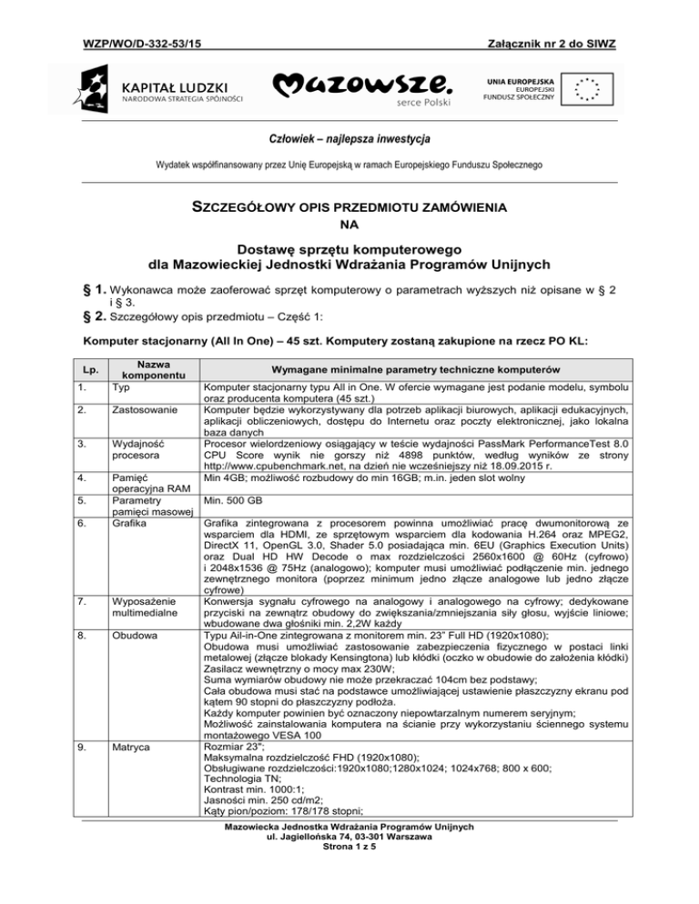 Komputer stacjonarny (All In One) – 45 szt. Komputery zostaną zakupione na rzecz PO KL: