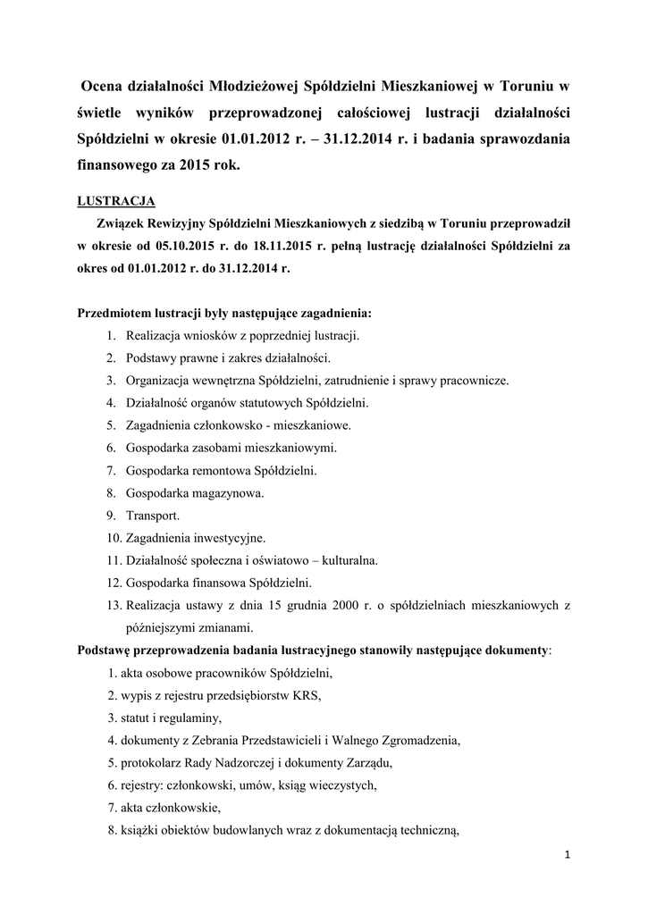 Ocena działalności Młodzieżowej Spółdzielni Mieszkaniowej w Toruniu w świetle wyników przeprowadzonej całościowej lustracji działalności Spółdzielni w okresie 01.01.2012 r. – 31.12.2014 r. i badania sprawozdania finansowego za 2015 rok. LUSTRACJA Związek Rewizyjny Spółdzielni Mieszkaniowych z siedzibą w Toruniu przeprowadził w okresie od 05.10.2015 r. do 18.11.2015 r. pełną lustrację działalności Spółdzielni za okres od 01.01.2012 r. do 31.12.2014 r. Przedmiotem lustracji były następujące zagadnienia: 1. Realizacja wniosków z poprzedniej lustracji. 2. Podstawy prawne i zakres działalności. 3. Organizacja wewnętrzna Spółdzielni, zatrudnienie i sprawy pracownicze. 4. Działalność organów statutowych Spółdzielni. 5. Zagadnienia członkowsko - mieszkaniowe. 6. Gospodarka zasobami mieszkaniowymi. 7. Gospodarka remontowa Spółdzielni. 8. Gospodarka magazynowa. 9. Transport. 10. Zagadnienia inwestycyjne. 11. Działalność społeczna i oświatowo – kulturalna. 12. Gospodarka finansowa Spółdzielni. 13. Realizacja ustawy z dnia 15 grudnia 2000 r. o spółdzielniach mieszkaniowych z późniejszymi zmianami. Podstawę przeprowadzenia badania lustracyjnego stanowiły następujące dokumenty: 1. akta osobowe pracowników Spółdzielni, 2. wypis z rejestru przedsiębiorstw KRS, 3. statut i regulaminy, 4. dokumenty z Zebrania Przedstawicieli i Walnego Zgromadzenia, 5. protokolarz Rady Nadzorczej i dokumenty Zarządu, 6. rejestry: członkowski, umów, ksiąg wieczystych, 7. akta członkowskie, 8. książki obiektów budowlanych wraz z dokumentacją techniczną, 1 9. wypisy z ksiąg wieczystych, 10. plan finansowy Spółdzielni i plan remontów, 11. umowy na usługi komunalne i wykonywane prace remontowe, 12. księgi rachunkowe. Ustalenia lustracji oparte są na stwierdzonych faktach i wynikają z przedłożonych lustratorom dokumentów oraz wyjaśnień złożonych przez pracowników Spółdzielni. W trakcie badania lustracyjnego stwierdzono, że: 1. Spółdzielnia w badanym okresie posiadała unormowania wewnętrzne zgodne z obowiązującymi aktami prawnymi. 2. Stan zatrudnienia jest zgodny ze strukturą organizacyjną zatwierdzoną przez Radę Nadzorczą. Dokumentacja osobowa jest prowadzona prawidłowo i jest zabezpieczona przed wglądem osób nieuprawnionych. Pracownicy posiadają odpowiednie kwalifikacje do wykonywania powierzonych obowiązków. 3. Dokumentacja Rady Nadzorczej jest zgodna z postanowieniami Statutu. 4. Uchwały podejmowane przez Zarząd w badanym okresie nie budzą zastrzeżeń pod względem legalności jak również zasadności ich podejmowania. 5. Dokumenty członkowsko – mieszkaniowe wybrane losowo przez lustratora nie wykazały braków formalnych. Spółdzielnia przestrzega procedury związanej z wykreśleniem z rejestru członkowskiego. 6. Działalność Spółdzielni dotycząca zarządzania nieruchomościami w gospodarce zasobami mieszkaniowymi w latach 2012 -2014 zamknęła się nadwyżką przychodów nad kosztami, którą zgodnie z art. 6.1 ustawy o spółdzielniach mieszkaniowych zaewidencjonowano na rozliczeniach międzyokresowych do rozliczenia w roku następnym i jest zgodna z ewidencją podziału na nieruchomościach Spółdzielni. 7. Windykacja zadłużeń odbywa się w sposób prawidłowy. 8. Spółdzielnia systematycznie dokonuje remontów poszczególnych budynków zgodnie z przyjętym planem remontów oraz uwzględnieniem postulatów zgłaszanych przez mieszkańców na spotkaniach z mieszkańcami oraz Walnym Zgromadzeniu. 9. W ramach prowadzonej działalności inwestycyjnej w 2014 roku Spółdzielnia oddała do użytku 40 mieszkań o łącznej powierzchni 1975 m2, 12 garaży o powierzchni 281 m2 i 10 miejsc postojowych o powierzchni 1.333,70 m2. 10. Spółdzielnia prawidłowo realizuje postanowienia ustawy z dnia 15 grudnia 2000 r. o spółdzielniach mieszkaniowych z późniejszymi zmianami: w 2004 roku dokonała 2 podziału Spółdzielni na nieruchomości. Zarząd systematycznie podejmuje uchwały w przedmiocie określenia odrębnej własności lokali. 11. Księgi rachunkowe prowadzone są na bieżąco, a dowody rachunkowe spełniają kryteria określone w art. 21 i 24 ustawy o rachunkowości. 12. Ewidencja księgowa prowadzona jest w oparciu o zakładowy plan kont stanowiący integralną część Polityki Rachunkowości. Roczne sprawozdania finansowe spełniają wymogi art.52 ustawy o rachunkowości. 13. W okresie objętym lustracją Spółdzielnia na bieżąco regulowała swoje zobowiązania publiczno – prawne wobec dostawców usług i wykonawców robót. Spółdzielnia prowadzi odrębnie dla każdej nieruchomości ewidencję przychodów i kosztów z tytułu mediów komunalnych. Wysokość stawki eksploatacyjnej i funduszu remontowego Rada Nadzorcza uchwaliła w jednakowej wysokości dla całych zasobów. 14. Stan prawny gruntów będących we władaniu Spółdzielni został całkowicie uregulowany. Ocena działalności Spółdzielni. W oparciu o analizę zawartych w protokole ustaleń należy stwierdzić, że Zarząd Spółdzielni w sposób właściwy wypełnia służebną rolę wobec członków. Zarząd w badanym okresie wszelkie zobowiązania Spółdzielni regulował na bieżąco oraz prawidłowo prowadził gospodarkę zasobami mieszkaniowymi. Pod wglądem: legalności - Spółdzielnia działa zgodnie z obowiązującymi przepisami prawa zarówno powszechnie obowiązującego jak i wewnętrznego, gospodarności – Zarząd wykazał się celowym i oszczędnym dysponowaniem środkami za zasadach rachunku ekonomicznego przy zapewnieniu korzyści członkom Spółdzielni, rzetelności – Spółdzielnia dokumentowała wszystkie czynności i zdarzenia gospodarcze zgodnie ze stanem faktycznym, przestrzegania przez Spółdzielnię prowadzenia przez nią działalności w interesie ogółu członków –zasada ta w pełni jest przestrzegana przez Spółdzielnię. Protokół z lustracji liczy 178 stron maszynopisu oraz 12 z