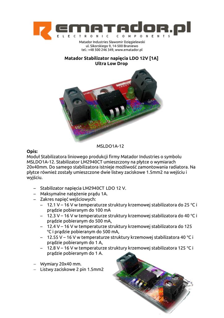 Matador Industries Sławomir Dzięgielewski ul. Sikorskiego 9, 14-500 Braniewo tel.: +48 500 246 349, www.ematador.pl Matador Stabilizator napięcia LDO 12V [1A] Ultra Low Drop MSLDO1A-12 Opis: Moduł Stabilizatora liniowego produkcji firmy Matador Industries o symbolu MSLDO1A-12. Stabilizator LM2940CT umieszczony na płytce o wymiarach 20x40mm. Do samego stabilizatora istnieje możliwość zamontowania radiatora. Na płytce również zostały umieszczone dwie listwy zaciskowe 1.5mm2 na wejściu i wyjściu. – – – Stabilizator napięcia LM2940CT LDO 12 V. Maksymalne natężenie prądu 1A. Zakres napięć wejściowych: – 12.1 V – 16 V w temperaturze struktury krzemowej stabilizatora do 25 oC i prądzie pobieranym do 100 mA – 12.3 V – 16 V w temperaturze struktury krzemowej stabilizatora do 40 oC i prądzie pobieranym do 500 mA, – 12.4 V – 16 V w temperaturze struktury krzemowej stabilizatora do 125 o C i prądzie pobieranym do 500 mA, – 12.55 V – 16 V w temperaturze struktury krzemowej stabilizatora 40 oC i prądzie pobieranym do 1 A, – 12.8 V – 16 V w temperaturze struktury krzemowej stabilizatora 125 oC i prądzie pobieranym do 1 A. Wymiary 20x40 mm. Listwy zaciskowe 2 pin 1.5mm2