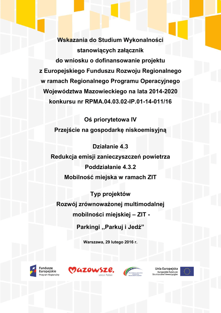 Wskazania do Studium Wykonalności stanowiących załącznik do wniosku o dofinansowanie projektu z Europejskiego Funduszu Rozwoju Regionalnego w ramach Regionalnego Programu Operacyjnego Województwa Mazowieckiego na lata 2014-2020 konkursu nr RPMA.04.03.02-IP.01-14-011/16 Oś priorytetowa IV Przejście na gospodarkę niskoemisyjną Działanie 4.3 Redukcja emisji zanieczyszczeń powietrza Poddziałanie 4.3.2 Mobilność miejska w ramach ZIT Typ projektów Rozwój zrównoważonej multimodalnej mobilności miejskiej – ZIT Parkingi ,,Parkuj i Jedź” Warszawa, 29 lutego 2016 r. 1 z 13 Spis treści rozdział strona 1. Wstęp ......................................................................................................................................... 3 2. Struktura Studium Wykonalności................................................................................................. 4 3. Wstępna analiza projektu ............................................................................................................ 5 4. Wnioski ....................................................................................................................................... 7 5. Definicja celów projektu .............................................................................................................. 7 6 .Identyfikacja projektu .................................................................................................................. 8 7. Analiza wykonalności, analiza popytu oraz analiza opcji ............................................................. 9 8. Analiza finansowa ..................................................................................................................... 10 9. Analiza kosztów i korzyści (analiza ekonomiczna) .................................................................... 11 10. Analiza wrażliwości i ryzyka (tylko dla dużych projektów) ........................................................ 11 11. Analiza instytucjonalna w tym trwałość projektu ...................................................................... 12 12. Analizy specyficzne dla danego rodzaju projektu/sektora ........................................................ 12 13. Pomoc publiczna ..................................................................................................................... 12 14. Analiza oddziaływania na środowisko ..................................................................................... 12 2 z 13 1. Wstęp 1.1. Niniejszy dokument zawiera wskazania przedstawiające sposób przygotowania Studium Wykonalności dla projektów planowanych do realizacji przy wsparciu z Europejskiego Funduszu Rozwoju Regionalnego (EFRR) w ramach Regionalnego Programu Operacyjnego Województwa Mazowieckiego na lata 2014-2020 (RPO WP 2014-2020), które stanowić będzie załącznik do wniosku o dofinansowanie projektu. 1.2. Studium Wykonalności sporządzane jest w celu dokonania analizy i uzasadnienia realizacji planowanego przedsięwzięcia. Przedmiotowy dokument powinien także wykazać, że uzasadnione jest objęcie tego przedsięwzięcia wsparciem w ramach RPO WM 2014-2020. 1.3. W niniejszych wskazaniach przedstawiono strukturę Studium Wykonalności uniwersalną dla różnych typów projektów planowanych do dofinansowania w ramach RPO WM 20142020. Na etapie składania wniosku o dofinansowanie projektu wnioskodawca będzie musiał dostarczyć odpowiedni załącznik do wniosku o dofinansowanie, składający się z następujących elementów: 1.3.1. studium wykonalności, 1.3.2. arkusza kalkulacyjnego w formacie XLS lub równoważnym, zawierającego tabele oraz wyliczenia do analizy finansowej i ekonomicznej. 1.4. Analiza finansowa przedstawiona w ramach Studium Wykonalności powinna zawierać rozdział opisujący przyjęte do wyliczeń założenia, a także rozdział, w którym ujęte zostanie podsumowanie przedstawiające najważniejsze wyniki przeprowadzonej analizy. Dlatego też niezbędnym elementem dostarczanym na etapie składania wniosku będzie arkusz kalkulacyjny, zawierający wszystkie wymagane wyliczenia. Muszą one zawierać jawne (nie ukryte) i działające formuły przedstawiające przeprowadzone analizy i ich wyniki. 1.5. Należy mieć na względzie, że przedmiotowe wskazania przedstawiają jedynie zalecenia w zakresie sporządzania Studium Wykonalności dla projektów składanych w ramach RPO WM 2014-2020. Wnioskodawcy mogą sporządzić dokument o innej strukturze i zawartości, niż zostało to przedstawione we wskazaniach. W takim przypadku należy mieć jednak na względzie konieczność zawarcia w nim wszystkich wskazanych w przedmiotowym dokumencie informacji, a także to, aby zachować zgodność z zawartymi we wskazaniach 3 z 13 założeniami. Niezależnie od tego, czy wnioskodawca sporządzi Studium Wykonalności o strukturze i zawartości w pełni zgodnej z niniejszymi wskazaniami, przy sporządzaniu takiego dokumentu należy mieć na względzie konieczność zachowania zgodności sporządzanego dokumentu z zapisami rozporządzeń i innych aktów prawnych wskazanych w RPO WM 2014-2020, a także z: 1.5.1. Wytycznymi Ministerstwa Infrastruktury i Rozwoju z dnia 18 marca 2015 r. w zakresie zagadnień związanych z przygotowaniem projektów inwestycyjnych, w tym projektów generujących dochód i projektów hybrydowych na lata 2014-2020 (MIiR/H/2014- 2020/7(01)03/2015); 1.5.2. Przewodnikiem do analizy kosztów i korzyści projektów inwestycyjnych (Guide to Cost-benefit Analysis of Investment Project - Economic appraisal tool for Cohesion Policy 2014-2020) Komisji Europejskiej z grudnia 2014 r. 2. Struktura Studium Wykonalności 2.1. Wstępna analiza projektu; 2.2. Wnioski; 2.3. Definicja celów projektu; 2.4. Identyfikacja projektu; 2.5. Analiza wykonalności, analiza popytu oraz analiza opcji; 2.6. Analiza finansowa; 2.7. Analiza kosztów i korzyści (ekonomiczna); 2.8. Analiza wrażliwości i ryzy