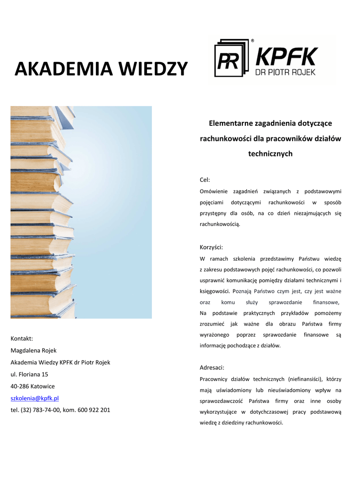 AKADEMIA WIEDZY Elementarne zagadnienia dotyczące rachunkowości dla pracowników działów technicznych Cel: Omówienie zagadnień związanych z podstawowymi pojęciami dotyczącymi rachunkowości w sposób przystępny dla osób, na co dzień niezajmujących się rachunkowością. Korzyści: W ramach szkolenia przedstawimy Państwu wiedzę z zakresu podstawowych pojęć rachunkowości, co pozwoli usprawnić komunikację pomiędzy działami technicznymi i księgowości. Poznają Państwo czym jest, czy jest ważne oraz Na komu podstawie zrozumieć Kontakt: Magdalena Rojek Akademia Wiedzy KPFK dr Piotr Rojek ul. Floriana 15 40-286 Katowice służy wyrażonego jak sprawozdanie finansowe, praktycznych przykładów pomożemy ważne obrazu poprzez dla sprawozdanie Państwa firmy finansowe są informację pochodzące z działów. Adresaci: Pracownicy działów technicznych (niefinansiści), którzy mają uświadomiony lub nieuświadomiony wpływ na [email protected] sprawozdawczość tel. (32) 783-74-00, kom. 600 922 201 wykorzystujące w dotychczasowej pracy podstawową Państwa firmy wiedzę z dziedziny rachunkowości. oraz inne osoby Program szkolenia: 1. Po co komu rachunkowość i podatki? Czyli kto do tego zmusza? Pojęcie, geneza i struktura rachunkowości – jak to rachunkowość zagościła w firmach Przedmiot i metody rachunkowości, – czym i jak się zajmuje się rachunkowość w firmie Funkcje i zadania rachunkowości - komu i do czego służy rachunkowość? 2. Co można znaleźć w bilansie Pojęcie i struktura aktywów przedsiębiorstwa – to co jest po lewej stronie bilansu Pojęcie i struktura pasywów przedsiębiorstwa - to co jest po prawej stronie bilansu Układ bilansu 3. Co można znaleźć w rachunku zysków i strat Treść i układ rachunku zysków i strat Istota operacji wynikowych 4. Jak zapełnić liczbami bilans, czyli skąd się biorą dane? Istota i funkcjonowanie kont bilansowych - czemu służy konto Zasady ewidencji operacji na kontach bilansowych Klasyfikacja kont wynikowych Istota i funkcjonowanie kont wynikowych Zasady ewidencji operacji na kontach wynikowych Rozliczanie kosztów produkcji 5. Krążenie dokumentów w Spółce (ustrojowe) i poza nią (poza ustrojowe) Zasady obiegu dokumentów Kontrola wewnętrzna 6. Czy przy wycenie bilansowej potrzebny jest jubiler Zasady wyceny na koniec roku obrotowego 7. Jak to jest z tymi przychodami i kosztami? Czy lepiej mieć więcej kosztów czy przychodów Przychody i koszty działalności operacyjnej Przychody i koszty pozostałej działalności operacyjnej Przychody i koszty działalności finansowej Zyski i straty nadzwyczajne Obowiązkowe obciążenie wyniku Ustalenie wyniku finansowego 8. Inwentaryzacja wyzwanie nie tylko dla księgowych Zasady i rodzaje inwentaryzacji aktywów i pasywów Metody i terminy inwentaryzacji Ustalanie, rozliczanie i ewidencja różnic inwentaryzacyjnych Prowadzący: Krystian Kubanek – Biegły rewident – Partner w KPFK dr Piotr Rojek. Absolwent Akademii Ekonomicznej im. K. Adamieckiego w Katowicach kierunek rachunkowość. Jest wykładowcą z zakresu rachunkowości oraz rewizji finansowej według przepisów prawa polskiego i Międzynarodowych Standardów Sprawozdawczości Finansowej. Posiada doświadczenie w zakresie badania sprawozdań finansowych według przepisów prawa polskiego, Międzynarodowych Standardów Sprawozdawczości Finansowej oraz zasad grup kapitałowych. Posiada doświadczenie również w przeprowadzaniu procesów prywatyzacyjnych, przygotowywania prospektów emisyjnych oraz doradztwa w zakresie transakcji kapitałowych. Materiały: Uczestnicy szkolenia otrzymają materiały szkoleniowe, które będą wykorzystywane w procesie dydaktycznym. Materiały zostały przygotowane przez wykładowców. Terminy szkoleń: Proponujemy Państwu termin szkolenia 25 października 2011. Miejsce szkolenia: Szkolenie odbędzie się w sali wykładowej w siedzibie KPFK dr Piotr Rojek znajdującej w Katowicach się przy ulicy Floriana 15. Godziny szkolenia: Szkolenie odbywać się będzie od 9 do 15.30. Koszt szkolenia: -390 zł +23% VAT dla jednej osoby - 220 zł +23% VAT dla jednej osoby dla obecnych Klientów KPFK dr Piotr Rojek - 320 zł +23% VAT dla jednej osoby dla Klientów, którzy współpracowali z KPFK dr Piotr Rojek w latach poprzednich - 300 zł +23% VAT dla jednej osoby w przypadku uczestnictwa, co najmniej dwóch osób z jednej firmy Cena obejmuje uczestnictwo w zajęciach, materiały szkoleniowe oraz poczęstunek. Zgłoszenie Przyjęcie zgłoszenia następuje z chwilą otrzymania przez nas wypełnionego formularza z nazwą firmy, numerem NIP oraz danymi personalnymi uczestnika szkolenia. Jest to równoznaczne z przyjęciem warunków oferty. Prosimy o przesłanie formularza zgłoszeniowego na adres mailowy: [email protected] lub listownie z dopiskiem szkolenia na adres: Floriana 15, 40-286 Katowice. Prosimy o przesłanie wypełnionego formularza do 18 października 2011 roku. Potwierdzenie Potwierdzenia zawierające informację o miejscu szkolenia oraz harmonogram zajęć, wysyłamy do uczestników szkolenia najpóźniej na 5 dni przed jego rozpoczęciem, na adres mailowy podany w zgłoszeniu. Jeżeli potwierdzenie ma zostać przesłane do innej niż podana jako uczestnik szkolenia osoby, prosimy zaznaczyć ten fakt w zgłoszeniu. Wpłata Prosimy o dokonanie wpłaty na 7 dni przed rozpoczęciem szkolenia na konto: BRE BANK S.A. 79 1140 1078 0000 4034 9400 1004 Odwołanie szkolenia KPFK dr Piotr Rojek Sp. z o.o. zastrzega sobie prawo do odwołania planowanego szkolenia z przyczyn od siebie niezależnych oraz w przypadku niewystarczającego zainteresowania terminem.