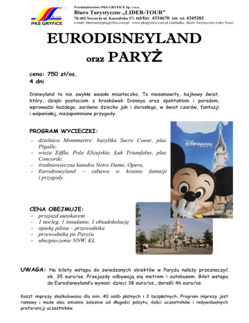 Przedsiębiorstwo PKS GRYFICE Sp. z o.o. Biuro Turystyczne „LIDER-TOUR” 70-402 Szczecin ul. Kaszubska 57; tel/fax 4334670 lub tel. 4345282 e-mail: [email protected] www.pksgryfice.com.pl (zakładka „Biuro Turystyczne Lider Tour) EURODISNEYLAND oraz PARYŻ cena: 750 zł/os. 4 dni Disneyland to nie zwykłe wesołe miasteczko. To niesamowity, bajkowy świat, który, dzięki postaciom z kreskówek Disneya oraz spektaklom i paradom, wprowadzi każdego, zarówno dziecko jak i dorosłego, w świat czarów, fantazji i wspaniałej, niezapomniane przygody. PROGRAM WYCIECZKI: - dzielnica Montmartre: bazylika Sacre Coeur, plac Pigalle, - wieża Eiffla, Pola Elizejskie, Łuk Triumfalny, plac Concorde, - średniowieczna katedra Notre Dame, Opera, - Eurodisneyland – zabawa w krainie fantazji i przygody. CENA OBEJMUJE: - przejazd autokarem - 1 nocleg, 1 śniadanie, 1 obiadokolację - opiekę pilota – przewodnika - przewodnika po Paryżu - ubezpieczenie NNW, KL UWAGA: Na bilety wstępu do zwiedzanych obiektów w Paryżu należy przeznaczyć ok. 35 euro/os. Przejazdy odbywają się metrem i autobusem. Bilet wstępu do Eurodisneyland’u wynosi: dzieci 38 euro/os., dorośli 46 euro/os. Koszt imprezy skalkulowano dla min. 40 osób płatnych i 2 bezpłatnych. Program imprezy jest ramowy i może ulec zmianie zależnie od długości pobytu, ilości uczestników i indywidualnych preferencji uczestników.
