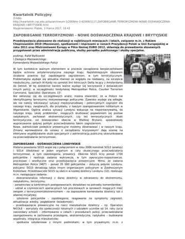 Kwartalnik Policyjny Źródło: http://kwartalnik.csp.edu.pl/kp/archiwum-1/2009/nr-3-42009/1117,ZAPOBIEGANIE-TERRORYZMOWI-NOWE-DOSWIADCZENIAKRAJOWE-I-BRYTYJSKIE.html Wygenerowano: Piątek, 3 marca 2017, 16:43 ZAPOBIEGANIE TERRORYZMOWI – NOWE DOŚWIADCZENIA KRAJOWE I BRYTYJSKIE Przedsięwzięcia planowane do realizacji w najbliższych miesiącach i latach, związane m.in. z Rokiem Chopinowskim 2010 (Mazowsze), spotkaniami i imprezami w ramach Prezydencji Polski w Unii Europejskiej w roku 2011 oraz Mistrzostwami Europy w Piłce Nożnej EURO 2012, skłaniają do prowadzenia stosownych przygotowań przez administrację publiczną, służby porządku publicznego i służby specjalne. podinsp. Rafał Batkowski I Zastępca Mazowieckiego Komendanta Wojewódzkiego Policji W tym kontekście ważnym elementem w procesie zarządzania bezpieczeństwem będzie ochrona antyterrorystyczna naszego kraju. Najistotniejszym obszarem działania powinno być zapobieganie zagrożeniom, w tym terrorystycznym. Problematyka wydaje się aktualna również ze względu na niedawny, na szczęście nieskuteczny, zamach Al-Kaidy na samolot linii lotniczych Delta lecący z Amsterdamu do Detroit. W tej dziedzinie bardzo ważne wydaje się korzystanie z doświadczeń innych policji, w szczególności londyńskiej Metropolitan Police, Counter Terrorism Command, Specialist Operations 151. Nie odnosząc się do szczegółowych analiz, można stwierdzić, że w Polsce nie identyfikujemy terroryzmu motywowanego politycznie. Zjawisko wydaje się odległe, ale nie należy lekceważyć sytuacji międzynarodowej i potencjalnych zagrożeń dla naszego kraju, związanych, dla przykładu, z naszym zaangażowaniem militarnym w Afganistanie. Ogólna analiza sytuacji Londynu wskazuje na nieporównywalną, do naszego kraju, skalę problemów2, mogących skutkować pojawieniem się postaw radykalnych, zachowań ekstremistycznych, czy też terrorystycznych. Ataki terrorystyczne, od dziesięcioleci obecne w Wielkiej Brytanii, spowodowały wypracowanie spójnej polityki przeciwdziałania takim zagrożeniom. Nowe, wartościowe podejście prewencyjne możemy obserwować i w naszym kraju. Zmiany wprowadzone do ustawy o zarządzaniu kryzysowym3 dają szansę na efektywne współdziałanie służb specjalnych z administracją publiczną ukierunkowane na przeciwdziałanie terroryzmowi. ZAPOBIEGANIE – DOŚWIADCZENIA LONDYŃSKIE Historia powstania SO15 wiąże się z połączeniem w roku 2006 komórek SO12 (analizy) i SO14 (śledztwa) w jeden organizm w celu skutecznego przeciwdziałania terroryzmowi, w tym zapobiegania, prewencji. Obecnie SO15 liczy ponad 1700 policjantów i realizuje zadania wykrywcze, w tym operacyjno-rozpoznawcze, procesowe i analityczne oraz przedsięwzięcia prewencyjne. Mimo, że zadania Metropolitan Police (MET) – ponad 35 000 policjantów – dotyczą jedynie Londynu, policjanci SO15 doradzają także innym organizacjom policyjnym w Zjednoczonym Królestwie. Przedstawiciele SO15 są obecni w każdej dzielnicy Londynu (32), realizując m.in. następujące zadania: - zbieranie/analiza informacji z danej dzielnicy w odniesieniu do ekstremizmu, radykalizmu, terroryzmu; - poradnictwo w konkretnych postępowaniach; doradztwo na potrzeby komendantów; - udział w czynnościach operacyjnych lub procesowych w sprawach mogących mieć związek z terroryzmem/ekstremizmem – na zaproszenie komendanta dzielnicy lub z własnej inicjatywy; - szkolenie policjantów – zapobieganie, reagowanie na symptomy zagrożeń, aktualizacja wiedzy, pogłębianie świadomości; - przedsięwzięcia prewencyjne na rzecz mieszkańców dzielnicy – np. Operation NICOLE – warsztaty dla społeczności lokalnych z udziałem uczniów od 14. roku życia (secondary school) – informowanie o celach i procedurach policji, przeciwdziałanie zaangażowaniu w zachowania przestępne, ekstremistyczne, radykalne – budowanie wspólnoty, integracja mieszkańców; - spotkania szkoleniowe z innymi podmiotami, w tym prywatnymi, m.in. z pracownikami sklepów wielkopowierzchniowych, obiektów infrastruktury krytycznej, prywatnych firm ochrony. Przedsięwzięcia antyterrorystyczne (w wymiarze prewencyjnym) koncentrują się także wokół systematycznej analizy informacji – codzienne spotkania/odprawy w SO15 – oraz szczegółowe raportowanie o stanie zagrożeń (diagnoza sytuacji, rozpoznanie, profilowanie organizacji, sprawców, etc…) w ustalonych terminach (co 6 miesięcy). Uzupełnieniem powyższych działań jest antyterrorystyczna „gorąca linia” telefoniczna zapewniająca anonimowość dzwoniącym, która spełnia ważną funkcję prewencyjną. Istotną kwestią jest proaktywna rola Policji, docierającej do administracji lokalnej, przedsiębiorców oraz społeczności poszczególnych dzielnic, inicjującej aktywność w obszarze przeciwdziałania radykalizacji zachowań, głównie młodych ludzi. Program PREVENT wdrożony przez ACPO jest ciekawym przykładem takiej, multiinstytucjonalnej współpracy na rzecz przeciwdziałania terroryzmowi, inspirowanej przez policję, i obejmującej: - wielopodmiotowe partnerstwo w przeciwdziałaniu zagrożeniom; - koncentrację na komunikowaniu społeczności lokalnych, w szczególności muzułmańskich – przeciwdziałanie mitom, stereotypom, dezinformacji; - dialog policji ze społecznościami – informowanie o celach, zadaniach i procedurach policji – budowanie wizerunku prospołecznej formacji; - działania na rzecz asymilacji, przeciwdziałanie wykluczeniu społecznemu etc.; - wsparcie i poradnictwo w zakresie roli społeczności, przewodników duchowych, głównie muzułmańskich, w ramach ich zaangażowania w przeciwdziałanie zagrożeniom; - wsparcie programowe i merytoryczne dla policjantów i komendantów w celu lepszego przeciwdziałania zagrożeniom. Program PREVENT posiada kilka „produktów” – sposobów działania ukierunkowanych na konkretne cele: upowszechnienie programu w ramach dotychc