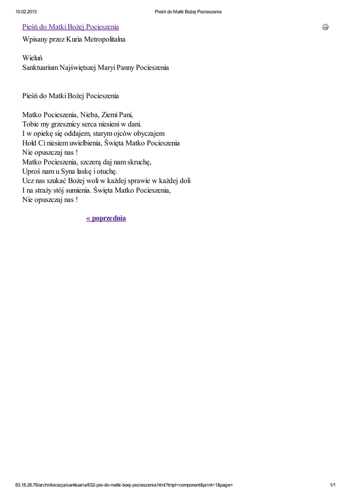 10.02.2013 Pieśń do Matki Bożej Pocieszenia Pieśń do Matki Bożej Pocieszenia Wpisany przez Kuria Metropolitalna Wieluń Sanktuarium Najświętszej Maryi Panny Pocieszenia Pieśń do Matki Bożej Pocieszenia Matko Pocieszenia, Nieba, Ziemi Pani, Tobie my grzesznicy serca niesieni w dani. I w opiekę się oddajem, starym ojców obyczajem Hołd Ci niesiem uwielbienia, Święta Matko Pocieszenia Nie opuszczaj nas ! Matko Pocieszenia, szczerą daj nam skruchę, Uproś nam u Syna łaskę i otuchę. Ucz nas szukać Bożej woli w każdej sprawie w każdej doli I na straży stój sumienia. Święta Matko Pocieszenia, Nie opuszczaj nas ! « poprzednia 83.18.26.76/archidiecezja/sanktuaria/632-pie-do-matki-boej-pocieszenia.html?tmpl=component&print=1&page= 1/1