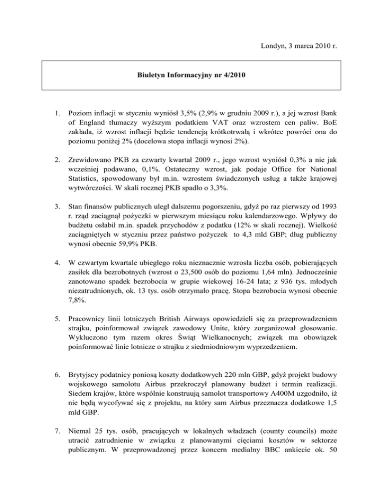 Londyn, 3 marca 2010 r. Biuletyn Informacyjny nr 4/2010 1. Poziom inflacji w styczniu wyniósł 3,5% (2,9% w grudniu 2009 r.), a jej wzrost Bank of England tłumaczy wyższym podatkiem VAT oraz wzrostem cen paliw. BoE zakłada, iż wzrost inflacji będzie tendencją krótkotrwałą i wkrótce powróci ona do poziomu poniżej 2% (docelowa stopa inflacji wynosi 2%). 2. Zrewidowano PKB za czwarty kwartał 2009 r., jego wzrost wyniósł 0,3% a nie jak wcześniej podawano, 0,1%. Ostateczny wzrost, jak podaje Office for National Statistics, spowodowany był m.in. wzrostem świadczonych usług a także krajowej wytwórczości. W skali rocznej PKB spadło o 3,3%. 3. Stan finansów publicznych uległ dalszemu pogorszeniu, gdyż po raz pierwszy od 1993 r. rząd zaciągnął pożyczki w pierwszym miesiącu roku kalendarzowego. Wpływy do budżetu osłabił m.in. spadek przychodów z podatku (12% w skali rocznej). Wielkość zaciągniętych w styczniu przez państwo pożyczek to 4,3 mld GBP; dług publiczny wynosi obecnie 59,9% PKB. 4. W czwartym kwartale ubiegłego roku nieznacznie wzrosła liczba osób, pobierających zasiłek dla bezrobotnych (wzrost o 23,500 osób do poziomu 1,64 mln). Jednocześnie zanotowano spadek bezrobocia w grupie wiekowej 16-24 lata; z 936 tys. młodych niezatrudnionych, ok. 13 tys. osób otrzymało pracę. Stopa bezrobocia wynosi obecnie 7,8%. 5. Pracownicy linii lotniczych British Airways opowiedzieli się za przeprowadzeniem strajku, poinformował związek zawodowy Unite, który zorganizował głosowanie. Wykluczono tym razem okres Świąt Wielkanocnych; związek ma obowiązek poinformować linie lotnicze o strajku z siedmiodniowym wyprzedzeniem. 6. Brytyjscy podatnicy poniosą koszty dodatkowych 220 mln GBP, gdyż projekt budowy wojskowego samolotu Airbus przekroczył planowany budżet i termin realizacji. Siedem krajów, które wspólnie konstruują samolot transportowy A400M uzgodniło, iż nie będą wycofywać się z projektu, na który sam Airbus przeznacza dodatkowe 1,5 mld GBP. 7. Niemal 25 tys. osób, pracujących w lokalnych władzach (county councils) może utracić zatrudnienie w związku z planowanymi cięciami kosztów w sektorze publicznym. W przeprowadzonej przez koncern medialny BBC ankiecie ok. 50 merostw WB deklarowało redukcję etatów o 10%, za główną przyczynę podając zły stan finansów publicznych. 8. Londyńska giełda odnotowała największy od 10 miesięcy spadek kursu funta brytyjskiego, którego wartość wyniosła w trzecim dniu marca mniej niż 1,5 USD. Analitycy uznali, iż przyczyną jest niejasny wynik zbliżających się wyborów parlamentarnych, a w związku z tym trudność określenia metod walki z kryzysem, jakie chcieliby poznać inwestorzy. Od początku roku, wartość funta brytyjskiego w stosunku do dolara spadła o 7%. 9. Ofgem, regulator rynku energii, zwrócił się do firm energetycznych o obniżenie cen dostaw, gdyż tylko ubiegłej zimy przeciętny koszt wzrósł o 40% dla pojedynczego gospodarstwa (największy zanotowany jak dotąd wzrost). Sześć firm, kontrolujących rynek energii: British Gas, Scottish Power, EDF, N-Power, Scottish & Energy i E.ON podniosło w ciągu sezonu średnią cenę dostaw o 30 GBP; w listopadzie ubiegłego roku wynosiła ona 75 GBP, a z końcem lutego br. już 105 GBP. 10. Rządowy plan, by przed upływem 2020 r. wygenerować jedną trzecią energii przy pomocy nadbrzeżnych farm wiatrowych, może nie zostać zrealizowany z powodu zbyt wysokich kosztów. Centrica, sprawująca kontrolę nad British Gas poinformowała, iż jej program budowy 10 tys. nowych turbin wiatrowych u nabrzeży Morza Północnego stoi obecnie pod znakiem zapytania. Jedynie 1% turbin wiatrowych na świecie zlokalizowanych jest na nadmorskich wybrzeżach, z czego połowa umiejscowiona jest na terenie WB. 11. Publiczne media BBC stają przed koniecznością redukcji etatów oraz zmian w zarysie programowym, dzięki któremu zwiększyć się ma oglądalność programów telewizyjnych, lub słuchalność stacji radiowych. BBC zdecydowało o zamknięciu dwóch stacji radiowych oraz zmniejszeniu o 25% zakresu usług, świadczonych przez internetowy dział korporacji – BBC Online. Według szacunków, ok. 600 pracowników straci w wyniku tego zatrudnienie. Plan redukcji etatów spotkał się ze sprzeciwem związków zawodowych, które natychmiast zapowiedziały przeprowadzenie strajku.