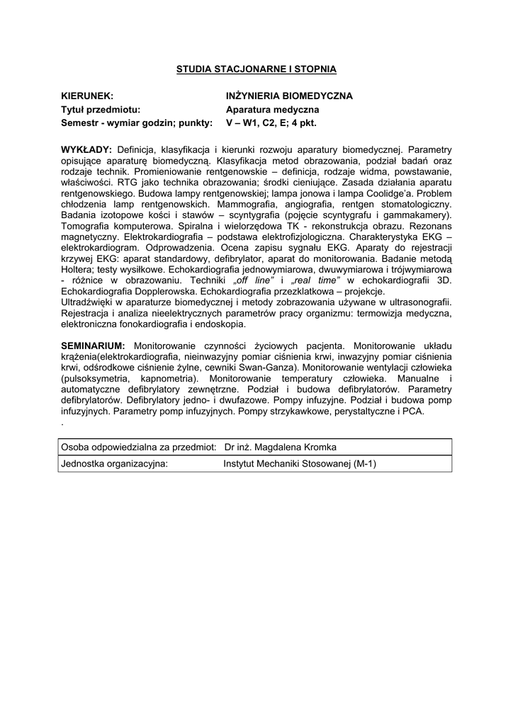 STUDIA STACJONARNE I STOPNIA KIERUNEK: Tytuł przedmiotu: Semestr - wymiar godzin; punkty: INŻYNIERIA BIOMEDYCZNA Aparatura medyczna V – W1, C2, E; 4 pkt. WYKŁADY: Definicja, klasyfikacja i kierunki rozwoju aparatury biomedycznej. Parametry opisujące aparaturę biomedyczną. Klasyfikacja metod obrazowania, podział badań oraz rodzaje technik. Promieniowanie rentgenowskie – definicja, rodzaje widma, powstawanie, właściwości. RTG jako technika obrazowania; środki cieniujące. Zasada działania aparatu rentgenowskiego. Budowa lampy rentgenowskiej; lampa jonowa i lampa Coolidge’a. Problem chłodzenia lamp rentgenowskich. Mammografia, angiografia, rentgen stomatologiczny. Badania izotopowe kości i stawów – scyntygrafia (pojęcie scyntygrafu i gammakamery). Tomografia komputerowa. Spiralna i wielorzędowa TK - rekonstrukcja obrazu. Rezonans magnetyczny. Elektrokardiografia – podstawa elektrofizjologiczna. Charakterystyka EKG – elektrokardiogram. Odprowadzenia. Ocena zapisu sygnału EKG. Aparaty do rejestracji krzywej EKG: aparat standardowy, defibrylator, aparat do monitorowania. Badanie metodą Holtera; testy wysiłkowe. Echokardiografia jednowymiarowa, dwuwymiarowa i trójwymiarowa - różnice w obrazowaniu. Techniki „off line” i „real time” w echokardiografii 3D. Echokardiografia Dopplerowska. Echokardiografia przezklatkowa – projekcje. Ultradźwięki w aparaturze biomedycznej i metody zobrazowania używane w ultrasonografii. Rejestracja i analiza nieelektrycznych parametrów pracy organizmu: termowizja medyczna, elektroniczna fonokardiografia i endoskopia. SEMINARIUM: Monitorowanie czynności życiowych pacjenta. Monitorowanie układu krążenia(elektrokardiografia, nieinwazyjny pomiar ciśnienia krwi, inwazyjny pomiar ciśnienia krwi, odśrodkowe ciśnienie żylne, cewniki Swan-Ganza). Monitorowanie wentylacji człowieka (pulsoksymetria, kapnometria). Monitorowanie temperatury człowieka. Manualne i automatyczne defibrylatory zewnętrzne. Podział i budowa defibrylatorów. Parametry defibrylatorów. Defibrylatory jedno- i dwufazowe. Pompy infuzyjne. Podział i budowa pomp infuzyjnych. Parametry pomp infuzyjnych. Pompy strzykawkowe, perystaltyczne i PCA. . Osoba odpowiedzialna za przedmiot: Dr inż. Magdalena Kromka Jednostka organizacyjna: Instytut Mechaniki Stosowanej (M-1)