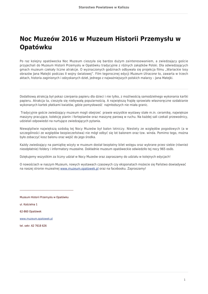 Starostwo Powiatowe w Kaliszu Noc Muzeów 2016 w Muzeum Historii Przemysłu w Opatówku Po raz kolejny opatówecka Noc Muzeum cieszyła się bardzo dużym zainteresowaniem, a zwiedzający goście przyjechali do Muzeum Historii Przemysłu w Opatówku tradycyjnie z różnych zakątków Polski. Dla odwiedzających gmach muzeum czekały liczne atrakcje. O wyznaczonych godzinach odbywała się projekcja filmu „Wariackie losy obrazów Jana Matejki podczas II wojny światowej”. Film tegorocznej edycji Muzeum Utracone to, zawarta w trzech aktach, historia zaginionych i odzyskanych dzieł, jednego z najważniejszych polskich malarzy – Jana Matejki. Dodatkową atrakcją był pokaz czerpania papieru dla dzieci i nie tylko, z możliwością samodzielnego wykonania kartki papieru. Atrakcja ta, cieszyła się niebywałą popularnością. A największą frajdę sprawiało własnoręczne ozdabianie wykonanych kartek płatkami kwiatów, gdzie pomysłowość najmłodszych nie miała granic. Tradycyjnie goście zwiedzający muzeum mogli obejrzeć prawie wszystkie wystawy stałe m.in. ceramikę, największe maszyny pracujące, kolekcję pianin i fortepianów oraz maszynę parową w ruchu. Na każdej sali czekali przewodnicy, udzielali odpowiedzi na nurtujące zwiedzających pytania. Niewątpliwie największą ozdobą tej Nocy Muzeów był balon lotniczy. Niestety ze względów pogodowych (a w szczególności ze względów bezpieczeństwa) nie mógł odbyć się lot balonem oraz tzw. winda. Pomimo tego, można było zobaczyć kosz balonu oraz wejść do jego środka. Każdy zwiedzający na pamiątkę wizyty w muzeum dostał bezpłatny bilet wstępu oraz wybrane przez siebie (również nieodpłatnie) foldery i informatory muzealne. Dokładnie muzeum opatóweckie odwiedziło tej nocy 965 osób. Dziękujemy wszystkim za liczny udział w Nocy Muzeów oraz zapraszamy do udziału w kolejnych edycjach! O nowościach w naszym Muzeum, nowych wystawach czasowych czy eksponatach możecie się Państwo dowiadywać na naszej stronie muzealnej www.muzeum.opatowek.pl oraz na facebooku. Zapraszamy! ------------------------------------------------------------Muzeum Historii Przemysłu w Opatówku ul. Kościelna 1 62-860 Opatówek www.muzeum.opatowek.pl tel. sekr. 62 7618 626 1