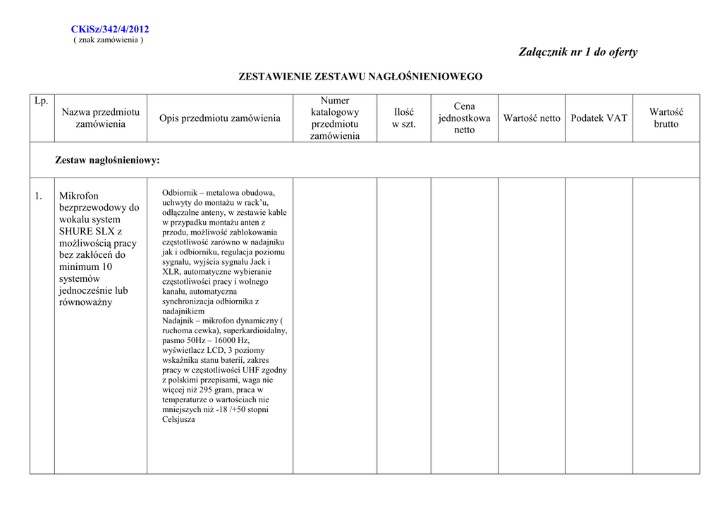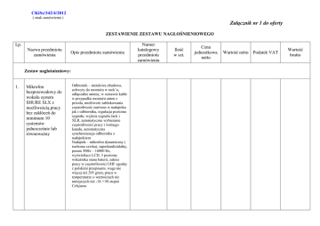 CKiSz/342/4/2012 ( znak zamówienia ) Załącznik nr 1 do oferty ZESTAWIENIE ZESTAWU NAGŁOŚNIENIOWEGO Lp. Nazwa przedmiotu zamówienia Opis przedmiotu zamówienia Zestaw nagłośnieniowy: 1. Mikrofon bezprzewodowy do wokalu system SHURE SLX z możliwością pracy bez zakłóceń do minimum 10 systemów jednocześnie lub równoważny Odbiornik – metalowa obudowa, uchwyty do montażu w rack’u, odłączalne anteny, w zestawie kable w przypadku montażu anten z przodu, możliwość zablokowania częstotliwość zarówno w nadajniku jak i odbiorniku, regulacja poziomu sygnału, wyjścia sygnału Jack i XLR, automatyczne wybieranie częstotliwości pracy i wolnego kanału, automatyczna synchronizacja odbiornika z nadajnikiem Nadajnik – mikrofon dynamiczny ( ruchoma cewka), superkardioidalny, pasmo 50Hz – 16000 Hz, wyświetlacz LCD, 3 poziomy wskaźnika stanu baterii, zakres pracy w częstotliwości UHF zgodny z polskimi przepisami, waga nie więcej niż 295 gram, praca w temperaturze o wartościach nie mniejszych niż -18 /+50 stopni Celsjusza Numer katalogowy przedmiotu zamówienia Ilość w szt. Cena jednostkowa netto Wartość netto Podatek VAT Wartość brutto 2. 3. System bezprzewodowy z mikrofonem nagłownym do wokalu SHURE PGX (komplet) z możliwością pracy do minimum 6 systemów jednocześnie, bezzakłóceniowo współpracujący z mikrofonami z pozycji nr 1 lub równoważny Odbiornik – wskaźnik LED obecności zasilania i wyczerpującej się baterii, wyjścia Jack i XLR, 2 anteny, automatyczny wybór częstotliwości, automatyczna synchronizacja z nadajnikiem, zakres działania minimum 80m Nadajnik – typ body pack wskaźnik LED stanu zasilania i baterii, przełącznik zasilania i wyciszania, zasięg roboczy min 80m Przenośny zestaw nagłośnieniowy ALTO OEX-400 lub równoważny Przenośny zestaw nagłośnieniowy o mocy RMS nie mniejszej niż 280W/4 Ohm, składający się z 2 kolumn pasywnych oraz miksera ze wzmacniaczem mocy, zabezpieczenia termiczne, mikser minimum 4 kanały wejściowe mikrofonowe i 2 stereo liniowe, odrębne wejście dla odtwarzaczy audio, regulacja barwy 2 stopniowa na kanałach wejściowych, equalizer graficzny na sumie, wbudowany cyfrowy procesor efektów, wyjście monitorowe, głośniki dwudrożne, minimum 8” + 1”, moc minimum 130W AES, 8 Ohm, max SPL nie mniej niż 116 dB, w zestawie 2 x kabel głośnikowy minimum 10m. Zestaw z fabryczną możliwością złożenia kolumn i miksera w jedną całość. RAZEM Mikrofon nagłowny do wokalu, kardioidalny, dynamiczny, pasmo przenoszenia 60Hz do 18 KHz.