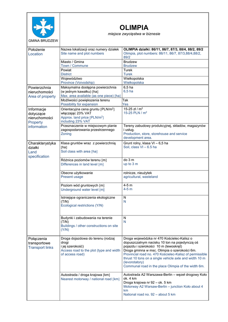 GMINA OLIMPIA miejsce zwycięstwa w biznesie GMINA BRUDZEW Położenie Location Powierzchnia nieruchomości Area of property Informacje dotyczące nieruchomości Property information Charakterystyka działki Land specification Połączenia transportowe Transport links Nazwa lokalizacji oraz numery działek Site name and plot numbers Miasto / Gmina Town / Commune Powiat District Województwo Province (Voivodship) Maksymalna dostępna powierzchnia (w jednym kawałku) ha Max. area available (as one piece) ha Możliwości powiększenia terenu Possibility for expansion Orientacyjna cena gruntu PLN/m2 włączając 23% VAT Approx. land price PLN/m2 including 23% VAT Przeznaczenie w miejscowym planie zagospodarowania przestrzennego Zoning OLIMPIA działki: 86/11, 86/7, 87/3, 88/4, 88/2, 89/2 Olimpia, plot numbers: 86/11, 86/7, 87/3,88/4,88/2, 89/2 Brudzew Brudzew Turek Turek Wielkopolska Wielkopolska 6,5 ha 6,5 ha Tak Yes 15-25 zł / m2 15-25 PLN / m2 Tereny zabudowy produkcyjnej, składów, magazynów i usług. Production, store, storehouse and service development area. Klasa gruntów wraz z powierzchnią ha Soil class with area ha Grunt rolny, klasa VI – 6,5 ha Soil, class VI – 6.5 ha Różnica poziomów terenu m Differences in land level m do 3 m up to 3 m Obecne użytkowanie Present usage rolnicze, nieużytek agricultural, wasteland Poziom wód gruntowych m Underground water level m] 4-5 m 4-5 m Istniejące ograniczenia ekologiczne (T/N) Ecological restrictions (Y/N) N N Budynki i zabudowania na terenie (T/N) Buildings / other constructions on site (Y/N) N N Droga dojazdowa do terenu (rodzaj drogi i jej szerokość) Access road to the plot (type and width of access road) Droga wojewódzka nr 470 Kościelec-Kalisz o dopuszczalnym nacisku 10 ton na pojedynczą oś pojazdu i szerokości 10 m (lewoskręt) Droga gminna w msc. Olimpia o szerokości 6m. Provincial road no. 470 Kościelec-Kalisz of permissible thrust 10 tons on a single vehicle axle and width 10 m (levorotatory) Communal road in the place Olimpia of the width 6m. Autostrada / droga krajowa km Nearest motorway / national road km Autostrada A2 Warszawa-Berlin – węzeł drogowy Koło ok. 4 km Droga krajowa nr 92 – ok. 5 km Motorway A2 Warsaw-Berlin – junction Koło about 4 km National road no. 92 – about 5 km Porty rzeczne i morskie w odległości do 200 km Sea and river ports located up to 200 km Istniejąca infrastruktura Existing infrastructure Kolej km Railway line km Koło ok. 12 km Koło about 12 km Bocznica kolejowa km Railway siding km Koło ok. 12 km Koło about 12 km Najbliższe lotnisko międzynarodowe km Nearest international airport km Łódź – ok. 85km Poznań – ok. 125 km Warszawa ok. 185 km Łódź – about 85km Poznań – about 125 km Warsaw about 185 km Elektryczność na terenie (T/N) Electricity (Y/N) T Y Odległość przyłącza od granicy terenu Connection point (distance from boundary) m Gaz na terenie (T/N) Gas (Y/N) Odległość przyłącza od granicy działki Connection point (distance from boundary) m Woda na terenie (T/N) Water supply (Y/N) Odległość przyłącza od granicy terenu Connection point (distance from boundary) m Kanalizacja na terenie (T/N) Sewage discharge (Y/N) Odległość przyłącza od granicy terenu Connection point (distance from boundary) m Telefony (T/N) Telephone (Y/N) Odległość przyłącza od granicy terenu Connection point (distance from boundary) m Osoby do kontaktu Contact person Bydgoszcz – ok. 145 km Bydgoszcz – about 145 km W granicach terenu – SN15kV Within the borders of the site – SN 15kV. T Y Ok. 150m gazociąg wysokiego ciśnienia DN700 Gustorzyn – Odolanów . About 150m gas pipe of high pressure DN700 Gustorzyn – Odolanów. T Y przy granicy terenu next to the boundary of the site N N Możliwość przyłącza ok. 5km lub budowa lokalnej oczyszczalni ścieków współfinansowana przez Gminę Possibility of connection point about 5km or construction of local sewage treatment plant cofinanced by the Commune T Y Przy granicy terenu Next to the boundary of the site Dominika Kaszyńska-Fisiak, Z-ca Kierownika Referatu Inwestycji i Ochrony Środowiska, tel. 63 279 83 43, tel. kom. 607820405, e-mail: [email protected] Dominika Kaszyńska-Fisiak, Associate Manager of the Investment and Environmental Protection Department, tel. 63 279 83 45, mobile 607820405, e-mail: [email protected]
