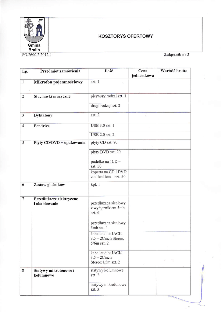 KOSZTORYS OFERTOWY Gmina Bralin z^l^czniknr 3 so.2600.2.2012.1 Lp. przedmiot zamórvienia ceDa jedno§tkowa Ilość 1 Mikrofon pojemnościowy szt, 2 słucharvki muzyczne pienvszy rodzaj 1 sź, l drugi rodzaj sź. 2 ,] Dyktafony 4 sź.2 I ]sR 3.0 sź. ] USB 2,0 5 Pł}.ty cD/D\aD + opakorvania sz1. 2 płyty CD sź. 80 pbĄ DVD sń. 20 pudełko na lCD szt,50 koperta na CD i DVD z okienkienr szt. 50 6 Zestaw głośników 7 Przedlużacze elektryczne i okablowanie kpl. 1 pżedlożacz sieciowy z wyłącznikien 5mb sń.6 przedłużaczsieciowy 5mb sź-,l kabel audio: 3,5 5l6m sż.2 kabel audio: 3.5 JACK 2cinch Steleo: 2cinch JACK Steręo:],5m sź. 2 8 stĄ§\łT mikrofonowe i kolumnorye statywy kolumnowe sń.2 starywy mikofonowe sź, 3 wartośćbrutto stałlły mikrofonowe do studia radiowego śżt-2 9 Materialy ek§ploatacyine kolorowv toner sź, 3 czarny toner 10 Reflektory, strobo§koP, śtaĘ,w+ rampa sź, l stroboskopy sź, 2 .eflektorv LED sź, 4 statyw + rampa oświetleniowa szt- ll Komputer z oprogranowarriem i ni€zbędnym [D,K.] ospr:Żęt€m sź. ] ]
