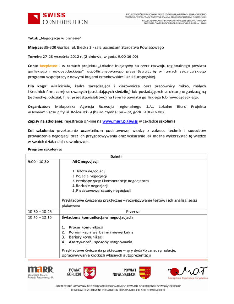 Tytuł: „Negocjacje w biznesie” Miejsce: 38-300 Gorlice, ul. Biecka 3 - sala posiedzeń Starostwa Powiatowego Termin: 27-28 września 2012 r. (2-dniowe, w godz. 9.00-16.00) Cena: bezpłatne - w ramach projektu „Lokalne inicjatywy na rzecz rozwoju regionalnego powiatu gorlickiego i nowosądeckiego” współfinansowanego przez Szwajcarię w ramach szwajcarskiego programu współpracy z nowymi krajami członkowskimi Unii Europejskiej. Dla kogo: właściciele, kadra zarządzająca i kierownicza oraz pracownicy mikro, małych i średnich firm, zarejestrowanych (posiadających siedzibę) lub posiadających strukturę organizacyjną (jednostkę, oddział, filię, przedstawicielstwo) na terenie powiatu gorlickiego lub nowosądeckiego. Organizator: Małopolska Agencja Rozwoju regionalnego S.A., Lokalne w Nowym Sączu przy ul. Kościuszki 9 (biuro czynne: pn – pt, godz. 8.00-16.00). Biuro Projektu Zapisy na szkolenie: rejestracja on-line na www.marr.pl/swiss w zakładce szkolenia Cel szkolenia: przekazanie uczestnikom podstawowej wiedzy z zakresu technik i sposobów prowadzenia negocjacji oraz ich przygotowywania oraz wskazanie jak można wykorzystać tę wiedze w swoich działaniach zawodowych. Program szkolenia: Dzień I ABC negocjacji 9:00 - 10:30 1. Istota negocjacji 2. Pojęcie negocjacji 3. Predyspozycje i kompetencje negocjatora 4. Rodzaje negocjacji 5. P odstawowe zasady negocjacji 10:30 – 10:45 10:45 – 12:15 Przykładowe ćwiczenia praktyczne – rozwiązywanie testów i ich analiza, sesja plakatowa Przerwa Świadoma komunikacja w negocjacjach 1. 2. 3. 4. Proces komunikacji Komunikacja werbalna i niewerbalna Bariery komunikacji Asertywność i sposoby ustępowania Przykładowe ćwiczenia praktyczne – gry dydaktyczne, symulacje, opracowywanie krótkich własnych autoprezentacji 12:15 – 12:45 12:45 – 14:15 przerwa Świadoma komunikacja w negocjacjach c.d. 5. Prezentacja i autoprezentacja Proces negocjacji kluczem do skutecznej sprzedaży 1. 2. 3. 4. Profesjonalny cykl sprzedaży Etapy procesu sprzedaży Prezentacja oferty Warunki skutecznej informacji 14:15 – 14:30 Przykładowe ćwiczenia praktyczne - ćwiczenia w prezentowaniu oferty i prowadzeniu rozmowy sprzedażowej, opracowywanie bazy pytań, symulacja różnych metod uchylania zastrzeżeń. przerwa 14:30 – 16:00 Proces negocjacji kluczem do skutecznej sprzedaży c.d. 1. Dostosowanie procesu negocjacji handlowych do osobowości partnera 2. Rola i rodzaje pytań 3. Aktywne słuchanie Dzień II 9:00 - 10:30 Proces negocjacji kluczem do skutecznej sprzedaży c.d. 4. Kategorie zastrzeżeń klienta 5. Metody uchylania zastrzeżeń 6. Techniki zamknięcia negocjacji handlowych 10:30 - 10:45 10:45 – 12:15 Przerwa Przebieg negocjacji 1. Proces przygotowania negocjacji 2. Fazy negocjacji 3. Style negocjacji 12:15 – 12:45 12:45 – 14:15 14:15 – 14:30 przerwa Przebieg negocjacji c.d. 4. Taktyki negocjacyjne 5. Praktyczne stosowanie technik negocjacyjnych Przykładowe ćwiczenia praktyczne – przeprowadzenie gry dydaktycznej „Giganci negocjacji”, prowadzenie symulowanych negocjacji w różnych technikach. przerwa 14:30 – 16:00 Sytuacje trudne w negocjacjach 1. Błędy negocjacyjne 2. Emocje w procesie negocjacji 3. Podstępne taktyki negocjacyjne Przykładowe ćwiczenia praktyczne – studium przypadku, analiza sytuacji stresujących. W ramach szkolenia MARR S.A. zapewnia materiały szkoleniowe, zaświadczenia o ukończeniu szkolenia, zaświadczenia o uzyskanej pomocy de minimis oraz catering. TRENER: Dorota Koptiew Posiada 16-letnie doświadczenie prowadzenia szkoleń w zakresie, m.in. zarządzania firmą, marketingu, kadr i płac, tworzenia biznes planów, sprzedaży, negocjacji. Posiada wykształcenie ekonomiczne (mgr ekonomii AE w Krakowie). Od 2006 roku prowadzi własną firmę edukacyjnodoradczą. Ponadto od 1996 roku współpracuje z Tarnowską Agencją Rozwoju Regionalnego S.A., jako trener-wykładowca Tarnowskiej Szkoły Biznesu, Wszechnicy Edukacyjnej, a od 2000 roku jest wykładowcą Państwowej Wyższej Szkoły Zawodowej w Tarnowie. Współautorka książki „ABC Przedsiębiorcy – od pomysłu do biznesu” (Tarnów – 2002). Doradca w zakresie opracowywania biznes planu, rozwoju biznesu i rozpoczynania działalności gospodarczej. Trener Krajowego Systemu Usług dla Małych i Średnich Przedsiębiorstw. TRENER: Maria Wantuch Posiada 18-letnie doświadczenie prowadzenia szkoleń w zakresie, m.in. zarządzania firmą, marketingu, kadr i płac, tworzenia biznes planów, sprzedaży, negocjacji. Posiada wykształcenie ekonomiczne (mgr ekonomii AE w Krakowie). Od 2006 roku prowadzi własną firmę edukacyjnodoradczą. Ponadto od 1996 roku współpracuje z Tarnowską Agencją Rozwoju Regionalnego S.A., jako trener-wykładowca Tarnowskiej Szkoły Biznesu, Wszechnicy Edukacyjnej, a od 2001 roku jest starszym asystentem Państwowej Wyższej Szkoły Zawodowej w Tarnowie. Współautorka książki „ABC Przedsiębiorcy – od pomysłu do biznesu” (Tarnów – 2002). Doradca w zakresie opracowywania biznes planu, rozwoju biznesu i rozpoczynania działalności gospodarczej. Trener Krajowego Systemu Usług dla Małych i Średnich Przedsiębiorstw. Liczba miejsc ograniczona, decyduje kolejność zgłoszeń! Pytania? Tel. 18 262 12 76 Zapisz się już dziś www.marr.pl/swiss