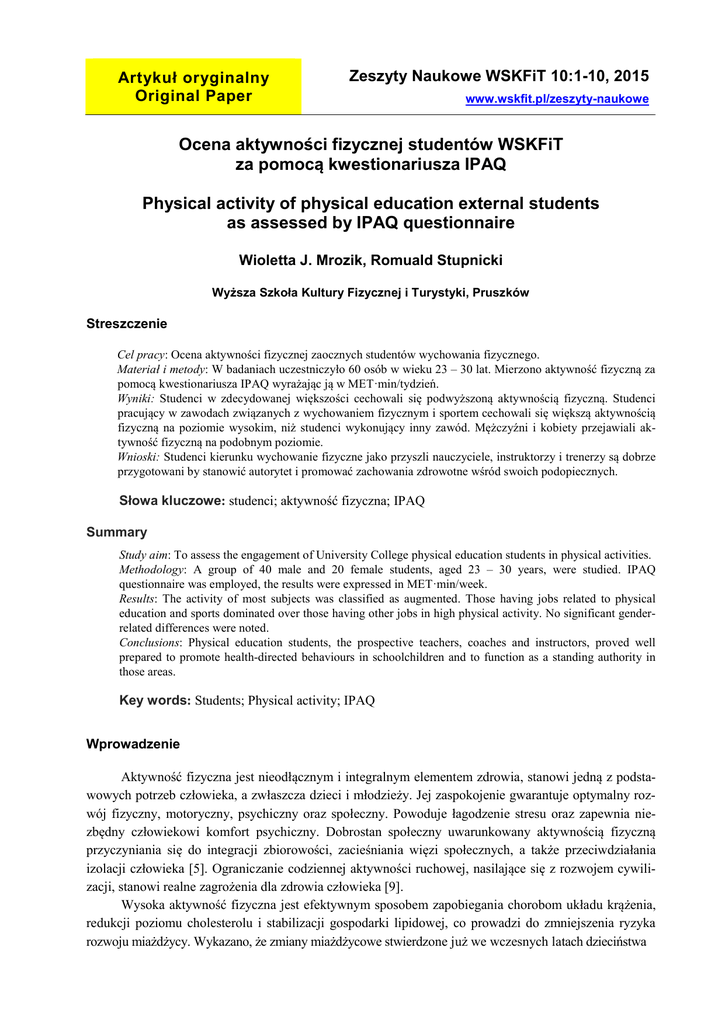 Artykuł oryginalny Original Paper Zeszyty Naukowe WSKFiT 10:1-10, 2015 www.wskfit.pl/zeszyty-naukowe Ocena aktywności fizycznej studentów WSKFiT za pomocą kwestionariusza IPAQ Physical activity of physical education external students as assessed by IPAQ questionnaire Wioletta J. Mrozik, Romuald Stupnicki Wyższa Szkoła Kultury Fizycznej i Turystyki, Pruszków Streszczenie Cel pracy: Ocena aktywności fizycznej zaocznych studentów wychowania fizycznego. Materiał i metody: W badaniach uczestniczyło 60 osób w wieku 23 – 30 lat. Mierzono aktywność fizyczną za pomocą kwestionariusza IPAQ wyrażając ją w MET·min/tydzień. Wyniki: Studenci w zdecydowanej większości cechowali się podwyższoną aktywnością fizyczną. Studenci pracujący w zawodach związanych z wychowaniem fizycznym i sportem cechowali się większą aktywnością fizyczną na poziomie wysokim, niż studenci wykonujący inny zawód. Mężczyźni i kobiety przejawiali aktywność fizyczną na podobnym poziomie. Wnioski: Studenci kierunku wychowanie fizyczne jako przyszli nauczyciele, instruktorzy i trenerzy są dobrze przygotowani by stanowić autorytet i promować zachowania zdrowotne wśród swoich podopiecznych. Słowa kluczowe: studenci; aktywność fizyczna; IPAQ Summary Study aim: To assess the engagement of University College physical education students in physical activities. Methodology: A group of 40 male and 20 female students, aged 23 – 30 years, were studied. IPAQ questionnaire was employed, the results were expressed in MET·min/week. Results: The activity of most subjects was classified as augmented. Those having jobs related to physical education and sports dominated over those having other jobs in high physical activity. No significant genderrelated differences were noted. Conclusions: Physical education students, the prospective teachers, coaches and instructors, proved well prepared to promote health-directed behaviours in schoolchildren and to function as a standing authority in those areas. Key words: Students; Physical activity; IPAQ Wprowadzenie Aktywność fizyczna jest nieodłącznym i integralnym elementem zdrowia, stanowi jedną z podstawowych potrzeb człowieka, a zwłaszcza dzieci i młodzieży. Jej zaspokojenie gwarantuje optymalny rozwój fizyczny, motoryczny, psychiczny oraz społeczny. Powoduje łagodzenie stresu oraz zapewnia niezbędny człowiekowi komfort psychiczny. Dobrostan społeczny uwarunkowany aktywnością fizyczną przyczyniania się do integracji zbiorowości, zacieśniania więzi społecznych, a także przeciwdziałania izolacji człowieka [5]. Ograniczanie codziennej aktywności ruchowej, nasilające się z rozwojem cywilizacji, stanowi realne zagrożenia dla zdrowia człowieka [9]. Wysoka aktywność fizyczna jest efektywnym sposobem zapobiegania chorobom układu krążenia, redukcji poziomu cholesterolu i stabilizacji gospodarki lipidowej, co prowadzi do zmniejszenia ryzyka rozwoju miażdżycy. Wykazano, że zmiany miażdżycowe stwierdzone już we wczesnych latach dzieciństwa 2 Aktywność fizyczna zaocznych studentów WF mogą być przyczyną jej rozwoju w życiu dorosłym. Sedentarny tryb życia upowszechniający się w coraz liczniejszych grupach społecznych zwiększa dwukrotnie ryzyko wystąpienia choroby wieńcowej a także udarów mózgu, nadciśnienia tętniczego, otyłości i cukrzycy typu 2. Redukcja tej ostatniej przypadłości jest możliwa nawet o 30% poprzez systematyczne ćwiczenia ruchowe. Liczne piśmiennictwo wskazuje również na pozytywną korelację między umiarkowanym wysiłkiem fizycznym o długości 30 – 60 minut na dobę a ryzykiem zachorowania na nowotwory. Daną zależność potwierdzono np. porównawczymi badaniami na studentkach uprawiających sport i na ich rówieśniczkach preferujących siedzący tryb życia. Stwierdzono, że aktywność fizyczna w wieku młodzieńczym u dziewcząt wpływa istotnie na obniżenie ryzyka rozwoju raka piersi, macicy i jajników [7,10]. Badania przeprowadzone przez WHO wykazały, że Polacy należą do najmniej aktywnych fizycznie społeczeństw europejskich. Zaledwie co dziesiąta dorosła osoba w naszym kraju wykonuje systematyczne ćwiczenia fizyczne, zaś około 70% kobiet i mężczyzn prowadzi siedzący, szkodliwy dla zdrowia tryb życia. Niestety, podobnie jak w populacji dorosłych, wśród młodzieży coraz częściej obserwuje się niską aktywność fizyczną i bierny sposób spędzania wolnego czasu. Wraz z wiekiem wzrasta odsetek młodzieży mało aktywnej ruchowo. Uczniowie spędzają więcej czasu przed telewizorem bądź przy komputerze, niż na zorganizowanych zajęciach sportowych bądź innych formach aktywności fizycznej [9]. W przekrojowe badania aktywności fizycznej angażuje się coraz więcej ośrodków naukowych starających się stale poszerzać wachlarz stosowanych metod. W badaniach przesiewowych oceniających aktywność fizyczną dużych populacji stosuje się przede wszystkim różnego rodzaju kwestionariusze. Obecnie do najczęściej wymienianych i stosowanych na świecie należy kwestionariusz IPAQ (International Physical Activity Questionnaire) [2,11], szacujący tzw. ogólną aktywność fizyczną wyrażaną w MET·min/tydzień (jeden MET oznacza spoczynkowy wydatek energetyczny przy założeniu zużycia tlenu 3.5 ml/min/kg masy ciała). Rejestruje się 3 rodzaje wysiłków – lekkie (chodzenie), umiarkowane (z nieco wzmożonym oddychaniem i nieco przyspieszoną akcją serca) aktywność intensywne (z silnie wzmożonym oddychaniem i przyspieszoną akcją serca). Notuje się czas poświęcony w ostatnim tygodniu na poszczególne rodzaje aktywności, przy czym pod uwagę bierze się jedynie wysiłki trwające jednorazowo przynajmniej 10 minut. Celem studiów wychowania fizycznego jest zdobycie wiedzy i opanowanie umiejętności pozwalających na skuteczne organizowanie i kierowanie procesem kształcenia i wychowania fizycznego. Z kolei, jednym z podstawowyc