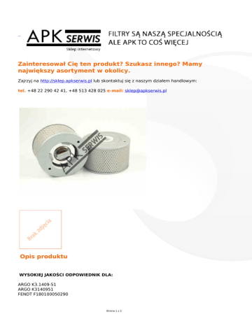 Zainteresował Cię ten produkt? Szukasz innego? Mamy największy asortyment w okolicy. Zajrzyj na http://sklep.apkserwis.pl lub skontaktuj się z naszym działem handlowym: tel. +48 22 290 42 41, +48 513 428 025 e-mail: [email protected] Opis produktu WYSOKIEJ JAKOŚCI ODPOWIEDNIK DLA: ARGO K3.1409-51 ARGO K3140951 FENDT F180100050290 Strona 1 z 2 FENDT F180100050280 Strona 2 z 2