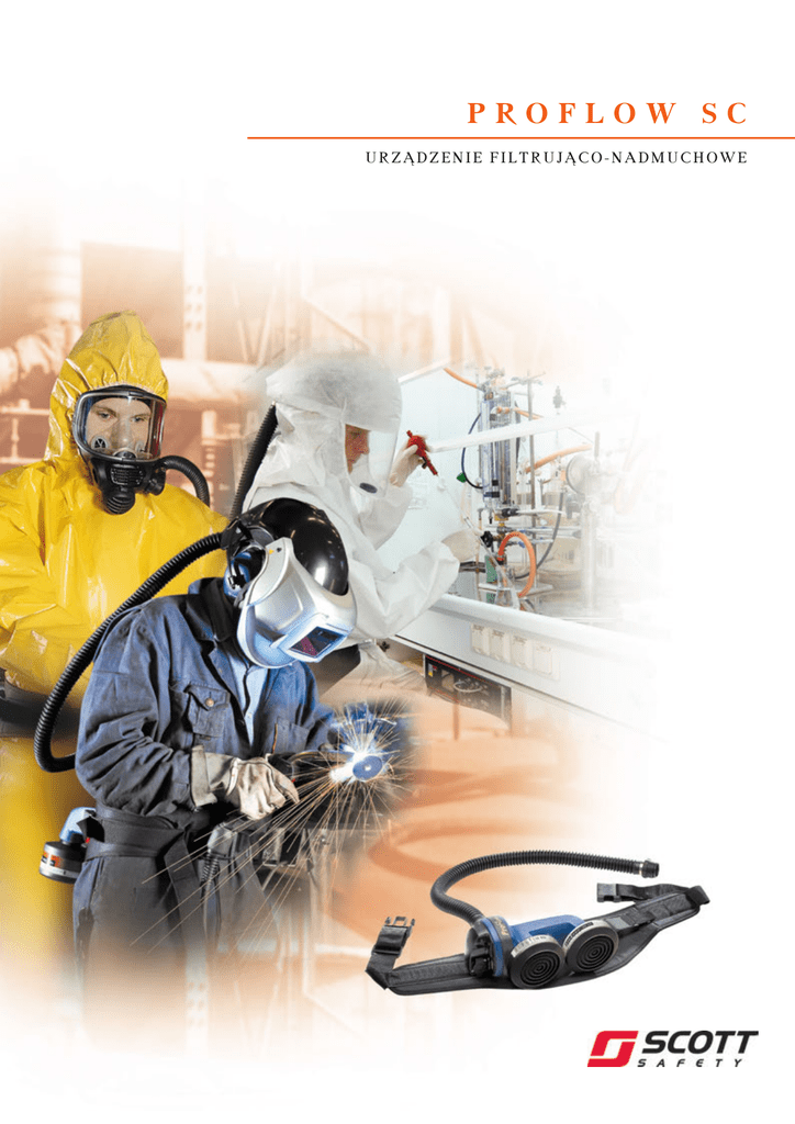 PROFLOW SC URZÑDZENIE FILTRUJÑCO-NADMUCHOWE Wi´ksza elastycznoÊç – Zwi´kszona ochrona – Ró˝norodnoÊç zastosowaƒ PROFLOW SC Kompletny system ochrony dróg oddechowych firmy Scott Health & Safety Proflow SC reprezentuje najnowszà generacj´ urzàdzeƒ filtrujàco-nadmuchowych. Dzi´ki technologicznym udoskonaleniom ten inteligentny i prosty w obs∏udze sprz´t jest najnowoczeÊniejszy w serii Proflow. Lekka, kompaktowa i ergonomiczna konstrukcja z wyprofilowanà p∏aszczyznà zapewniajà u˝ytkownikowi komfort pracy przez d∏ugi czas. Szeroki wybór cz´Êci twarzowych zapewnia ogromnà gam´ zastosowaƒ urzàdzenia. Wyjàtkowy trzyletni okres gwarancji na zespó∏ nadmuchowy potwierdza wiarygodnoÊç i solidnoÊç wykonania urzàdzeƒ Proflow SC. Inteligencja • Elektroniczny regulator przep∏ywu powietrza utrzymuje jego sta∏y dop∏yw, automatycznie wyrównujàc zmiany w oporach filtrów. • Wbudowany system zapisywania danych dostarcza wiarygodnych i ∏atwych do Êciàgni´cia informacji na temat serwisowania urzàdzenia. • Unikalna gwarancja na zespó∏ nadmuchowy na okres 3 lat lub 1800 godzin (gwarancja na bateri´ wynosi jeden rok). Monitorowanie wydajnoÊci • System alarmowy zapewnia bezpieczeƒstwo pracy. • Widoczny dla u˝ytkownika wyÊwietlacz cyfrowy na bie˝àco wskazuje stan na∏adowania baterii oraz stan zape∏nienia filtrów. Sygna∏ dêwi´kowy informuje o koniecznoÊci na∏adowania baterii lub wymianie filtrów. • Od 7 do15 godzin u˝ytkowania po jednorazowym na∏adowaniu (w zale˝noÊci od zastosowanej kombinacji filtrów / cz´Êci twarzowej.) UniwersalnoÊç i ró˝norodnoÊç zastosowaƒ • Szeroki wybór cz´Êci twarzowych zapewnia ró˝norodnoÊç zastosowaƒ urzàdzenia. • Pe∏na gama filtrów i filtropoch∏aniaczy w tym: PSL, APSL, BPSL, ABPSL, ABEPSL, ABEKPSL oraz ABEKHgPSL. 2 Proste serwisowanie • Brak koniecznoÊci kalibracji i konserwacji urzàdzenia przez u˝ytkownika. • System elektroniczny umo˝liwia przeprowadzanie okresowych przeglàdów w autoryzowanych punktach serwisowych oraz zapewnia dok∏adne informacje o przesz∏ym u˝ytkowaniu urzàdzenia. Niskie koszty u˝ytkowania • Wytrzyma∏a konstrukcja i wysoko wydajne materia∏y gwarantujà d∏ugi okres u˝ytkowania. • Odporna na wod´ obudowa u∏atwia dezynfekcj´. Ciàg∏a gotowoÊç do pracy • Zintegrowana bateria jest umieszczona i pozostaje bezpiecznie w obudowie urzàdzenia nawet podczas ∏adowania. • Lekka i szybko ∏adujàca si´ bateria NiHM. • Inteligentna ∏adowarka wskazuje poziom na∏adowania baterii i prze∏àcza si´ w stan ciàg∏ego do∏adowywania, dzi´ki czemu w pe∏ni na∏adowana bateria mo˝e pozostaç pod∏àczona w trybie standby. • Os∏oniony przycisk ON/OFF uniemo˝liwia przypadkowe wy∏àczenie urzàdzenia. DANE TECHNICZNE Przep∏yw powietrza: Minimum 120 l/min, dostosowywany automatycznie. Dmuchawa automatycznie wyrównuje opory przep∏ywu spowodowane zapychaniem si´ filtrów, ich wi´kszym oporem lub zwi´kszonym tempem pracy. Bateria: Wielokrotnego ∏adowania, PF NiMH 9.6V/standard, opcjonalnie PF NiMH 9.6V/power. Czas dzia∏ania 7-15 godzin po jednorazowym na∏adowaniu (w zale˝noÊci od zastosowanej kombinacji baterii: filtrów / cz´Êci twarzowej). ¸adowarka: Czas ∏adowania: 6 godzin, automatyczne do∏adowywanie. Wskaênik stanu Cyfrowy wyÊwietlacz stanu baterii (A) oraz stanu zablokowania filtrów (P). Sygna∏ urzàdzenia: dêwi´kowy informujàcy o wy∏adowanej baterii (czas dzia∏ania po ostrze˝eniu to oko∏o 15 minut.) Ci´˝ar urzàdzenia 1,4 kg bez filtrów: Poziom dêwi´ku: < 70 dB Zakres temperatur: -10 C … + 50 C Temperatura przy Zalecana temperatura ∏adowania: oko∏o +20 C. ∏adowaniu: Stopieƒ ochrony IP: IP54S IEC 60529 3 CZ¢ÂCI TWARZOWE TH2 HE¸MY I KAPTURY PROCAP AUTOMASK He∏m Procap z doprowadzeniem powietrza zapewnia ochron´ dróg oddechowych, g∏owy, twarzy, oczu i opcjonalnie s∏uchu. Procap zbudowany jest z solidnej, wykonanej z ˝aroodpornego poliamidu skorupy, wi´êby z pokr´t∏em regulacji rozmiaru, wygodnego uszczelnienia wokó∏ twarzy oraz równoleg∏ych prowadnic wizjera. • Dost´pne sà wizjery chroniàce przed uderzeniami, blaskiem, goràcem i promieniowaniem podczerwonym. • Przegubowe pod∏àczenie w´˝a podajàcego powietrze do cz´Êci twarzowej gwarantuje swobod´ ruchów. Uznanie CE: EN 12941 TH2. EN 397. EN 166/169. EN 175. EN 352-3. Lekka, wygodna i uniwersalna os∏ona twarzy. • Wytrzyma∏a oprawa z polietylenu i wykonany z acetatu wizjer pokryty niezaparowujàcà pow∏okà. • Wymienna i przystosowana do mycia gàbka uszczelniajàca z polieteru. Uznanie CE: EN 12941 TH2. PROVIZOR FLOWHOOD 5 Floowhood 5 ∏àczy w sobie ochron´ g∏owy, twarzy i dróg oddechowych. • Lekki, dobrze wywa˝ony he∏m wykonany z ABS. • System rozprowadzania powietrza minimalizuje ucià˝liwy nawiew na oczy. • Wizjery dost´pne w wersji z poliw´glanu lub acetatu, z powlekanym poliuretanem nylonowym uszczelnieniem wokó∏ twarzy. Uznanie CE: EN 12941 TH2. EN 397. EN 166 1B9 (oczy i twarz). Lekka os∏ona twarzy z silikonowym uszczelnieniem, wyprofilowanà oprawà i wymiennym wizjerem wykonanym z acetatu, który dodatkowo pokryto pow∏okà niezaparowujàcà. • Pasek nag∏owny wykonany z elastycznego, wygodnego materia∏u lub mi´kkiego silikonu. • Wà˝ podajàcy powietrze z pod∏àczeniem kàtowym podnoszàcym komfort. • Wizjer odporny na uderzenia w klasie 3–B zgodnie z EN 166. Uznanie CE: EN 12941 TH2. FLOWHOOD 3 FLOWHOOD 1 Flowhood 3 zapewnia ochron´ dróg oddechowych i twarzy. • Wymienny, podnoszony wizjer dost´pny w wersji z poliw´glany lub acetatu. • Lekki i wygodny kaptur z szerokim uszczelnieniem wokó∏ twarzy. Uznanie CE: EN 12941 TH2. Wyjàtkowo lekki pó∏kaptur do prac, przy których nie wymagana jest ochrona przed uderzeniami. • Pó∏kaptur z wytrzyma∏ego materia∏u nylonowego powlekanego 