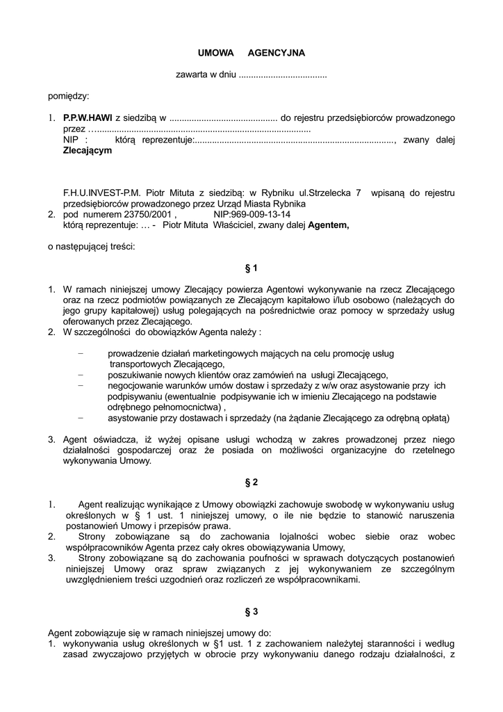 UMOWA AGENCYJNA zawarta w dniu .................................... pomiędzy: 1. P.P.W.HAWI z siedzibą w ............................................ do rejestru przedsiębiorców prowadzonego przez …....................................................................................... NIP : którą reprezentuje:................................................................................., zwany dalej Zlecającym F.H.U.INVEST-P.M. Piotr Mituta z siedzibą: w Rybniku ul.Strzelecka 7 przedsiębiorców prowadzonego przez Urząd Miasta Rybnika 2. pod numerem 23750/2001 , NIP:969-009-13-14 którą reprezentuje: … - Piotr Mituta Właściciel, zwany dalej Agentem, wpisaną do rejestru o następującej treści: §1 1. W ramach niniejszej umowy Zlecający powierza Agentowi wykonywanie na rzecz Zlecającego oraz na rzecz podmiotów powiązanych ze Zlecającym kapitałowo i/lub osobowo (należących do jego grupy kapitałowej) usług polegających na pośrednictwie oraz pomocy w sprzedaży usług oferowanych przez Zlecającego. 2. W szczególności do obowiązków Agenta należy : − − − − prowadzenie działań marketingowych mających na celu promocję usług transportowych Zlecającego, poszukiwanie nowych klientów oraz zamówień na usługi Zlecającego, negocjowanie warunków umów dostaw i sprzedaży z w/w oraz asystowanie przy ich podpisywaniu (ewentualnie podpisywanie ich w imieniu Zlecającego na podstawie odrębnego pełnomocnictwa) , asystowanie przy dostawach i sprzedaży (na żądanie Zlecającego za odrębną opłatą) 3. Agent oświadcza, iż wyżej opisane usługi wchodzą w zakres prowadzonej przez niego działalności gospodarczej oraz że posiada on możliwości organizacyjne do rzetelnego wykonywania Umowy. §2 1. 2. 3. Agent realizując wynikające z Umowy obowiązki zachowuje swobodę w wykonywaniu usług określonych w § 1 ust. 1 niniejszej umowy, o ile nie będzie to stanowić naruszenia postanowień Umowy i przepisów prawa. Strony zobowiązane są do zachowania lojalności wobec siebie oraz wobec współpracowników Agenta przez cały okres obowiązywania Umowy, Strony zobowiązane są do zachowania poufności w sprawach dotyczących postanowień niniejszej Umowy oraz spraw związanych z jej wykonywaniem ze szczególnym uwzględnieniem treści uzgodnień oraz rozliczeń ze współpracownikami. §3 Agent zobowiązuje się w ramach niniejszej umowy do: 1. wykonywania usług określonych w §1 ust. 1 z zachowaniem należytej staranności i według zasad zwyczajowo przyjętych w obrocie przy wykonywaniu danego rodzaju działalności, z uwzględnieniem interesów materialnych i niematerialnych Zlecającego, 2. postępowania zgodnie z polityką handlową Zlecającego, 3. przekazywania Zlecającemu wszelkich informacji mających znaczenie dla Zlecającego w związku z prowadzoną przez niego działalnością gospodarczą, 4. współdziałania z pracownikami Zlecającego w zakresie niezbędnym do pełnego i rzetelnego wykonywania usług określonych w § 1 ust. 1, 5. uwzględniania wskazówek i/lub zaleceń Zlecającego uzasadnionych w danych okolicznościach (w szczególności technicznych oraz cenowych) w relacjach z klientami, 6. zatrudniania do realizacji niniejszej Umowy na własny koszt i na własne ryzyko pracowników i/lub współpracowników, właściwego ich szkolenia ich oraz nadzoru nad ich działaniem, 7. używania własnych narzędzi i materiałów do wykonywania usług określonych w § 1 ust. 1. §4 Zlecający w ramach niniejszej umowy zobowiązuje się do : 1. udzielania Agentowi wszelkiej niezbędnej pomocy technicznej takiej jak: dostarczania aktualnych informacji o oferowanych produktach i usługach oraz wspierania jego działań, przekazywania materiałów reklamowych i informacyjnych, 2. należytej opieki handlowej oraz technicznej dla klientów 3. informowanie go na bieżąco o sprawach mających wpływ na sposób i zakres wykonywanych przez Agenta obowiązków, 4. terminowej realizacji umów oraz zleceń zawartych za pośrednictwem oraz przy udziale Agenta, 5. dokonywania terminowej wpłaty umówionego wynagrodzenia. §5 Strony ustalają dodatkowo następujące zasady współpracy : 1. Niniejsza umowa upoważnia Agenta oraz jego współpracowników do działania na terenie całej Polski. 2. Agent będzie informował Zlecającego na bieżąco o podejmowanych działaniach, a w szczególności o potencjalnych klientach oraz współpracownikach. Przez pojęcie „Klient” rozumie się nabywcę towaru/usługi, z którym Zlecający zawarł umowę przy udziale i/lub za pośrednictwem Agenta lub firm z nim powiązanych 3. W przypadku jakichkolwiek uwag Zlecający powinien w terminie 5 dni roboczych skorygować działania Agenta. Jeżeli w tym czasie nie nastąpi informacja zwrotna Agent może przyjąć, że podejmowane przez niego czynności uzyskały aprobatę Zlecającego. §6 1. Wynagrodzenie Agenta z tytułu wykonywania usług określonych w § 1 ust. 1 Strony określają w następujący sposób : - wynagrodzenie prowizyjne: – 5% wartości faktur netto za usługi których świadczenie będzie skutkiem działalności Agenta - od sprzedaży innych produktów i usług Zlecającego wysokość prowizji będzie ustalana indywidualnie. 2. Strony ustalają miesięczny okres rozliczeniowy. Po upływie danego okresu rozliczeniowego Zlecający zobowiązany jest do sporządzenia i przekazania Agentowi w terminie do 3 dni kalendarzowych po okresie rozliczeniowym zestawienia stanu obrotów z klientami, z którymi zawarł umowę za pośrednictwem i/lub przy udziale Agenta (lub firm z nim powiązanych). Zestawienie zawierać będzie następujące dane: nazwa klienta, ilość i rodzaj przetransportowanego (sprzedanego) towaru, kwota zapłaty dokonanej przez klienta. Podstawą wystawienia faktury VAT przez Agenta będzie zestawienie sporządzone przez Zlecającego i zweryfikowane przez Agenta 3. Rozliczenia wynikające z niniejszej umowy stają się wymagal
