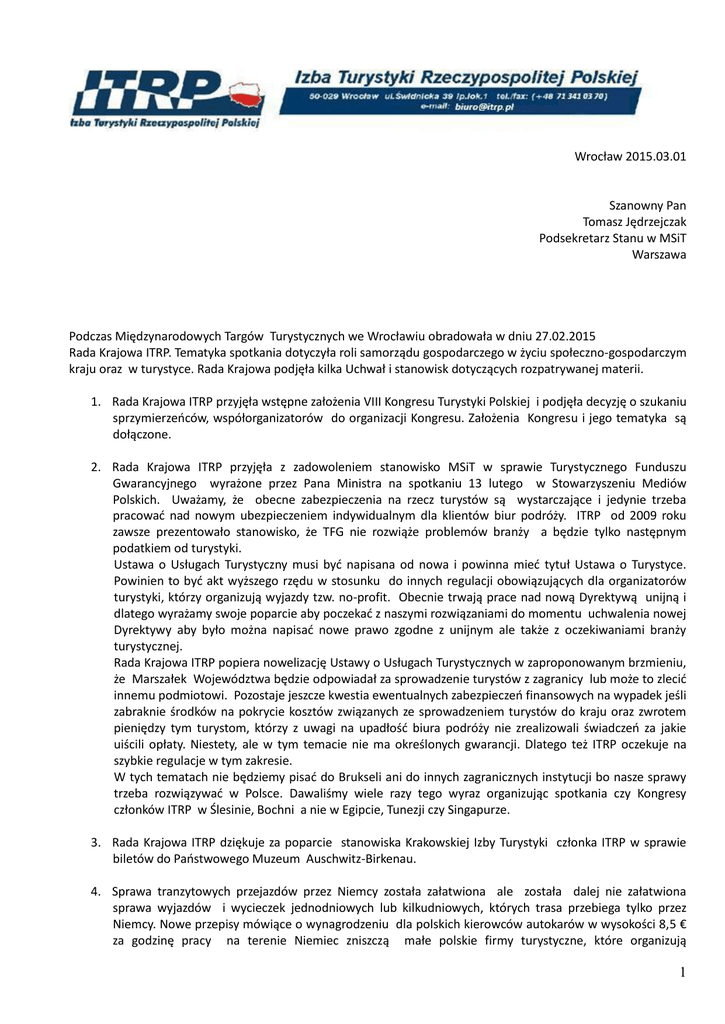 Wrocław 2015.03.01 Szanowny Pan Tomasz Jędrzejczak Podsekretarz Stanu w MSiT Warszawa Podczas Międzynarodowych Targów Turystycznych we Wrocławiu obradowała w dniu 27.02.2015 Rada Krajowa ITRP. Tematyka spotkania dotyczyła roli samorządu gospodarczego w życiu społeczno-gospodarczym kraju oraz w turystyce. Rada Krajowa podjęła kilka Uchwał i stanowisk dotyczących rozpatrywanej materii. 1. Rada Krajowa ITRP przyjęła wstępne założenia VIII Kongresu Turystyki Polskiej i podjęła decyzję o szukaniu sprzymierzeńców, współorganizatorów do organizacji Kongresu. Założenia Kongresu i jego tematyka są dołączone. 2. Rada Krajowa ITRP przyjęła z zadowoleniem stanowisko MSiT w sprawie Turystycznego Funduszu Gwarancyjnego wyrażone przez Pana Ministra na spotkaniu 13 lutego w Stowarzyszeniu Mediów Polskich. Uważamy, że obecne zabezpieczenia na rzecz turystów są wystarczające i jedynie trzeba pracować nad nowym ubezpieczeniem indywidualnym dla klientów biur podróży. ITRP od 2009 roku zawsze prezentowało stanowisko, że TFG nie rozwiąże problemów branży a będzie tylko następnym podatkiem od turystyki. Ustawa o Usługach Turystyczny musi być napisana od nowa i powinna mieć tytuł Ustawa o Turystyce. Powinien to być akt wyższego rzędu w stosunku do innych regulacji obowiązujących dla organizatorów turystyki, którzy organizują wyjazdy tzw. no-profit. Obecnie trwają prace nad nową Dyrektywą unijną i dlatego wyrażamy swoje poparcie aby poczekać z naszymi rozwiązaniami do momentu uchwalenia nowej Dyrektywy aby było można napisać nowe prawo zgodne z unijnym ale także z oczekiwaniami branży turystycznej. Rada Krajowa ITRP popiera nowelizację Ustawy o Usługach Turystycznych w zaproponowanym brzmieniu, że Marszałek Województwa będzie odpowiadał za sprowadzenie turystów z zagranicy lub może to zlecić innemu podmiotowi. Pozostaje jeszcze kwestia ewentualnych zabezpieczeń finansowych na wypadek jeśli zabraknie środków na pokrycie kosztów związanych ze sprowadzeniem turystów do kraju oraz zwrotem pieniędzy tym turystom, którzy z uwagi na upadłość biura podróży nie zrealizowali świadczeń za jakie uiścili opłaty. Niestety, ale w tym temacie nie ma określonych gwarancji. Dlatego też ITRP oczekuje na szybkie regulacje w tym zakresie. W tych tematach nie będziemy pisać do Brukseli ani do innych zagranicznych instytucji bo nasze sprawy trzeba rozwiązywać w Polsce. Dawaliśmy wiele razy tego wyraz organizując spotkania czy Kongresy członków ITRP w Ślesinie, Bochni a nie w Egipcie, Tunezji czy Singapurze. 3. Rada Krajowa ITRP dziękuje za poparcie stanowiska Krakowskiej Izby Turystyki członka ITRP w sprawie biletów do Państwowego Muzeum Auschwitz-Birkenau. 4. Sprawa tranzytowych przejazdów przez Niemcy została załatwiona ale została dalej nie załatwiona sprawa wyjazdów i wycieczek jednodniowych lub kilkudniowych, których trasa przebiega tylko przez Niemcy. Nowe przepisy mówiące o wynagrodzeniu dla polskich kierowców autokarów w wysokości 8,5 € za godzinę pracy na terenie Niemiec zniszczą małe polskie firmy turystyczne, które organizują 1 jednodniowe wycieczki do Berlina, Drezna, Cottbus, Miśni, Mortizburga itp. Średnio taka wycieczka podrożała o 500-800PLN za jeden kurs. Prosimy o interwencję w Ministerstwie Infrastruktury i u partnerów niemieckich (załącznik - Transport autokarowy przez Niemcy). 5. Budzi nasze zdziwienie przyznanie przez MSiT kwoty 115 000 PLN dla Polskiej Izby Turystyki na szkolenie pilotów wycieczek zagranicznych i Certyfikowanie tych pilotów. Chcielibyśmy Pana Ministra poinformować, że w strukturach ITRP działa Zespół Pilotów Wycieczek Zagranicznych, Przewodników i Rezydentów, który został powołany 4 czerwca 2014 roku. Odbyły sie dwa kursy pilotów wycieczek zagranicznych zakończone egzaminem we Wrocławiu, gdzie nie tylko nie otrzymaliśmy ani nie żądaliśmy żadnych środków a wręcz po opłaceniu Komisji Egzaminacyjnej, wynajmu sali oraz wydaniu odpowiednich dokumentów i certyfikatów zostały małe środki na działalność statutową. Przygotowujemy teraz kursy i egzaminy w Katowicach, Krakowie oraz we Wrocławiu. 6. Jesteśmy bardzo zaniepokojeni przetargiem rozstrzygniętym przez POT na wyszukiwarkę noclegów i hoteli. Przetarg wygrała firma Booking.com , w naszej ocenie bardzo dobra wyszukiwarka hoteli na całym świecie, ale za nic niepasująca do roli jaką ma spełniać POT, czyli promocji Polski. Na portalu POT powinna być polska wyszukiwarka, która ma w swojej ofercie tylko i wyłącznie rezerwację miejsc noclegowych i hotelowych oraz atrakcji turystycznych w Polsce. 7. Rada Krajowa ITRP prosi o uzasadnienie w sprawie wyboru nowej Rady POT. Rekomendowaliśmy kol. Andrzeja Szymańskiego, który był członkiem Rady w ubiegłej kadencji. Nikt nie zgłaszał do ITRP żadnych uwag co do jego pracy i aktywności w Radzie POT. Był to nasz jedyny kontakt przez który mogliśmy się jako organizacja ogólnopolska dowiedzieć co robi POT, jakie ma zamierzenia, kampanie itp. a także poprzez naszego reprezentanta przedstawiać stanowisko branży bo innych kontaktów z POT nie mieliśmy. Uznanie i miejsce w Radzie POT znalazły organizacje , które nawet nam działającym w branży turystycznej są mało znane lub nie przejawiają prawie żadnych działań na rzecz turystyki . Prosimy również o wyjaśnienie powołania w tym składzie dwóch przedstawicieli ROT-w, organizacji, które nie są przedstawicielami samorządu gospodarczego, samorządu zawodowego. We wszystkich sprawach poruszonych w czasie obrad Rady Krajowej ITRP jestem do Pana dyspozycji. Z poważaniem Przewodniczący Rady Krajowej Izby Turystyki RP Marek Ciechanowski Do wiadomości : 1. Przewodniczący Komisji Kultury Fizycznej, Sportu i Turystyki - Poseł Ireneusz Raś 2. Przewodniczący Podkomisji Turystyki - Poseł Andrzej Gut-Mostowy 3. Prezes Polskiej Organizacji Turystyc