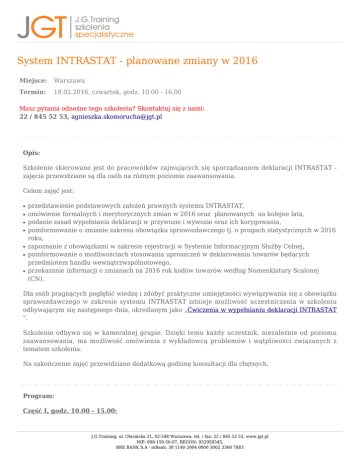 System INTRASTAT - planowane zmiany w 2016 Miejsce: Warszawa Termin: 18.02.2016, czwartek, godz. 10.00 - 16.00 Masz pytania odnośne tego szkolenia? Skontaktuj się z nami: 22 / 845 52 53, [email protected] Opis: Szkolenie skierowane jest do pracowników zajmujących się sporządzaniem deklaracji INTRASTAT zajęcia przewidziane są dla osób na różnym poziomie zaawansowania. Celem zajęć jest: ● ● ● ● ● ● ● przedstawienie podstawowych założeń prawnych systemu INTRASTAT, omówienie formalnych i merytorycznych zmian w 2016 oraz planowanych na kolejne lata, podanie zasad wypełniania deklaracji w przywozie i wywozie oraz ich korygowania, poinformowanie o zmianie zakresu obowiązku sprawozdawczego tj. o progach statystycznych w 2016 roku, zapoznanie z obowiązkami w zakresie rejestracji w Systemie Informacyjnym Służby Celnej, poinformowanie o możliwościach stosowania uproszczeń w deklarowaniu towarów będących przedmiotem handlu wewnątrzwspólnotowego, przekazanie informacji o zmianach na 2016 rok kodów towarów według Nomenklatury Scalonej (CN). Dla osób pragnących pogłębić wiedzę i zdobyć praktyczne umiejętności wywiązywania się z obowiązku sprawozdawczego w zakresie systemu INTRASTAT istnieje możliwość uczestniczenia w szkoleniu odbywającym się następnego dnia, określanym jako „Ćwiczenia w wypełnianiu deklaracji INTRASTAT ". Szkolenie odbywa się w kameralnej grupie. Dzięki temu każdy uczestnik, niezależnie od poziomu zaawansowania, ma możliwość omówienia z wykładowcą problemów i wątpliwości związanych z tematem szkolenia. Na zakończenie zajęć przewidziano dodatkową godzinę konsultacji dla chętnych. Program: Część I, godz. 10.00 - 15.00: J.G.Training, ul. Olesińska 21, 02-548 Warszawa, tel. / fax: 22 / 845 52 53, www.jgt.pl NIP: 898-150-56-07, REGON: 932958345, BRE BANK S.A - mBank: 38 1140 2004 0000 3002 3360 7883 1. Obowiązek sprawozdawczy w zakresie wewnątrzwspólnotowego handlu towarami: podstawowe zasady obowiązku sprawozdawczego, system upomnień. ❍ ❍ 2. Zmiany w polskim systemie INTRASTAT: zmiany w aktach prawnych w zakresie systemu INTRASTAT, merytoryczne i formalne zmiany w funkcjonowaniu systemu, tryb dokonywania zgłoszeń INTRASTAT w 2016 r. (właściwość miejscowa organów celnych, tryb i sposób dokonywania zgłoszeń INTRASTAT, obowiązek rejestracji przy składaniu deklaracji INTRASTAT w formie elektronicznej), rejestracja i aktualizacja zgodnie z zasadami zawartymi w dokumencie „E-Klient Służby Celnej – Instrukcja elektronicznej rejestracji dla potrzeb zarządzania użytkownikami korzystającymi z usług Systemu Informacyjnego Służby Celnej”, zmiany w Nomenklaturze Scalonej w 2016 r. (nowe i usunięte kody towarów, klucze przejścia). ❍ ❍ ❍ ❍ ❍ 3. Zasady dokonywania zgłoszeń INTRASTAT: ustalanie zakresu obowiązku sprawozdawczego (wysokość progów statystycznych w 2016 r.), wykorzystanie danych podatkowych do badania poprawności danych w systemie INTRASTAT, podstawowe zasady deklarowania towarów w obrocie wewnątrzwspólnotowym - w tym praktyczne ćwiczenie w zakresie wypełniania deklaracji INTRASTAT w przywozie i wywozie towarów, najczęściej popełniane błędy podczas wypełniania deklaracji, korygowanie deklaracji INTRASTAT, tryb przekazywania zgłoszeń w formie elektronicznej, uproszczenia w deklarowaniu wybranych rodzajów towarów, specyficzne przypadki deklarowania towarów. ❍ ❍ ❍ ❍ ❍ ❍ ❍ ❍ 4. Klasyfikowanie towarów według Nomenklatury Scalonej na 2016 rok: klasyfikowanie towarów według Nomenklatury Scalonej, zmiany w kodowaniu towarów (nowe i usunięte kody), klucze przejścia (2015-2016 i 2016-2015). ❍ ❍ ❍ 5. Planowane zmiany w systemie INTRASTAT w kolejnych latach. Część II, godz. 15.00 - 16.00: Dla zainteresowanych uczestników - konsultacje. Wykładowca: Posiada duże doświadczenie w zakresie systemu INTRASTAT. Współpracowała z Urzędem Statystycznym Unii Europejskiej – Eurostatem, urzędami statystycznymi (m.in. Niemiec, Austrii, Belgii, Włoch, Francji, krajów „kandydujących”) oraz urzędami celnymi (m.in. Wielkiej Brytanii) w procesie J.G.Training, ul. Olesińska 21, 02-548 Warszawa, tel. / fax: 22 / 845 52 53, www.jgt.pl NIP: 898-150-56-07, REGON: 932958345, BRE BANK S.A - mBank: 38 1140 2004 0000 3002 3360 7883 przygotowań do zorganizowania i wdrożenia w Polsce systemu INTRASTAT. W ramach implementacji systemu INTRASTAT w Polsce współpracowała ściśle z administracją celną przy tworzeniu regulacji prawnych dla systemu INTRASTAT, rozwiązań prawnych (typu umowy międzyresortowe), organizacyjnych oraz merytorycznych dla potrzeb systemu INTRASTAT. Jest autorką wielu publikacji na temat systemu INTRASTAT m.in. artykułów w „Rynkach Zagranicznych”, „Monitorze Prawa Celnego”, „Rzeczpospolitej”, „Przeglądzie Rządowym”, „Wiadomościach Statystycznych”. Miejsce: Miejsce szkolenia zlokalizowane w centrum Warszawy, czas dojazdu tramwajem z Dworca Centralnego - około 5 minut. Na 4 dni robocze przed planowanym terminem szkolenia skontaktujemy się z Państwem i przekażemy szczegółowe informacje na temat lokalizacji szkolenia. Hotele w pobliżu miejsca szkolenia: Hotel Campanile, ul. Towarowa 2, Warszawa Cena noclegu zależy od terminu i wolnych miejsc w Hotelu. Koszt od 279 zł (jedynka ze śniadaniem), tel. 22 582 72 00, http://www.campanile-warszawa.pl/pl Hotel Golden Tulip, ul. Towarowa 2, Warszawa Cena noclegu zależy od terminu i wolnych miejsc w Hotelu. Koszt od 315 zł (jedynka ze śniadaniem), tel. 22 582 75 00, http://www.goldentulipwarsawcentre.com/pl Hotel Premiere Classe, ul. Towarowa 2, Warszawa Cena noclegu zależy od terminu i wolnych miejsc w Hotelu. Koszt od 177 zł (jedynka ze śniadaniem), tel. 22 624 08 00, http://www.premiere-classe-warszawa.pl/pl Cena: 590,00 zł + 23% VAT = 725,70 zł brutto 590,00 zł + VAT zw = 590,00 zł brutto - w przypadku, gdy ud