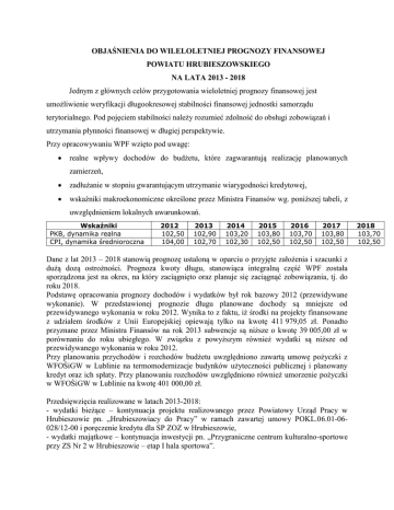 OBJAŚNIENIA DO WILELOLETNIEJ PROGNOZY FINANSOWEJ POWIATU HRUBIESZOWSKIEGO NA LATA 2013 - 2018 Jednym z głównych celów przygotowania wieloletniej prognozy finansowej jest umożliwienie weryfikacji długookresowej stabilności finansowej jednostki samorządu terytorialnego. Pod pojęciem stabilności należy rozumieć zdolność do obsługi zobowiązań i utrzymania płynności finansowej w długiej perspektywie. Przy opracowywaniu WPF wzięto pod uwagę: realne wpływy dochodów do budżetu, które zagwarantują realizację planowanych zamierzeń, zadłużanie w stopniu gwarantującym utrzymanie wiarygodności kredytowej, wskaźniki makroekonomiczne określone przez Ministra Finansów wg. poniższej tabeli, z uwzględnieniem lokalnych uwarunkowań. Wskaźniki PKB, dynamika realna CPI, dynamika średnioroczna 2012 102,50 104,00 2013 102,90 102,70 2014 103,20 102,30 2015 103,80 102,50 2016 103,70 102,50 2017 103,80 102,50 Dane z lat 2013 – 2018 stanowią prognozę ustaloną w oparciu o przyjęte założenia i szacunki z dużą dozą ostrożności. Prognoza kwoty długu, stanowiąca integralną część WPF została sporządzona jest na okres, na który zaciągnięto oraz planuje się zaciągnąć zobowiązania, tj. do roku 2018. Podstawę opracowania prognozy dochodów i wydatków był rok bazowy 2012 (przewidywane wykonanie). W przedstawionej prognozie długu planowane dochody są mniejsze od przewidywanego wykonania w roku 2012. Wynika to z faktu, iż środki na projekty finansowane z udziałem środków z Unii Europejskiej opiewają tylko na kwotę 411 979,05 zł. Ponadto przyznane przez Ministra Finansów na rok 2013 subwencje są niższe o kwotę 39 005,00 zł w porównaniu do roku ubiegłego. W związku z powyższym również wydatki są niższe od przewidywanego wykonania w roku 2012. Przy planowaniu przychodów i rozchodów budżetu uwzględniono zawartą umowę pożyczki z WFOŚiGW w Lublinie na termomodernizacje budynków użyteczności publicznej i planowany kredyt oraz ich spłaty. Przy planowaniu rozchodów uwzględniono również umorzenie pożyczki w WFOŚiGW w Lublinie na kwotę 401 000,00 zł. Przedsięwzięcia realizowane w latach 2013-2018: - wydatki bieżące – kontynuacja projektu realizowanego przez Powiatowy Urząd Pracy w Hrubieszowie pn. „Hrubieszowiacy do Pracy” w ramach zawartej umowy POKL.06.01-06028/12-00 i poręczenie kredytu dla SP ZOZ w Hrubieszowie, - wydatki majątkowe – kontynuacja inwestycji pn. „Przygraniczne centrum kulturalno-sportowe przy ZS Nr 2 w Hrubieszowie – etap I hala sportowa”. 2018 103,70 102,50