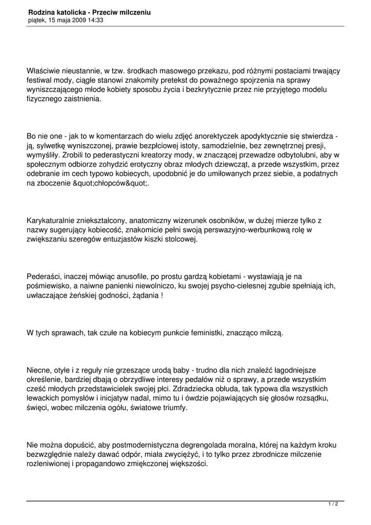 Rodzina katolicka - Przeciw milczeniu piątek, 15 maja 2009 14:33 Właściwie nieustannie, w tzw. środkach masowego przekazu, pod różnymi postaciami trwający festiwal mody, ciągle stanowi znakomity pretekst do poważnego spojrzenia na sprawy wyniszczającego młode kobiety sposobu życia i bezkrytycznie przez nie przyjętego modelu fizycznego zaistnienia. Bo nie one - jak to w komentarzach do wielu zdjęć anorektyczek apodyktycznie się stwierdza ją, sylwetkę wyniszczonej, prawie bezpłciowej istoty, samodzielnie, bez zewnętrznej presji, wymyśliły. Zrobili to pederastyczni kreatorzy mody, w znaczącej przewadze odbytolubni, aby w społecznym odbiorze zohydzić erotyczny obraz młodych dziewcząt, a przede wszystkim, przez odebranie im cech typowo kobiecych, upodobnić je do umiłowanych przez siebie, a podatnych na zboczenie "chłopców". Karykaturalnie zniekształcony, anatomiczny wizerunek osobników, w dużej mierze tylko z nazwy sugerujący kobiecość, znakomicie pełni swoją perswazyjno-werbunkową rolę w zwiększaniu szeregów entuzjastów kiszki stolcowej. Pederaści, inaczej mówiąc anusofile, po prostu gardzą kobietami - wystawiają je na pośmiewisko, a naiwne panienki niewolniczo, ku swojej psycho-cielesnej zgubie spełniają ich, uwłaczające żeńskiej godności, żądania ! W tych sprawach, tak czułe na kobiecym punkcie feministki, znacząco milczą. Niecne, otyłe i z reguły nie grzeszące urodą baby - trudno dla nich znaleźć łagodniejsze określenie, bardziej dbają o obrzydliwe interesy pedałów niż o sprawy, a przede wszystkim cześć młodych przedstawicielek swojej płci. Zdradziecka obłuda, tak typowa dla wszystkich lewackich pomysłów i inicjatyw nadal, mimo tu i ówdzie pojawiających się głosów rozsądku, święci, wobec milczenia ogółu, światowe triumfy. Nie można dopuścić, aby postmodernistyczna degrengolada moralna, której na każdym kroku bezwzględnie należy dawać odpór, miała zwyciężyć, i to tylko przez zbrodnicze milczenie rozleniwionej i propagandowo zmiękczonej większości. 1/2 Rodzina katolicka - Przeciw milczeniu piątek, 15 maja 2009 14:33 stragonarius Źródło: Fronda.pl 2/2