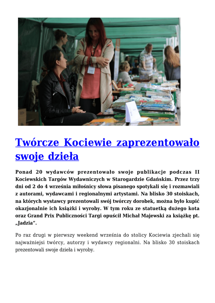 Twórcze Kociewie zaprezentowało swoje dzieła Ponad 20 wydawców prezentowało swoje publikacje podczas II Kociewskich Targów Wydawniczych w Starogardzie Gdańskim. Przez trzy dni od 2 do 4 września miłośnicy słowa pisanego spotykali się i rozmawiali z autorami, wydawcami i regionalnymi artystami. Na blisko 30 stoiskach, na których wystawcy prezentowali swój twórczy dorobek, można było kupić okazjonalnie ich książki i wyroby. W tym roku ze statuetką dużego kota oraz Grand Prix Publiczności Targi opuścił Michał Majewski za książkę pt. „Jadzia”. Po raz drugi w pierwszy weekend września do stolicy Kociewia zjechali się najważniejsi twórcy, autorzy i wydawcy regionalni. Na blisko 30 stoiskach prezentowali swoje dzieła i wyroby. – Idea Targów zrodziła się z potrzeby pokazania światu bogactwa twórczego, literackiego i artystycznego Kociewia – wyjaśnia organizator imprezy – Radosław Spychalski dyrektor Miejskiej Biblioteki Publicznej. To też okazja do spotkania, wymiany doświadczeń i podzielenia się dobrymi praktykami ludzi, którzy na co dzień oddychają słowem pisanym. Ale nie tylko. W sobotnie przedpołudnie podczas dnia targowego każdy mieszkaniec mógł porozmawiać z autorami książek – m.in. Zofią Sumczyńską (Miecio Śmiecio), Michałem Majewskim (Jadzia), Krystyną Gierszewską ( Pory roku na talerzu), twórcami ilustracji do „Bajki o skórzeckim herbie” czy autorką kryminałów Agnieszką Pruską. Krystyna Gierszewska oprócz swoich książek kulinarnych przywiozła też przetwory, o których ciekawie opowiadała zainteresowanym. Krystyna Gierszewska – Przepis na mniszek lekarski, który przywiozłam, jest w mojej najnowszej książce „Pory roku na talerzu”. Wspomaga pracę wątroby i nerek, to doskonały środek na wiosenne oczyszczenie organizmu z toksyn – mówiła autorka. – Staram się zapisywać przepisy na potrawy, które sama wypróbowałam, od tych najstarszych, gdy jako dziecko uczyłam się gotować z moją mamą i babcią, do tych wymyślonych przeze mnie. Mam w swoich zbiorach wiele zeszytów już z pożółkłymi kartkami, zapisanych przez moich bliskich. Oczywiście wiele z tych przepisów urozmaiciłam lub zmodyfikowałam, dodając swoje własne pomysły. Przygodę z pisaniem rozpoczęłam w 2010 roku od cieniutkiej czarno-białej broszurki pt. „Tradycyjne smaki Kociewia”. Bardzo szybko się rozeszła, co dało mi do myślenia. Postanowiłam tę pasję rozwinąć. „Pory roku na talerzu” to moja czwarta książka o tym, jak gotuje się na Kociewiu – dodała z uśmiechem. Pani Krystyna zdradziła też sekrety doskonałego smaku niektórych potraw. – Dodając powidła śliwkowe do makowca sprawimy, że ciasto będzie bardziej soczyste. Podobnie możemy wzbogacić powidłami smak duszonej czerwonej kapusty – radziła. O swoich publikacjach z entuzjazmem opowiadali też wydawcy ze Słupska, Kościerzyny, Skórcza, Tczewa, Zblewa i Starogardu. Spotkania umiliły występy Koła Gospodyń Wiejskich z Koteż i koncert poezji śpiewanej w wykonaniu Dariusza Szymańskiego & Marcina Bryji. Uczestnicy imprezy wysłuchali też fragmentu Quo vadis Henryka Sienkiewicza, w ramach akcji narodowe czytanie. Można było spróbować swoich sił w starej sztuce kaligrafii, a na najmłodszych czekała specjalna strefa zabaw z wieloma atrakcjami. Po raz pierwszy na targach pojawiło się książkowisko – czyli targowisko książki już przeczytanej. Zapoczątkowała je Marta Piechowska, która wystawiła na sprzedaż książki swojego dzieciństwa. Jak na targowisko przystało, na boisku Zespołu Szkół Zawodowych przy ul. Paderewskiego, na którym targi się odbywały, było gwarno, tłoczno i twórczo. Dzień targowy podobnie jak w zeszłym roku zakończył się przyznaniem nagród w konkursie na najciekawsze publikacje Kociewskich Targów Wydawniczych. Statuetka dużego kota czyli Grand Prix KTW powędrowała do Michała Majewskiego za książkę pt. „Jadzia”. Książka uzyskała też największe uznanie wśród publiczności, a autor otrzymał nagrodę Grand Prix Publiczności. Drugie miejsce jury przyznało poecie – księdzu Józefowi Słupskiemu za tomik wierszy „Z dobrocią pod rękę”. Statuetkę średniego kota odebrał Lech Zdrojewski – wydawca twórczości księdza Słupskiego. III miejsce zdobyła książka „Miecio Śmiecio”, a najmniejszy kot trafił w ręce autorki – Zofii Sumczyńskiej. Wyróżnienia otrzymały: „Majątek Żukowskich w Lalkowych na Kociewiu” – Reginy Kotłowskiej oraz „A za mojej pamięci… Wojenne losy. Wspomnienia mieszkańców Nowego t. II” zespołu pod redakcją Zbigniewa Lorkowskiego, Marcina Tylmana i Katarzyny Tylman. To były trzy udane dni targowe. Jak powiedział prezydent Stankowiak niewiele można spodziewać się po regionie, który epatuje tylko nazwą. Najważniejsi bowiem są twórcy. Bez nich region jest martwy. Kociewskie Targi Wydawnicze są dowodem na to, że Kociewie żyje. Pogratulował Miejskiej Bibliotece Publicznej za organizację, determinację i konsekwencję w przygotowaniu tego stałego już wydarzenia w naszym mieście.