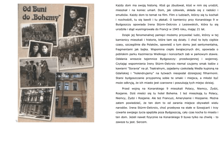 Każdy dom ma swoją historię. Ktoś go zbudował, ktoś w nim się urodził, mieszkał i na koniec umarł. Dom, jak człowiek, składa się z radości i smutków. Każdy dom to temat na film. Film o ludziach, którzy się tu kochali i rozchodzili, tu się bawili i tu płakali. O kamienicy przy Konarskiego 9 w Bydgoszczy opowiada Irena Stürm-Delcroix z Lesiewskich, która tu się urodziła i stąd wyemigrowała do Francji w 1945 roku, mając 21 lat. Dzięki jej fenomenalnej pamięci możemy przywołać ludzi, którzy w tej kamienicy mieszkali i historie, które tam się działy. I choć to były ciężkie czasy, szczególnie dla Polaków, opowieść o tym domu jest sentymentalna, fragmentami jak bajka. Wspomina ciepło świątecznych dni, opowiada o pobliskim parku Kazimierza Wielkiego i koncertach żab w parkowym stawie. Odsłania wreszcie tajemnice Bydgoszczy: przedwojennej i wojennej. Czytając wspomnienia Ireny Stürm-Delcroix niemal czujemy smak lodów z kawiarni "Soravia" na pl. Teatralnym, zajadamy czekoladę Wedla kupioną na Gdańskiej i "holendrujemy" na łyżwach nieopodal dzisiejszej filharmonii. Starsi bydgoszczanie przypomną sobie te smaki i miejsca, a młodzi być może odkryją, że ich miasto jest czarowne i poszukają tych miejsc dzisiaj. Przed wojną na Konarskiego 9 mieszkali Polacy, Niemcy, Żydzi, Rosjanie. Dziś mieści się tu hotel Bohema. I też mieszkają tu Polacy, Niemcy, Żydzi i Rosjanie. Ale też Francuzi, Amerykanie i Hiszpanie. Można zatem powiedzieć, że ten dom to od zarania miejsce obywateli wielu narodów. Irena Stürm-Delcroix, choć przebywa na stałe w Szwajcarii i trzy czwarte swojego życia spędziła poza Bydgoszczą, cały czas kocha to miasto i ten dom. Jeżeli nawet fizycznie na Konarskiego 9 bywa tylko na chwilę - to \\ zawsze tu jest. Sercem.