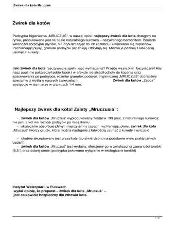 Żwirek dla kota Mruczuś Żwirek dla kotów Podsypka higieniczna „MRUCZUŚ”, w naszej opinii najlepszy żwirek dla kota dostępny na rynku, produkowana jest na bazie naturalnego surowca – nazywanego bentonitem. Posiada własności sorpcyjne płynów, nie dopuszczając do ich rozkładu i uwalniania się zapachów. Pochłaniając płyny, granulki podsypki pęcznieją i zbrylają się. Można je później z łatwością usunąć z kuwety. Jaki żwirek dla kota rzeczywiście spełni jego wymagania? Przede wszystkim: bezpieczny! Aby nasz pupil nie pokaleczył sobie łapek i w efekcie nie stracił ochoty do kopania oraz spacerowania po podsypce, rozmiar granulek podsypki higienicznej „MRUCZUŚ” dobraliśmy specjalnie z myślą o naszych zwierzętach. Żwirek dla kotów „Zębca” występuje w rozmiarze w granicach 1-4 mm. Najlepszy żwirek dla kota! Zalety „Mruczusia”: - żwirek dla kotów „Mruczuś” wyprodukowany został w 100 proc. z naturalnego surowca; nie pyli, a kot nie roznosi podsypki po mieszkaniu - skutecznie absorbuje płyny i nieprzyjemny zapach: wchłaniając płyny, żwirek dla kota „Mruczuś” tworzy grudki, które można następnie z łatwością usunąć z kuwety i wyrzucić - chętnie akceptowany jest przez koty (co stwierdzono na podstawie wielu praktycznych badań!) - żwirek dla kotów „Mruczuś” jest wydajny: oferujemy go w zwiększonej zawartości torebki (6,5 l) oraz dobrej cenie (podsypka pakowana wyłącznie w ekologiczne torebki) Instytut Weterynarii w Puławach wydał opinię, że preparat – żwirek dla kota „Mruczuś” – jest całkowicie bezpieczny dla zdrowia kota. 1/2 Żwirek dla kota Mruczuś NAJLEPSZY ŻWIREK DLA KOTA Higieniczna i super chłonna podsypka „MRUCZUŚ" w kuwecie każdego domowego kota ! Żwirek dla kotów – opakowanie: - worek papierowy o pojemności 6,5 litra - pakowany na palecie po 144 sztuki - całość ofoliowana Kontakt: Zakłady Górniczo-Metalowe „Zębiec” SA w Zębcu (27-200 Starachowice) tel.: +48 41/ 27 67 416, 516; faks: +48 41/ 27 67 500, 501; e-mail: [email protected] 2/2