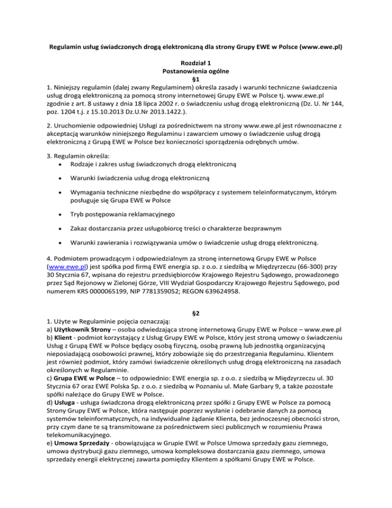 Regulamin usług świadczonych drogą elektroniczną dla strony Grupy EWE w Polsce (www.ewe.pl) Rozdział 1 Postanowienia ogólne §1 1. Niniejszy regulamin (dalej zwany Regulaminem) określa zasady i warunki techniczne świadczenia usług drogą elektroniczną za pomocą strony internetowej Grupy EWE w Polsce tj. www.ewe.pl zgodnie z art. 8 ustawy z dnia 18 lipca 2002 r. o świadczeniu usług drogą elektroniczną (Dz. U. Nr 144, poz. 1204 t.j. z 15.10.2013 Dz.U.Nr 2013.1422.). 2. Uruchomienie odpowiedniej Usługi za pośrednictwem na strony www.ewe.pl jest równoznaczne z akceptacją warunków niniejszego Regulaminu i zawarciem umowy o świadczenie usług drogą elektroniczną z Grupą EWE w Polsce bez konieczności sporządzenia odrębnych umów. 3. Regulamin określa: Rodzaje i zakres usług świadczonych drogą elektroniczną Warunki świadczenia usług drogą elektroniczną Wymagania techniczne niezbędne do współpracy z systemem teleinformatycznym, którym posługuje się Grupa EWE w Polsce Tryb postępowania reklamacyjnego Zakaz dostarczania przez usługobiorcę treści o charakterze bezprawnym Warunki zawierania i rozwiązywania umów o świadczenie usług drogą elektroniczną. 4. Podmiotem prowadzącym i odpowiedzialnym za stronę internetową Grupy EWE w Polsce (www.ewe.pl) jest spółka pod firmą EWE energia sp. z o.o. z siedzibą w Międzyrzeczu (66-300) przy 30 Stycznia 67, wpisana do rejestru przedsiębiorców Krajowego Rejestru Sądowego, prowadzonego przez Sąd Rejonowy w Zielonej Górze, VIII Wydział Gospodarczy Krajowego Rejestru Sądowego, pod numerem KRS 0000065199, NIP 7781359052; REGON 639624958. §2 1. Użyte w Regulaminie pojęcia oznaczają: a) Użytkownik Strony – osoba odwiedzająca stronę internetową Grupy EWE w Polsce – www.ewe.pl b) Klient - podmiot korzystający z Usług Grupy EWE w Polsce, który jest stroną umowy o świadczeniu Usług z Grupą EWE w Polsce będący osobą fizyczną, osobą prawną lub jednostką organizacyjną nieposiadającą osobowości prawnej, który zobowiąże się do przestrzegania Regulaminu. Klientem jest również podmiot, który zamówi świadczenie określonych usług drogą elektroniczną na zasadach określonych w Regulaminie. c) Grupa EWE w Polsce – to odpowiednio: EWE energia sp. z o.o. z siedzibą w Międzyrzeczu ul. 30 Stycznia 67 oraz EWE Polska Sp. z o.o. z siedzibą w Poznaniu ul. Małe Garbary 9, a także pozostałe spółki należące do Grupy EWE w Polsce. d) Usługa - usługa świadczona drogą elektroniczną przez spółki z Grupy EWE w Polsce za pomocą Strony Grupy EWE w Polsce, która następuje poprzez wysłanie i odebranie danych za pomocą systemów teleinformatycznych, na indywidualne żądanie Klienta, bez jednoczesnej obecności stron, przy czym dane te są transmitowane za pośrednictwem sieci publicznych w rozumieniu Prawa telekomunikacyjnego. e) Umowa Sprzedaży - obowiązująca w Grupie EWE w Polsce Umowa sprzedaży gazu ziemnego, umowa dystrybucji gazu ziemnego, umowa kompleksowa dostarczania gazu ziemnego, umowa sprzedaży energii elektrycznej zawarta pomiędzy Klientem a spółkami Grupy EWE w Polsce. f) Strona Grupy EWE w Polsce - strona internetowa dla Klientów Grupy EWE w Polsce udostępniająca informacje o firmie i spółkach Grupy EWE w Polsce dostępna pod adresem www.ewe.pl. g) Przeglądarka internetowa - program komputerowy umożliwiający pobieranie i wyświetlanie stron internetowych umieszczonych na serwerze internetowym. Grupa EWE w Polsce zaleca korzystanie z Przeglądarek podanych w miejscu określonym w §3 ust.1 Regulaminu. h) Prawo telekomunikacyjne - ustawa z dnia 16 lipca 2004 r. - Prawo telekomunikacyjne (Dz. U. Nr 171, poz. 1800 z późn. zm.). i) Cookies – tzw. ciasteczka, czyli pliki tekstowe zapisywane automatycznie na dysku lokalnym komputera przez Przeglądarkę internetową i przechowujące informacje dot. odwiedzin takie jak np. typ przeglądarki itp. j) Newsletter – biuletyn w formie elektronicznej rozsyłany do Klientów za pomocą poczty elektronicznej po ich wcześniejszym zapisaniu się do niego. k) Adres poczty elektronicznej – to tzw. adres email umożliwiający przesyłanie wiadomości internetowych (listów elektronicznych) poprzez sieć komputerową, w tym poprzez Internet, składający się z identyfikatora użytkownika, znaku @ oraz nazwy domenowej serwera poczty. l) System teleinformatyczny - zespół współpracujących ze sobą urządzeń informatycznych i oprogramowania, zapewniający przetwarzanie i przechowywanie, a także wysyłanie i odbieranie danych poprzez sieci telekomunikacyjne za pomocą właściwego dla danego rodzaju sieci urządzenia końcowego w rozumieniu Prawa telekomunikacyjnego. ł) Środki komunikacji elektronicznej - rozwiązania techniczne, w tym urządzenia teleinformatyczne i współpracujące z nimi narzędzia programowe, umożliwiające indywidualne porozumiewanie się na odległość przy wykorzystaniu transmisji danych między Systemami teleinformatycznymi, a w szczególności pocztę elektroniczną. m) Ustawa o świadczeniu usług drogą elektroniczną - ustawa z dnia 18 lipca 2002 r. o świadczeniu usług drogą elektroniczną (Dz. U. Nr 144, poz. 1204 z poźn. zm.). n) Umowa o przyłączenie do sieci gazowej - obowiązująca w Grupie EWE Polska umowa umożliwiająca przyłączenie do sieci gazowej EWE energia. §3 1. Prawidłowe korzystanie z Usług Grupy EWE w Polsce możliwe jest pod warunkiem spełnienia przez System teleinformatyczny Klienta lub/i Użytkownika Strony minimalnych wymagań technicznych: Przeglądarka internetowa: Internet Explorer (wersja min. 8 lub wyższa), Mozilla Firefox, Opera, Chrome, Safari Strona internetowa Grupy EWE w Polsce zapewnia kompatybilność z urządzeniami mobilnymi obsługiwanymi przez następujące systemy: iOS 5.x, iOS 6.x, Android 4.x, Windows Phone 8. Grupa EWE w Polsce dołoży starań, w celu zapewnienia aby korzystanie z Usług możliwe było dla użytkown