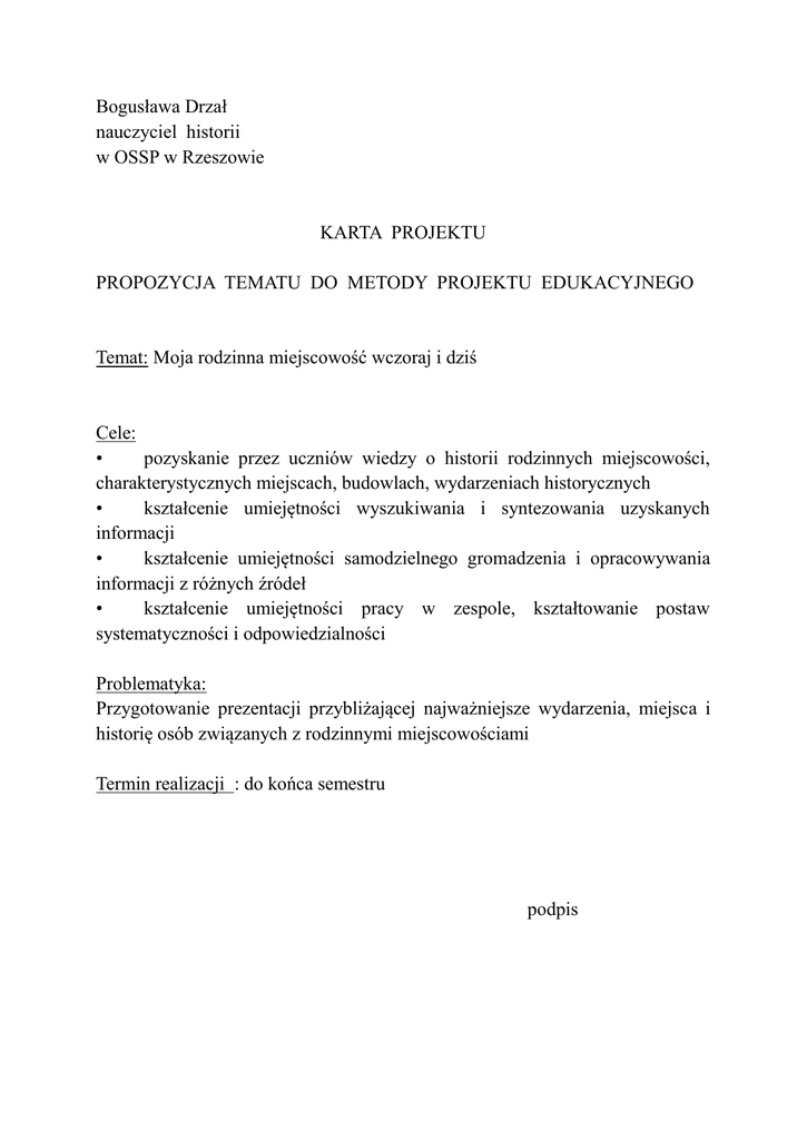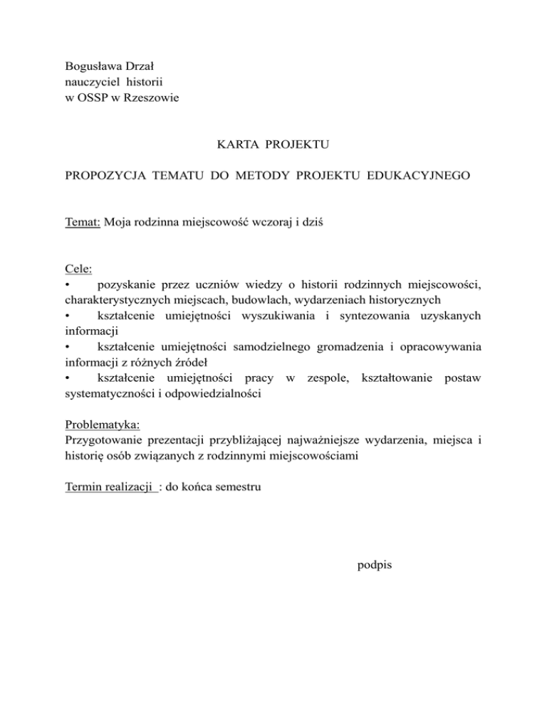Bogusława Drzał nauczyciel historii w OSSP w Rzeszowie KARTA PROJEKTU PROPOZYCJA TEMATU DO METODY PROJEKTU EDUKACYJNEGO Temat: Moja rodzinna miejscowość wczoraj i dziś Cele: • pozyskanie przez uczniów wiedzy o historii rodzinnych miejscowości, charakterystycznych miejscach, budowlach, wydarzeniach historycznych • kształcenie umiejętności wyszukiwania i syntezowania uzyskanych informacji • kształcenie umiejętności samodzielnego gromadzenia i opracowywania informacji z różnych źródeł • kształcenie umiejętności pracy w zespole, kształtowanie postaw systematyczności i odpowiedzialności Problematyka: Przygotowanie prezentacji przybliżającej najważniejsze wydarzenia, miejsca i historię osób związanych z rodzinnymi miejscowościami Termin realizacji : do końca semestru podpis