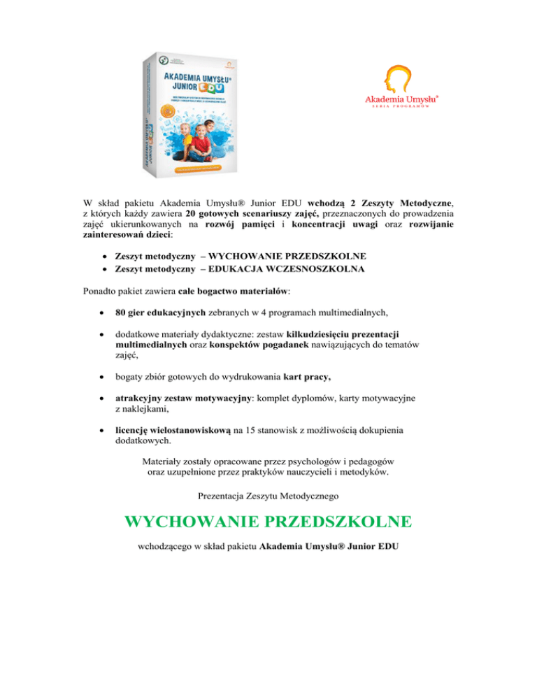 W skład pakietu Akademia Umysłu® Junior EDU wchodzą 2 Zeszyty Metodyczne, z których każdy zawiera 20 gotowych scenariuszy zajęć, przeznaczonych do prowadzenia zajęć ukierunkowanych na rozwój pamięci i koncentracji uwagi oraz rozwijanie zainteresowań dzieci: Zeszyt metodyczny – WYCHOWANIE PRZEDSZKOLNE Zeszyt metodyczny – EDUKACJA WCZESNOSZKOLNA Ponadto pakiet zawiera całe bogactwo materiałów: 80 gier edukacyjnych zebranych w 4 programach multimedialnych, dodatkowe materiały dydaktyczne: zestaw kilkudziesięciu prezentacji multimedialnych oraz konspektów pogadanek nawiązujących do tematów zajęć, bogaty zbiór gotowych do wydrukowania kart pracy, atrakcyjny zestaw motywacyjny: komplet dyplomów, karty motywacyjne z naklejkami, licencję wielostanowiskową na 15 stanowisk z możliwością dokupienia dodatkowych. Materiały zostały opracowane przez psychologów i pedagogów oraz uzupełnione przez praktyków nauczycieli i metodyków. Prezentacja Zeszytu Metodycznego WYCHOWANIE PRZEDSZKOLNE wchodzącego w skład pakietu Akademia Umysłu® Junior EDU 2 ® Akademia Umysłu Junior EDU – Zajęcia dla dzieci w wieku przedszkolnym Akademia Umysłu® JUNIOR EDU Zajęcia dla dzieci w wieku przedszkolnym Copyright © Biuro Informatyki Stosowanej FORMAT Wszelkie prawa zastrzeżone Powielanie w jakiejkolwiek formie całości lub fragmentów bez pisemnej zgody producenta jest zabronione. Autorzy: Natalia Minge Krzysztof Minge Konsultacje metodyczne: Danuta Wielogórska Dorota Wójcik-Hetman Spis treści 1. Wstęp ......................................................................................................................................... 2 Jak rozwija się mózg między 3 a 6 rokiem życia ....................................................................... 2 Koncentracja – tego można się nauczyć ..................................................................................... 2 Źródła problemów z koncentracją .............................................................................................. 2 Trening koncentracji na co dzień................................................................................................ 3 Jak zapamiętują przedszkolaki ................................................................................................... 3 Codzienny trening pamięci ......................................................................................................... 4 Dzieci chcą i lubią się uczyć ...................................................................................................... 4 Podstawowe zasady uczenia się przedszkolaków ...................................................................... 4 Założenia .................................................................................................................................... 5 Cele ............................................................................................................................................ 5 Wykorzystanie scenariuszy zajęć ............................................................................................... 5 2. Sposoby realizacji zajęć ........................................................................................................... 6 W jakiej formie organizować zajęcia? ........................................................................................ 6 Jak realizować zajęcia? .............................................................................................................. 7 Jak zmotywować dzieci do uczestniczenia w zajęciach? ........................................................... 7 Jak lepiej wykorzystać bogactwo programów? .......................................................................... 8 Jak często organizować zajęcia? ................................................................................................ 8 3. Instalacja, uruchomienie i obsługa programów ..................................................................... 9 Rozpoczęcie pracy...................................................................................................................... 9 Wybór ćwiczeń ........................................................................................................................... 9 Ćwiczenia ruchowe .................................................................................................................. 10 Okno główne - przyciski .......................................................................................................... 10 Zainspiruj nas ........................................................................................................................... 12 4. Scenariusze zajęć .................................................................................................................... 13 Nowe życie – jak na świecie pojawiają się młode? .................................................................. 13 Co wyrasta z ziemi– czego potrzebują rośliny do rozwoju? .................................................... 16 Wiosenne porządki – dlaczego utrzymanie porządku i w gnieździe i na Ziemi jest ważne?.... 19 Jak przywoływano wiosnę? – słowiańskie tradycje związane z nadejściem wiosny ............... 23 Wielkanocne palmy – o tradycyjnych palmach wielkanocnych ............................................... 27 Kwietny labirynt – dlaczego kwiaty pachną i są kolorowe? .................................................... 30 Bądź spostrzegawczy – trenowanie spostrzegawczości w różnych sytuacjach ........................ 33 Piłkowa matematyka – poznajemy różne zbiory ...................................................................... 36 Letnia olimpiada – poznajemy dyscypliny sportowe letnich igrzysk olimpijskich .................. 39 Czas żniw – jak wykorzystywane są zboża? .....................................