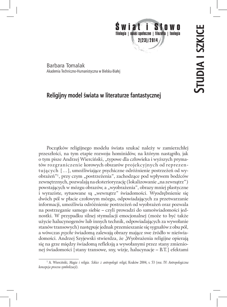 filologia | nauki społeczne | filozofia | teologia 2(23)/2014 Barbara Tomalak Akademia Techniczno-Humanistyczna w Bielsku-Białej Religijny model świata w literaturze fantastycznej Początków religijnego modelu świata szukać należy w zamierzchłej przeszłości, na tym etapie rozwoju hominidów, na którym nastąpiło, jak o tym pisze Andrzej Wierciński, „typowe dla człowieka i wyższych prymatów rozgraniczenie korowych obszarów projekcyjnych od reprezentujących […], umożliwiające psychiczne odróżnienie postrzeżeń od wyobrażeń”1, przy czym „postrzeżenia”, zachodzące pod wpływem bodźców zewnętrznych, pozwalają na eksterioryzację (lokalizowanie „na zewnątrz”) powstających w mózgu obrazów, a „wyobrażenia”, obrazy mniej plastyczne i wyraziste, sytuowane są „wewnątrz” świadomości. Wyodrębnienie się dwóch pól w płacie czołowym mózgu, odpowiadających za przetwarzanie informacji, umożliwia odróżnienie postrzeżeń od wyobrażeń oraz pozwala na postrzeganie samego siebie – czyli prowadzi do samoświadomości jednostki. W przypadku silnej stymulacji emocjonalnej (może to być także użycie halucynogenów lub innych technik, odpowiadających za wywołanie stanów transowych) następuje jednak przemieszanie się sygnałów z obu pól, a wówczas psyche świadomą zalewają obrazy mające swe źródło w nieświadomości. Andrzej Szyjewski stwierdza, że „Wyobrażenia religijne opierają się na grze między świadomą refleksją a wywołanymi przez stany zmienionej świadomości [stany transowe, sny, wizje, halucynacje – B.T.] efektami 1 A. Wierciński, Magia i religia. Szkice z antropologii religii, Kraków 2004, s. 53 (roz. IV: Antropologiczna koncepcja procesu symbolizacji). Studia i szkice Świat i Słowo 214 Barbara Tomalak poznawczymi”2. Wiedza o tym jest potrzebna dla zrozumienia, że element treści nieświadomych leży u podstaw kształtowania się wszelkich wyobrażeń religijnych i że jest obecny (choć zapewne nierozpoznawalny, z powodu blokowania treści nieświadomych przez maksymalnie zracjonalizowany umysł współczesnego człowieka) również w abstrakcyjnych wyobrażeniach transcendencji, właściwych dzisiejszym religiom. Ponieważ jednak, mimo zatarcia pamięci o starych technikach wglądu w przestrzeń wewnętrzną psyche, potrzeba doświadczenia religijnego nadal jest niezbywalną potrzebą człowieka3, więc współczesna kultura proponuje nam powrót do scenariuszy mitycznych poprzez częściową rekonstrukcję pradawnych wierzeń oraz poprzez nadanie nowego znaczenia sferze wyobrażeniowej, eksploatowanej we współczesnym dyskursie naukowym odnoszącym się do neurofizjologicznej aktywności mózgu. Paradygmat animistyczny, zakorzeniony w najpierwotniejszej, zdaniem Edwarda Burnetta Tylora, formie religijnej – animizmie, rozumianym jako wiara w byty duchowe (w tym w duszę ludzką) oraz w duchowy aspekt otaczającej człowieka rzeczywistości, sięga od czasów najdawniejszych aż po późne średniowiecze. A przecież średniowiecze to epoka stosunkowo nieodległa, pamięć kulturowa wciąż pewne średniowieczne treści przechowuje w formie „przeżytków” (termin Tylora), które łatwo reaktywować. W istocie, już w XIX wieku ta pamięć kulturowa została usystematyzowana i poddana obróbce literackiej (jest to także czas narodzin baśni literackiej, zastępującej surową i nieraz okrutną baśń ludową), której podległy teksty kultury przechowywane w pamięci i przekazywane od niepamiętnych czasów z pokolenia na pokolenie, najczęściej drogą ustną. Odzyskanie niepodległości (nieraz po wielu wiekach niewoli) przez niektóre narody Europy, czy też podejmowanie w owym okresie walk narodowo-wyzwoleńczych, do tej niepodległości mających prowadzić, wymagało odwołania się do tradycji i zasobów kulturowych danej społeczności. Sięgnięto po narodowe mitologie, przeszłe dzieje i dokonania, utwierdzające społeczność w przekonaniu o jednoczącej ją historii, ugruntowujące poczucie tożsamości kulturowej i konsolidujące społeczność wokół wartości, z którymi każda jednostka mogła się identyfikować. Taką rolę odegrały liczne w owej epoce eposy narodowe: fińska Kalewala, estoński Kalevipoeg, łotewski Laczplesis, bułgarski cykl O królewiczu Marku, słowacki cykl O Janosiku. Każde z tych dzieł, nawiązując do rodzimych podań etnogenetycznych i narodowej mitologii – nie A. Szyjewski, Etnologia religii, Kraków 2001, s. 175. Zob. R. May, Błaganie o mit, przeł. B. Moderska, T. Zysk, Poznań 1997; B. Tomalak, Śladami mitu (roz. Mitu „naszego powszedniego daj nam dzisiaj”, Bielsko-Biała 2012. Świadczą o tej potrzebie poszukiwania religijne, objawiające się powstawaniem wciąż nowych sekt czy też zwracaniem się do egzotycznych lub historycznych kultów. 2 3 Religijny model świata w literaturze fantastycznej 215 do końca zapomnianej, mimo triumfującego poprzez lata chrześcijaństwa – kreuje postać herosa kulturowego, ukształtowanego według modelu biografii szamańskiej. Wiąże się to z wywodzeniem się bohatera od niezwykłych istot, boskich lub zwierzęcych, z jego zapowiadanymi przez różne znaki nadnaturalnymi narodzinami, a także z zagrożeniem jego życia w dzieciństwie lub w młodości, a później z niebezpiecznymi rytami inicjacyjnymi połączonymi z długą, uciążliwą nauką. Najwyższym osiągnięciem i najważniejszym momentem inicjacji jest pokonanie śmierci – heros zstępuje, a następnie wraca z krainy zmarłych. Życie herosa upływa na walce z istotami nadprzyrodzonymi i na magicznych podróżach w inne wymiary. Podejmuje on również działania cywilizacyjne wobec społeczności, w imieniu której występuje, bardzo często jest po prostu Wielkim Przodkiem-Założycielem. Heros w swoim życiu podlega prześladowaniom i negatywnym osądom, umiera śmiercią gwałtowną i nadnaturalną, po śmierci j
