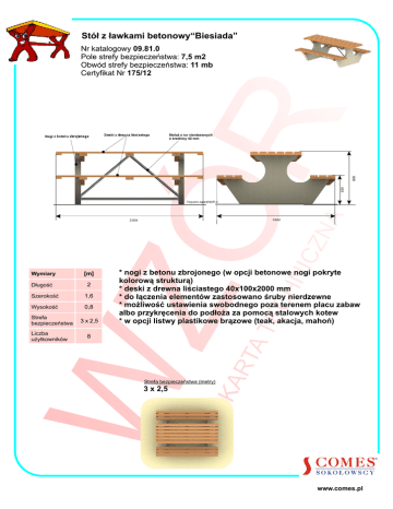 Stół z ławkami betonowy“Biesiada” Nr katalogowy 09.81.0 Pole strefy bezpieczeństwa: 7,5 m2 Obwód strefy bezpieczeństwa: 11 mb Certyfikat Nr 175/12 Deski z drewna liściastego Stelaż z rur nierdzewnych o średnicy 42 mm 430 8 00 Nogi z betonu zbrojonego Poziom nawierzchni 1600 2000 Wymiary [m] Długość 2 Szerokość 1,6 Wysokość 0,8 Strefa bezpieczeństwa Liczba użytkowników 3 x 2,5 * nogi z betonu zbrojonego (w opcji betonowe nogi pokryte kolorową strukturą) * deski z drewna liściastego 40x100x2000 mm * do łączenia elementów zastosowano śruby nierdzewne * możliwość ustawienia swobodnego poza terenem placu zabaw albo przykręcenia do podłoża za pomocą stalowych kotew * w opcji listwy plastikowe brązowe (teak, akacja, mahoń) 8 Strefa bezpieczeństwa (metry) 3 x 2,5 www.comes.pl