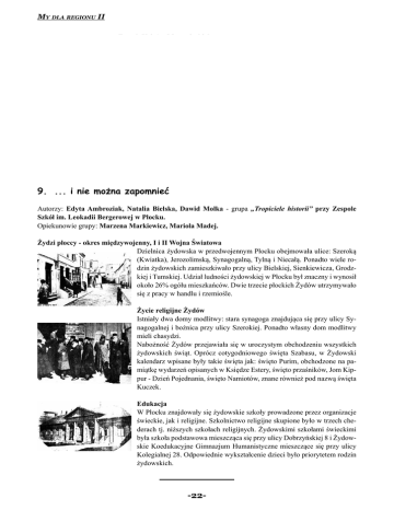 My dla regionu II Zamek Książąt Mazowieckich Historia budownictwa obronnego w dawnym Sochaczewie sięga XII stulecia, kiedy to na wysokiej polodowcowej skarpie rzecznej w południowej części miasta wzniesiony został drewniano - ziemny gród, prawdopodobnie pełniący później funkcję stolicy kasztelanii - ośrodka administracji państwowej w ówczesnej dzielnicy mazowieckiej. Gród ten istniał nie dłużej niż 100 - 130 lat, w roku 1286 bowiem został doszczętnie zniszczony przez najazd litewsko - ruski. Po tej dacie nastąpiła na wzgórzu przerwa osadnicza aż do czasów panowania księcia rawskiego Siemowita II (1283 - 1345), który zapewne tuż przed śmiercią ufundował murowany zamek, choć z braku wymaganych dla poparcia tej wersji wydarzeń dokumentów historycznych imię inwestora oraz podany wyżej termin budowy należy traktować jedynie jako jedną z hipotez - według innej wznoszenie warowni rozpoczął Siemowit III (1320 - 81), książę czerski, rawski i liwski, po śmierci rządzącego dotąd w Sochaczewie brata Kazimierza, czyli już po roku 1355. W okresie panowania książąt mazowieckich zamek miał niebagatelną wartość, zarówno militarną, jak i polityczną, czego świadectwem może być zorganizowanie właśnie w tym miejscu przez Siemowita III zjazdu wielmożów oraz książąt mazowieckich w 1377 roku i uchwalenie „statutów sochaczewskich”, czyli pierwszego pisanego zbioru praw dla całego Mazowsza. 9. ... i nie można zapomnieć Autorzy: Edyta Ambroziak, Natalia Bielska, Dawid Molka - grupa „Tropiciele historii” przy Zespole Szkół im. Leokadii Bergerowej w Płocku. Opiekunowie grupy: Marzena Markiewicz, Mariola Madej. Żydzi płoccy - okres międzywojenny, I i II Wojna Światowa Dzielnica żydowska w przedwojennym Płocku obejmowała ulice: Szeroką (Kwiatka), Jerozolimską, Synagogalną, Tylną i Niecałą. Ponadto wiele rodzin żydowskich zamieszkiwało przy ulicy Bielskiej, Sienkiewicza, Grodzkiej i Tumskiej. Udział ludności żydowskiej w Płocku był znaczny i wynosił około 26% ogółu mieszkańców. Dwie trzecie płockich Żydów utrzymywało się z pracy w handlu i rzemiośle. Życie religijne Żydów Istniały dwa domy modlitwy: stara synagoga znajdująca się przy ulicy Synagogalnej i bożnica przy ulicy Szerokiej. Ponadto własny dom modlitwy mieli chasydzi. Nabożność Żydów przejawiała się w uroczystym obchodzeniu wszystkich żydowskich świąt. Oprócz cotygodniowego święta Szabasu, w Żydowski kalendarz wpisane były takie święta jak: święto Purim, obchodzone na pamiątkę wydarzeń opisanych w Księdze Estery, święto przaśników, Jom Kippur - Dzień Pojednania, święto Namiotów, znane również pod nazwą święta Kuczek. Edukacja W Płocku znajdowały się żydowskie szkoły prowadzone przez organizacje świeckie, jak i religijne. Szkolnictwo religijne skupione było w trzech chederach tj. niższych szkołach religijnych. Żydowskimi szkołami świeckimi była szkoła podstawowa mieszcząca się przy ulicy Dobrzyńskiej 8 i Żydowskie Koedukacyjne Gimnazjum Humanistyczne mieszczące się przy ulicy Kolegialnej 28. Odpowiednie wykształcenie dzieci było priorytetem rodzin żydowskich. -22- My dla regionu II Martyrologia płockich Żydów Holokaust był najgorszym ze wszystkich żydowskich cierpień, które stały się udziałem Żydów. Od października do grudnia 1939 roku na skutek działań represyjnych prowadzonych przez Niemców, z Płocka wyjechało na wschód około 2 - 3 tys. Żydów. Wzorem innych miast polskich, w Płocku również organizowano getto, utworzone we wrześniu w 1940r., obejmowało ulicę: Kwiatka, Jerozolimską, Synagogalną, Tylną, Niecałą i fragment ulicy Bielskiej. W nocy z 20 na 21 lutego 1941r. Niemcy zapoczątkowali akcję wysiedlania Żydów z getta do obozów pracy i obozów koncentracyjnych. W sumie wysiedlono z Płocka około 7600 Żydów płockich i 3000 Żydów mieszkających w getcie, będących uciekinierami z innych miejscowości Mazowsza i ziemi dobrzyńskiej. 70% zamordowanych w czasie wojny mieszkańców Płocka stanowili Żydzi. Okres powojenny Z około 1000 płockich Żydów, którzy przeżyli wojnę, do Płocka powróciło około 300 osób. Pierwsze spotkanie Żydów płockich odbyło się w budynku bożnicy, przy ulicy Kwiatka, 22 lutego 1945r. uczestniczyły w nim 22 osoby. W październiku 1947 roku w Płocku mieszkało około 100 osób pochodzenia żydowskiego. Prawie wszyscy Żydzi wyjechali z Płocka w latach 1959 - 1960. Z całej przedwojennej społeczności żydowskiej, pozostały w Płocku, w 1959r, 3 osoby. -23-