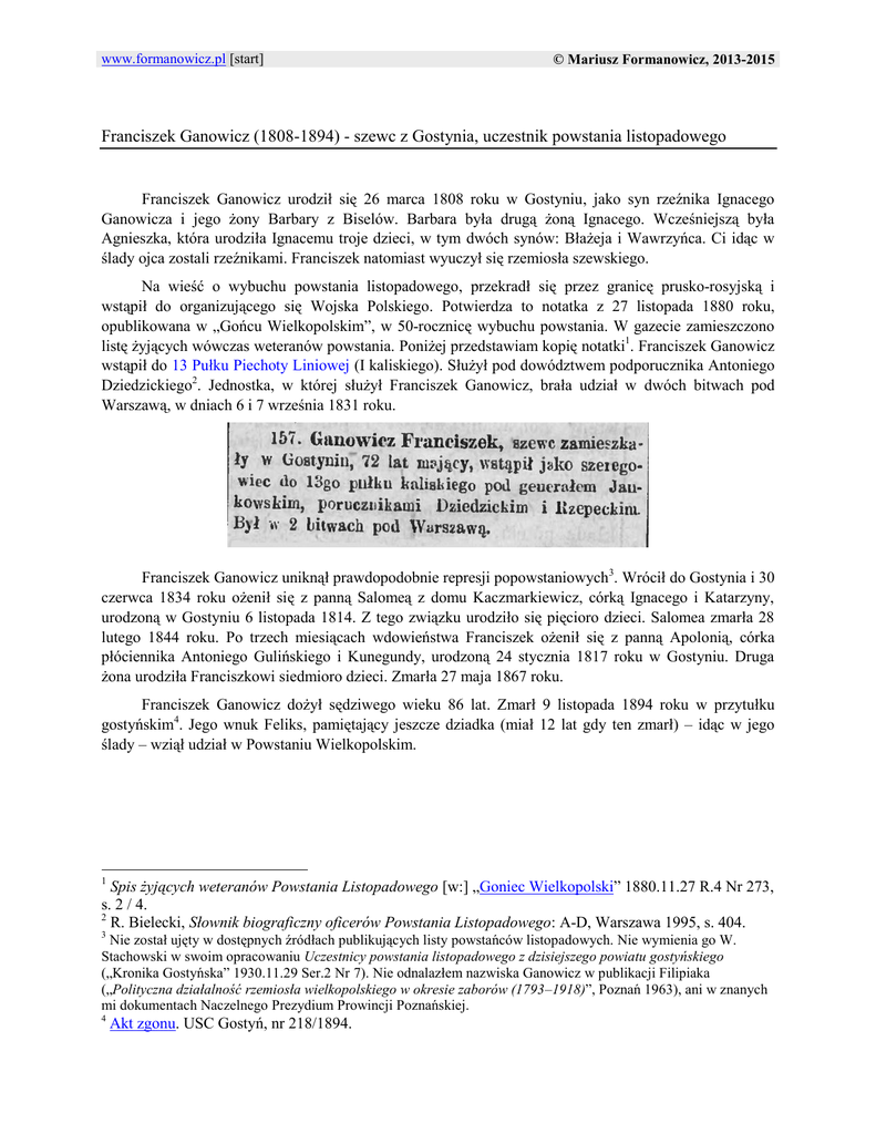 www.formanowicz.pl [start] © Mariusz Formanowicz, 2013-2015 Franciszek Ganowicz (1808-1894) - szewc z Gostynia, uczestnik powstania listopadowego Franciszek Ganowicz urodził się 26 marca 1808 roku w Gostyniu, jako syn rzeźnika Ignacego Ganowicza i jego żony Barbary z Biselów. Barbara była drugą żoną Ignacego. Wcześniejszą była Agnieszka, która urodziła Ignacemu troje dzieci, w tym dwóch synów: Błażeja i Wawrzyńca. Ci idąc w ślady ojca zostali rzeźnikami. Franciszek natomiast wyuczył się rzemiosła szewskiego. Na wieść o wybuchu powstania listopadowego, przekradł się przez granicę prusko-rosyjską i wstąpił do organizującego się Wojska Polskiego. Potwierdza to notatka z 27 listopada 1880 roku, opublikowana w „Gońcu Wielkopolskim”, w 50-rocznicę wybuchu powstania. W gazecie zamieszczono listę żyjących wówczas weteranów powstania. Poniżej przedstawiam kopię notatki1. Franciszek Ganowicz wstąpił do 13 Pułku Piechoty Liniowej (I kaliskiego). Służył pod dowództwem podporucznika Antoniego Dziedzickiego2. Jednostka, w której służył Franciszek Ganowicz, brała udział w dwóch bitwach pod Warszawą, w dniach 6 i 7 września 1831 roku. Franciszek Ganowicz uniknął prawdopodobnie represji popowstaniowych3. Wrócił do Gostynia i 30 czerwca 1834 roku ożenił się z panną Salomeą z domu Kaczmarkiewicz, córką Ignacego i Katarzyny, urodzoną w Gostyniu 6 listopada 1814. Z tego związku urodziło się pięcioro dzieci. Salomea zmarła 28 lutego 1844 roku. Po trzech miesiącach wdowieństwa Franciszek ożenił się z panną Apolonią, córka płóciennika Antoniego Gulińskiego i Kunegundy, urodzoną 24 stycznia 1817 roku w Gostyniu. Druga żona urodziła Franciszkowi siedmioro dzieci. Zmarła 27 maja 1867 roku. Franciszek Ganowicz dożył sędziwego wieku 86 lat. Zmarł 9 listopada 1894 roku w przytułku gostyńskim4. Jego wnuk Feliks, pamiętający jeszcze dziadka (miał 12 lat gdy ten zmarł) – idąc w jego ślady – wziął udział w Powstaniu Wielkopolskim. Spis żyjących weteranów Powstania Listopadowego [w:] „Goniec Wielkopolski” 1880.11.27 R.4 Nr 273, s. 2 / 4. 2 R. Bielecki, Słownik biograficzny oficerów Powstania Listopadowego: A-D, Warszawa 1995, s. 404. 1 3 Nie został ujęty w dostępnych źródłach publikujących listy powstańców listopadowych. Nie wymienia go W. Stachowski w swoim opracowaniu Uczestnicy powstania listopadowego z dzisiejszego powiatu gostyńskiego („Kronika Gostyńska” 1930.11.29 Ser.2 Nr 7). Nie odnalazłem nazwiska Ganowicz w publikacji Filipiaka („Polityczna działalność rzemiosła wielkopolskiego w okresie zaborów (1793–1918)”, Poznań 1963), ani w znanych mi dokumentach Naczelnego Prezydium Prowincji Poznańskiej. 4 Akt zgonu. USC Gostyń, nr 218/1894.