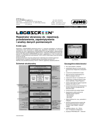 JUMO Sp. z o.o. M. K. JUCHHEIM GmbH & Co Adres biura: ul. Korfantego 28, 53-021 Wroclaw Adres centrali: Moeltkestrasse 13 - 31, 36039 Fulda, Germany internet: www.jumo.de Tel: (071) 339 82 39 Faks: (071) 339 73 79 E-Mail: [email protected] Internet: www.jumo.com.pl Karta katalogowa 95.5010 Strona 1/11 Rejestrator ekranowy do rejestracji, przedstawiania, zapami tywania i analizy danych pomiarowych Krótki opis Rejestrator LOGOSCREEN wyposa ony jest w 5,7"-kolorowy wy wietlacz, na którym s wskazywane dane pomiarowe w postaci cyfr, diagramów, barografów itp. W przeciwie stwie do innych rejestratorów LOGOSCREEN nie wymaga papieru rejestracyjnego. Dane pomiarowe s zapami tywane elektronicznie i mog by analizowane od razu jak i poprzez PC. Rejestrator LOGOSCREEN jest wewn. wyposa ony w 6 lub 12 wej pomiarowych a dzi ki systemowi automatyzacji JUMO mTRON liczba wej mo e by powi kszona do max.36. 8 wej pomiarowych mo e by poł czonych matematycznie modułem logicznym. Programowanie urz dzenia nast puje poprzez 8 przycisków lub przez PC. Wymiary ramy przedniej wynosz 144mm x 200mm, gł boko zabudowy 225mm. Typ 955010/ … Schemat strukturalny Szczególne wła ciwo ci Kolorowy ekran STN 320 x 240 pikseli, 27 kolorów dyskietka 3,5", 1,44 MB, 650.000 warto ci mierzonych k bez u ycia papieru i pisaków Dyskietka z danymi pomiarowymi, I konfiguracyjnymi; Konfiguracja poprzez dyskietk k wy wietlanie danych w formie pionowych/poziomych diagramów, barografów itp. k rozszerzone protokołownie wsadu Platyna CPU k dane pomiarowe zapami tanych w RAM s dost pne od razu Pami warto ci mierz. Wej cie SRAM; setup 350.000 warto ci mierzonych Pami robocza SRAM Konfiguracja poprzez Setup-Programm k zapisywanie danych na dyskietce 3,5" k konfiguracja urz dzenie poprzez klawiatur , dyskietk , Setup-Programm Wej cie RS232- lub RS422/485 k analiza zapami tanych danych poprzez program do analizy na PC dane procesowe dla mTRON k konwertowanie danych pomiarowych na formaty u ywane w programach do obliczanie tabel 6 wej odizolowanych galwanicznie przez transoptor odczyt danych procesowych Wej cie LON k funkcja szukania do analizy historii wtyk I Płyta wej k dopasowanie cyklów pami ci do ka dego procesu poprzez - tryb normalny - tryb zdarze - tryb czasu analog. 1 6 wej odizolowanych galwanicznie przez transoptor AC 48...63 Hz, 93...263 V lub AC/DC 18...30 V, 48...63 Hz 7 wej binarnych wtyk II analog. 1 4 przeka niki (zestyk zw./ zestyk rozw.), 1 wyj cie Open-Collector ( zestyk zw./zestyk rozw.); wyj cie napi cia 24 V/ 50 mA Płyta zasilacza Płyta I/O 1 przeka nik (zestyk przeł czny) k dowolnie programowalne wej cia dla termometrów oporowych, termoelementów, pr du stałego i napi cia stałego Dod atek do typu k Report warto ci min.,max., po rednich i integrator Płyta wej k szybko odczytu min. 125ms przy 12 wej ciach analogowych k przył cze PROFIBUS-DP- i Ethernet 9.00/ 00338203 M. K. JUCHHEIM GmbH & Co • 36035 Fulda, Germany Karta katalogowa 95.5010 Strona 2/11 Dane techniczne Wewn trzne wej cia analogowe (kanał1 … 12) termoelement Oznaczenie typ norma Fe-CuNi Fe-CuNi Cu-CuNi Cu-CuNi NiCr-Ni NiCr-CuNi NiCrSi-NiSi Pt10Rh-Pt Pt13Rh-Pt Pt30Rh-Pt6Rh „L“ „J“ „U“ „T“ „K“ „E“ „N“ „S“ „R“ „B“ DIN 43710 DIN EN 60584 DIN 43710 DIN EN 60584 DIN EN 60584 DIN EN 60584 DIN EN 60584 DIN EN 60584 DIN EN 60584 DIN EN 60584 najmniejsza rozpi to zakres pomiarowy -200 -210 -200 -270 -270 -270 -270 -50 -50 0 pomiarowa … … … … … … … … … … dokładno linearyzacji1 ±0,1 % ±0,1% od -100 °C ±0,1 % od -150°C ±0,1 % od -150°C ±0,1 % od -80 °C ±0,1 % od -80 °C ±0,1 % od -80 °C ±0,1 5% od 0°C ±0,15% od 0°C ±0,1 5% od 400 °C +900 °C +1200 °C +600 °C +400 °C +1372 °C +1000 °C +1300 °C +1768 °C +1768 °C 1820 °C Typ L, J, U, T, K, E, N: Typ S, R, B: pocz tek i koniec zakresu pomiarowego 100K 500K w granicach dowolnie programowalny w krokach 0,1 -K punkt odniesienia Pt 100 wewn. lub termostat zewn. stały dokł. punkt odniesienia (wewn.) ± 1K temp. punkt odniesienia (zewn.) -50 … +100 °C ustawiana poprzez Setup-Software cykl odczytu 6 lub 12 kanałów 125 ms filtr wej ciowy filtr cyfrowy 2. rz du; stała filtra ustawialna od 0 … 10,0 s napi cie probiercze 500 V (przez transoptor) rozdzielczo > 14 bit szczególne wła ciwo ci programowalny równie w °F 1. dokładno linearyzacji odnosi si do max. zakresu pomiarowego przy małych rozpi to ciach pom. zmniejsza si dokładno linearyzacji termometr oporowy Oznaczenie norma sposób podł cze- zakres pomiarowy nia dokładno Pt 100 DIN EN 60751 2/3-przew. 2/3-przew. 4-przew. 4-przew. -200 … +500°C -200 … +850°C -200 … +500°C -200 … +850°C ±0,4 K ±0,8 K ±0,4 K ±0,5 K 500 µA 250 µA 500 µA 250 µA 2/3-przew. 2/3-przew. 4-przew. 4-przew. -200 … +500°C -200 … +650°C -200 … +500°C -200 … +650°C ±0,4 K ±0,8 K ±0,4 K ±0,5 K 500 µA 250 µA 500 µA 250 µA Pt 100 JIS linearyzacji pr d mierzony Pt 500 DIN EN 60751 2/3-przew. 2/3-przew. 4-przew. 4-przew. -200 … +500°C -200 … +850°C -200 … +500°C -200 … +850°C ±0,4 K ±0,8 K ±0,4 K ±0,5 K 250 µA 250 µA 250 µA 250 µA Pt 1000 DIN EN 60751 2/3-przew. 2/3-przew. 4-przew. 4-przew. -200 … +500°C -200 … +850°C -200 … +500°C -200 … +850°C ±0,4 K ±0,8 K ±0,4 K ±0,5K 500 µA 250 µA 500 µA 250 µA Ni 100 DIN EN 60751 2/3-przew. 4-przew. -60 … +180°C -60 … +180°C ±0,4 K ±0,4 K 500 µA 500 µA sposób podł czenia 2-,3- lub 4-przew. najmniejsza rozpi to oporno pomiarowa przewodu czujnika pocz tek i koniec zakresu pomiarowego cykl odczytu filtr cyfrowy 2. rz du; stała filtra ustawialna od 0 … 10s napi cie probiercze 500V (przez transoptor) w granicach dowolnie programowalny w krokach 0,1 -K 6 lub 12 kanałów 125 ms filtr wej ciowy rozdzielczo 15 K max. 30 Ω na przewód w podł. 3/4-przew. max. 10Ω na przewód w podł. 2-przew. > 14bit szczególne wła ciwo ci 9.00/ 00338203 programowalny równie w
