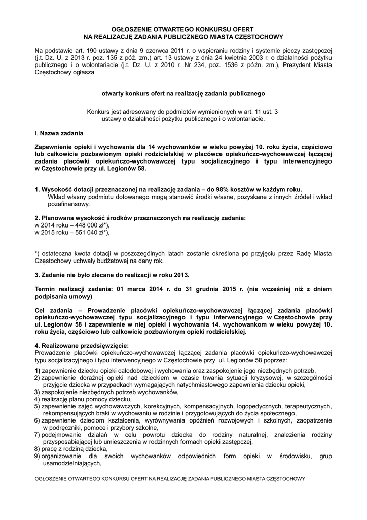 OGŁOSZENIE OTWARTEGO KONKURSU OFERT NA REALIZACJĘ ZADANIA PUBLICZNEGO MIASTA CZĘSTOCHOWY Na podstawie art. 190 ustawy z dnia 9 czerwca 2011 r. o wspieraniu rodziny i systemie pieczy zast ępczej (j.t. Dz. U. z 2013 r. poz. 135 z póź. zm.) art. 13 ustawy z dnia 24 kwietnia 2003 r. o działalności pożytku publicznego i o wolontariacie (j.t. Dz. U. z 2010 r. Nr 234, poz. 1536 z pó źn. zm.), Prezydent Miasta Częstochowy ogłasza otwarty konkurs ofert na realizację zadania publicznego Konkurs jest adresowany do podmiotów wymienionych w art. 11 ust. 3 ustawy o działalności pożytku publicznego i o wolontariacie. I. Nazwa zadania Zapewnienie opieki i wychowania dla 14 wychowanków w wieku powyżej 10. roku życia, częściowo lub całkowicie pozbawionym opieki rodzicielskiej w placówce opiekuńczo-wychowawczej łączącej zadania placówki opiekuńczo-wychowawczej typu socjalizacyjnego i typu interwencyjnego w Częstochowie przy ul. Legionów 58. 1. Wysokość dotacji przeznaczonej na realizację zadania – do 98% kosztów w każdym roku. Wkład własny podmiotu dotowanego mogą stanowić środki własne, pozyskane z innych źródeł i wkład pozafinansowy. 2. Planowana wysokość środków przeznaczonych na realizację zadania: w 2014 roku – 448 000 zł*), w 2015 roku – 551 040 zł*), *) ostateczna kwota dotacji w poszczególnych latach zostanie określona po przyjęciu przez Radę Miasta Częstochowy uchwały budżetowej na dany rok. 3. Zadanie nie było zlecane do realizacji w roku 2013. Termin realizacji zadania: 01 marca 2014 r. do 31 grudnia 2015 r. (nie wcześniej niż z dniem podpisania umowy) Cel zadania – Prowadzenie placówki opiekuńczo-wychowawczej łączącej zadania placówki opiekuńczo-wychowawczej typu socjalizacyjnego i typu interwencyjnego w Częstochowie przy ul. Legionów 58 i zapewnienie w niej opieki i wychowania 14. wychowankom w wieku powyżej 10. roku życia, częściowo lub całkowicie pozbawionym opieki rodzicielskiej. 4. Realizowane przedsięwzięcie: Prowadzenie placówki opiekuńczo-wychowawczej łączącej zadania placówki opiekuńczo-wychowawczej typu socjalizacyjnego i typu interwencyjnego w Częstochowie przy ul. Legionów 58 poprzez: 1) zapewnienie dziecku opieki całodobowej i wychowania oraz zaspokojenie jego niezbędnych potrzeb, 2) zapewnienie doraźnej opieki nad dzieckiem w czasie trwania sytuacji kryzysowej, w szczególności przyjęcie dziecka w przypadkach wymagających natychmiastowego zapewnienia dziecku opieki, 3) zaspokojenie niezbędnych potrzeb wychowanków, 4) realizację planu pomocy dziecku, 5) zapewnienie zajęć wychowawczych, korekcyjnych, kompensacyjnych, logopedycznych, terapeutycznych, rekompensujących braki w wychowaniu w rodzinie i przygotowujących do życia społecznego, 6) zapewnienie dzieciom kształcenia, wyrównywania opóźnień rozwojowych i szkolnych, zaopatrzenie w podręczniki, pomoce i przybory szkolne, 7) podejmowanie działań w celu powrotu dziecka do rodziny naturalnej, znalezienia rodziny przysposabiającej lub umieszczenia w rodzinnych formach opieki zastępczej, 8) pracę z rodziną dziecka, 9) organizowanie dla swoich wychowanków odpowiednich form opieki w środowisku, grup usamodzielniających, OGŁOSZENIE OTWARTEGO KONKURSU OFERT NA REALIZACJĘ ZADANIA PUBLICZNEGO MIASTA CZĘSTOCHOWY 10) wyposażenie wychowanków w: a) odzież, obuwie, bieliznę i inne przedmioty osobistego użytku, stosownie do wieku i indywidualnych potrzeb, b) zabawki odpowiednie do wieku rozwojowego, c) środki higieny osobistej, 11) wyżywienie dostosowane do potrzeb rozwojowych, kulturowych, religijnych oraz stanu zdrowia wychowanków, zaopatrzenie w środki spożywcze specjalnego przeznaczenia żywieniowego oraz wyroby medyczne wraz z pokryciem udziału środków własnych dziecka – do wysokości limitu przewidzianego w przepisach o świadczeniach opieki zdrowotnej finansowanych ze środków publicznych, 12) zapewnienie kwoty pieniężnej do własnego dysponowania wynikającej z obowiązujących przepisów. 5. Beneficjenci zadania: Dzieci i młodzież w wieku powyżej 10. roku życia. 6. Koszty pokrywane z dotacji: Wynagrodzenia pracowników wraz z pochodnymi od wynagrodzeń oraz bieżące wydatki rzeczowe związane z realizacją zadania. II. Zasady i warunki przyznania dotacji: 1. Dotowane mogą być tylko działania realizowane na rzecz dzieci i młodzieży, którym należy zapewnić doraźną opiekę na czas trwania sytuacji kryzysowej, oraz na rzecz dzieci i młodzieży częściowo lub całkowicie pozbawionych opieki rodzin naturalnych, z terenu miasta Częstochowy. Dotowane mogą być również działania na rzecz dzieci spoza terenu miasta Częstochowy na podstawie zawartych porozumień. 2. Podmioty uczestniczące w otwartym konkursie ofert i ubiegające się o dotację na realizację zadania powinny spełniać następujące warunki ogólne: 1) złożyć w terminie poprawnie i czytelnie wypełnioną ofertę, zgodnie z zasadami uczciwej konkurencji, gwarantującą wykonanie zadania w sposób efektywny, oszczędny i terminowy, 2) prowadzić działalność statutową w dziedzinie objętej konkursem, 3) dysponować kadrą legitymującą się odpowiednimi kwalifikacjami, zdolną do realizacji zadania, 4) nie posiadać zadłużenia wobec Gminy Miasta Częstochowy, 5) nie posiadać zadłużenia wobec Zakładu Ubezpieczeń Społecznych i Urzędu Skarbowego. Realizacja zadania będzie prowadzona w oparciu o zapisy zawarte w umowie oraz zaakceptowane przez Zleceniodawcę, zapisy w ofercie realizacji zadania publicznego. 3. Podmiot dotowany będzie zobowiązany do: 1) stosowania i przestrzegania przepisów ustawy z dnia 9 czerwca 2011 r. o wspieraniu rodziny i systemie pieczy zastępczej (j.t. Dz. U. z 2013 r. poz. 135 z późn. zm.), rozporządzenia Ministra Pracy i Polityki Społecznej z dnia 22 grudnia 2011 r. w sprawie instytucjonalnej pieczy zastępczej (Dz. U. Nr 292 poz. 1720) i innych przepisów mających za