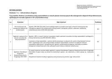 Załącznik do Uchwały nr 42/XIII/2016 Komitetu Monitorującego Regionalny Program Operacyjny Województwa Mazowieckiego na lata 2014-2020 z dnia 20 maja 2016 roku KRYTERIA DOSTĘPU Działanie 7.1. – Infrastruktura drogowa Typ projektu: Budowa i przebudowa dróg wojewódzkich w ramach planów inwestycyjnych dla subregionów objętych OSI problemowymi, spełniających warunki zapisane w UP. (tryb konkursowy) L.p. 1 Kryterium Plan inwestycyjny dla subregionów objętych OSI problemowymi Zgodnie z RPO WM 2014-2020, ocenie podlegać będzie czy projekt został ujęty w Planach inwestycyjnych dla subregionów objętych OSI problemowymi (ciechanowskim, ostrołęckim, płockim, radomskim, siedleckim), zatwierdzonych przez IZ RPO WM 2014-2020. Zgodność z zapisami UP w zakresie warunków dla dróg wojewódzkich Zgodnie z RPO w ramach kryterium sprawdzane będzie spełnianie warunków dla dróg wojewódzkich wynikających z Umowy Partnerstwa oraz RPO WM 2014 -2020 tj. Inwestycje w drogi wojewódzkie - wybrane odcinki pozwalające na włączenie do systemu dróg krajowych lub sieci TEN-T, wypełniające luki w sieci dróg pomiędzy ośrodkami wojewódzkimi, miastami nie będącymi stolicami województw (regionalnymi i subregionalnymi), zgodnie z przeprowadzoną diagnozą, wskazującą na problem dostępności transportowej tych miast, pełniących ważne funkcje w lokalnych rynkach pracy. 2 3. Opis kryterium Zgodnośc z Narodowym Programem Bezpieczeństwa Ruchu Drogowego 2013-2020 Punktacja 0/1 0/1 W ramach kryterium oceniana będzie zgodność z zapisami Narodowego Programeu Bezpieczeństwa Ruchu Drogowego 2013-2020. W opisie należy się odnieść do konkretnych zapisów ww. dokumentu, w które wpisuje się realizowany projekt. 0/1 Niespełnienie kryterium skutkuje negatywną oceną merytoryczną wniosku i jego odrzuceniem. 4. W projekcie przewidziano rozwiązania zapewniające bezpieczeństwo ruchu drogowego W ramach kryterium oceniane będzie czy projekt uwzględnia rozwiązania poprawiające bezpieczeństwo ruchu drogowego. Urządzenia bezpieczeństwa ruchu drogowego powinny być stosowane zgodnie z ustawą z dnia 20 czerwca 19997 r. Prawo o ruchu drogowym (Dz.U. z 2003 r. Nr 58 poz.515 z późn.zm. oraz potrzebami wynikającymi z ruchu na danej drodze. Niespełnienie kryterium skutkuje negatywną oceną merytoryczną wniosku i jego odrzuceniem. 0/1 KRYTERIA MERYTORYCZNE – SZCZEGÓŁOWE Działanie 7.1. – Infrastruktura drogowa Typ projektu: Budowa i przebudowa dróg wojewódzkich w ramach planów inwestycyjnych dla subregionów objętych OSI problemowymi, spełniających warunki zapisane w UP. (tryb konkursowy) L.p. Kryterium Opis kryterium W ramach kryterium ocenie podlegać będzie czy inwestycja jest projektem głównym w danej wiązce projektów. 1 2 Projekt główny Powiązanie z ważnymi elementami układu komunikacyjnego w województwie Ocena kryterium zostanie dokonana na podstawie informacji zawartych w Planach Działań RIT. Zgodnie z RPO WM 2014-2020 w ramach kryterium ocenie podlegać będzie poprawa bezpośredniego połączenia z infrastrukturą drogową lub kolejową sieci TEN-T. Ponadto premiowana będzie poprawa połączeń z portami lotniczymi, terminalami towarowymi lub platformami logistycznymi, istniejącymi lub nowymi terenami inwestycyjnymi. Punktacja Tak - 15 pkt. Brak spełnienia kryterium lub brak informacji w tym zakresie – 0 pkt. Maksymalna liczba punktów 15 Poprawa połączenia z węzłem drogowym na sieci TEN-T - 20 pkt.; 30 Poprawa połączenia z siecią dróg krajowych – 20 pkt.; Regulamin konkursu wskaże szczegółowe warunki określone w 2 interpretacji zapisów UP w zakresie zasad realizacji dróg lokalnych w ramach CT7 wydane przez Ministerstwo Rozwoju i Komisję Europejską. Poprawa połączenia ze zintegrowanym centrum przesiadkowym lub kolejowym dworcem pasażerskim leżącym na sieci TEN-T – 20 pkt.; Poprawa połączenia z istniejącymi lub nowymi terenami inwestycyjnymi – 15 pkt.; Poprawa połączenia z portem lotniczym – 5 pkt.; Poprawa połączenia z terminalami towarowymi lub platformami logistycznymi.– 5 pkt. Punkty w ramach kryterium sumują się, jednak ich suma nie może przekroczyć 30 pkt. Dostępność transportowa do ośrodków subregionalnych 3 Brak spełnienia kryterium lub brak informacji w tym zakresie – 0 pkt. Ocenie podlegać będzie czy: W ramach kryterium ocenie podlegać będzie lokalizacja realizowanego odcinka drogi na obszarze o zasięgu izochrony drogowej dojazdu do miast co najmniej subregionalnych na podstawie danych zawartych w raporcie końcowym z badania pn. „Ewaluacja wpływu Regionalnego Programu Operacyjnego Województwa Mazowieckiego 2007-2013 na spójność komunikacyjną i przestrzenną oraz wzrost konkurencyjności województwa mazowieckiego” z grudnia 2015 r. projekt realizowany będzie na obszarach powyżej 30 minut izochrony dostępności drogowej do miasta co najmniej subregionalnego w 2015 r. - 8 pkt.; 8 projekt realizowany będzie na 3 obszarach od 15 do 30 minut izochrony dostępności drogowej do miasta co najmniej subregionalnego w 2015 r. – 4 pkt.; projekt realizowany będzie na obszarach poniżej izochrony 15 minut dostępności drogowej do miasta co najmniej subregionalnego w 2015 r. – 0 pkt. Brak spełnienia kryterium lub brak informacji w tym zakresie – 0 pkt. 4 Kontynuacja ciągu drogowego Komplementarność z innymi inwestycjami W ramach kryterium ocenie podlegać będzie czy realizacja projektu stanowi bezpośrednie przedłużenie ciągu drogowego (inwestycji na drodze tej samej kategorii i o tym samym numerze lub inwestycji na innej drodze bezpośrednio przyjegającej do realizowanego odcinka) zrealizowanego w ostatnich latach (od 1 stycznia 2007 r.) lub znajdującego się w trakcie realizacji.1 W ramach kryterium ocenie podlegać będzie komplementarność z innymi infrastrukturalnymi inwestycjami publicznymi, już zrealizowanymi (od 1 stycznia 2007 r.) lub znajduj