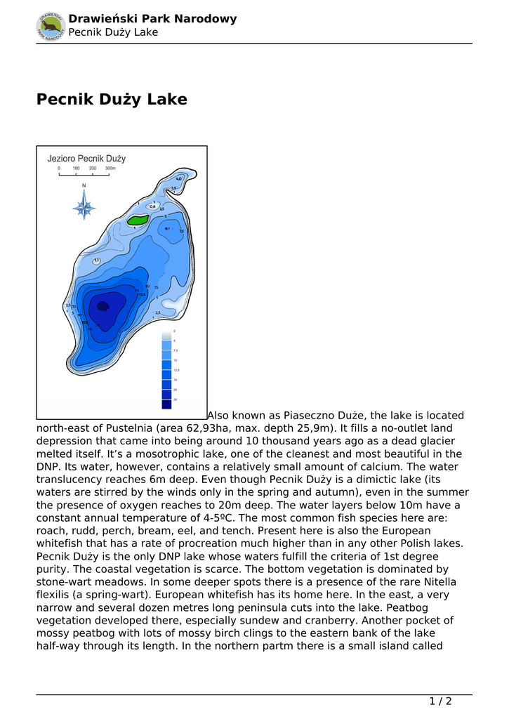 Drawieński Park Narodowy Pecnik Duży Lake Pecnik Duży Lake Also known as Piaseczno Duże, the lake is located north-east of Pustelnia (area 62,93ha, max. depth 25,9m). It fills a no-outlet land depression that came into being around 10 thousand years ago as a dead glacier melted itself. It’s a mosotrophic lake, one of the cleanest and most beautiful in the DNP. Its water, however, contains a relatively small amount of calcium. The water translucency reaches 6m deep. Even though Pecnik Duży is a dimictic lake (its waters are stirred by the winds only in the spring and autumn), even in the summer the presence of oxygen reaches to 20m deep. The water layers below 10m have a constant annual temperature of 4-5ºC. The most common fish species here are: roach, rudd, perch, bream, eel, and tench. Present here is also the European whitefish that has a rate of procreation much higher than in any other Polish lakes. Pecnik Duży is the only DNP lake whose waters fulfill the criteria of 1st degree purity. The coastal vegetation is scarce. The bottom vegetation is dominated by stone-wart meadows. In some deeper spots there is a presence of the rare Nitella flexilis (a spring-wart). European whitefish has its home here. In the east, a very narrow and several dozen metres long peninsula cuts into the lake. Peatbog vegetation developed there, especially sundew and cranberry. Another pocket of mossy peatbog with lots of mossy birch clings to the eastern bank of the lake half-way through its length. In the northern partm there is a small island called 1/2 Drawieński Park Narodowy Pecnik Duży Lake Trzcinowa Góra. There is a legend connected to that island that talks about a devil, who was to build a bridge on that lake for a fisherman’s soul. A narrow strip of land divides Pecnik Duży from Pecnik Mały. All is surrounded by beautiful pine fores. Data wydruku: 03.03.2017 16:53:02 Adres URL: http://dpn.pl/pecnik-duzy-lake 2/2 Powered by TCPDF (www.tcpdf.org)