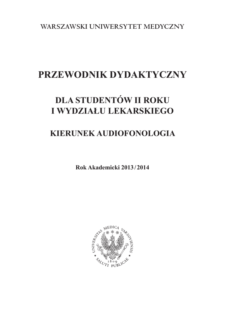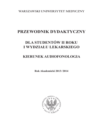 WARSZAWSKI UNIWERSYTET MEDYCZNY PRZEWODNIK DYDAKTYCZNY DLA STUDENTÓW II ROKU I WYDZIAŁU LEKARSKIEGO Kierunek AUDIOFONOLOGIA Rok Akademicki 2013 / 2014 Opracowanie edytorskie i druk: Oficyna Wydawnicza Warszawskiego Uniwersytetu Medycznego Zam. ..... / 2013 nakład 50 egz. tel. (22) 5720 327 e-mail: [email protected] www.oficynawydawnicza.wum.edu.pl Spis treści . WŁADZE WARSZAWSKIEGO UNIWERSYTETU MEDYCZNEGO..........3 . PODZIAŁ ROKU AKADEMICKIEGO 2013/2014.........................................4 3. SKŁAD ZARZĄDU SAMORZĄDU STUDENTÓW WUM W KADENCJI 2012-2014.................................................................................5 4. Plan studiów na rok akademicki 2013/2014.................................6 5. JĘZYK OBCY (do wyboru język angielski, francuski, niemiecki lub rosyjski)......... 9 6. WYCHOWANIE FIZYCZNE...........................................................................11 7. INFORMATYKA I TECHNOLOGIE INFORMACYJNE...............................13 8. METODOLOGIA BADAŃ NAUKOWYCH...................................................15 9. PSYCHOLOGIA...............................................................................................16 0. DEMOGRAFIA.................................................................................................17 . EPIDEMIOLOGIA............................................................................................18 . Nadzór Sanitarno-Epidemiologiczny..........................................20 3. ORGANIZACJA RATOWNICTWA MEDYCZNEGO....................................22 14. ŻYWIENIE CZŁOWIEKA...............................................................................23 15. ELEMENTY NAUKI O JĘZYKU....................................................................25 6. FONETYKA I FONOLOGIA JĘZYKA POLSKIEGO....................................26 17. Kultura żywego słowa........................................................................27 8. Rozwój mowy dziecka...........................................................................29 9. Metody wspomagające komunikację...........................................30 0. Wprowadzenie do neuropsychologii...........................................31 . BIOLOGICZNE PODSTAWY ZACHOWANIA..............................................34 . PSYCHOLOGIA OSÓB Z WADĄ SŁUCHU..................................................35 3. Wprowadzenie do Akustyki...............................................................36 24. Wprowadzenie do psychoakustyki...............................................38 25. BIOSTATYSTYKA...........................................................................................40 6. MIĘDZYNARODOWE PROBLEMY ZDROWIA..........................................41 27. PODSTAWY JĘZYKA MIGOWEGO..............................................................42 8. Wprowadzenie do logopedii..............................................................43 9. METODY BADANIA NARZĄDU SŁUCHU I PROCESU KOMUNIKATYWNEGO.................................................................................45 30. OCHRONA WŁASNOŚCI INTELEKTUALNEJ............................................46 3. Elementy nauki o języku....................................................................47 KIERUNEK AUDIOFONOLOGIA RAMOWY PROGRAM PRAKTYKI DLA STUDENTÓW II ROKU AUDIOFONOLOGII Po drugim roku studiów obowiązuje studentów 4 tygodniowa (20 dni roboczych) praktyka zawodowa w tym 2 tygodnie z protetyki słuchu oraz 2 tygodnie rehabilitacji słuchu równowagi i mowy. Termin, miejsce oraz harmonogram należy ustalić z Kierownikiem/Dyrektorem odpowiedniego ośrodka lub osobą wyznaczoną. Opiekunem praktyki są odpowiednie osoby wyznaczone przez kierowników jednostek. Nieobecność studenta w pracy może być usprawiedliwiona jedynie formalnym zwolnieniem lekarskim. Choroba dłuższa niż 1 tydzień powoduje konieczność przedłużenia praktyki o odpowiedni okres czasu. Odbycie praktyk potwierdza opiekun a praktykę zalicza Kierownik/Dyrektor jednostki. Celem praktyki jest: Zdobycie umiejętności prowadzenia diagnostyki dla pacjentów w procedurze dopasowywania aparatów słuchowych, wykonywania wkładek usznych, i kontroli ustawień aparatów słuchowych. Zaznajomienie z aparaturą służącą do kontroli ustawień aparatów słuchowych i ich dopasowania. Poznanie zasad i udział w prowadzeniu treningu słuchowego oraz rehabilitacji mowy u osób korzystających z aparatu słuchowego lub implantu ślimakowego. Udział w terapii habituacyjnej szumów usznych. Poznanie zasad i udział w rehabilitacji zaburzeń równowagi i zawrotów głowy. WŁADZE WARSZAWSKIEGO UNIWERSYTETU MEDYCZNEGO REKTOR – prof. dr hab. MAREK KRAWCZYK Prorektorzy PROREKTOR ds. DYDAKTYCZNO–WYCHOWAWCZYCH – prof. dr hab. MAREK KULUS PROREKTOR ds. NAUKI I WSPÓŁPRACY Z ZAGRANICĄ – prof. dr hab. SŁAWOMIR MAJEWSKI PROREKTOR ds. KLINICZNYCH, INWESTYCJI i współpracy z regionem – prof. dr hab. SŁAWOMIR NAZAREWSKI PROREKTOR ds. KADR – prof. dr hab. RENATA GÓRSKA DZIEKAN I WYDZIAŁU LEKARSKIEGO – prof. dr hab. MIROSŁAW WIELGOŚ Prodziekan I Wydziału Lekarskiego ds. I / II/ III r. – prof. dr hab. Barbara Górnicka Prodziekan I Wydziału Lekarskiego ds. IV / V / VI r. – prof. dr hab. Krzysztof Zieniewicz Prodziekan I Wydziału Lekarskiego ds. studiów licencjackich – prof. dr hab. Kazimierz Niemczyk Prodziekan I Wydziału Lekarskiego ds. Przewodów Doktorskich – dr hab. Paweł Włodarski Prodziekan I Wydziału Lekarskiego ds. Nauki – prof. dr hab. Krzysztof Filipiak WŁADZE UCZELNI urzędują w budynku przy ul. Żwirki i Wigury 61. Przewodniczący Rady Pedagogicznej II r. – dr n. med. Magdalena Lachowska Kierownik dziekanatu – mgr Joanna Kwiatkowska, tel. (22) 57 20 208, fax (22) 57 20 266, pok. 208. SEKRETARIAT I WYDZIAŁU LEKARSKIEGO Sprawy studenckie II r. studiów p. Iwona Dybowska, pok. 213 c, przyjmuje w poniedziałek, wtorek, czwartek, piątek w godz. 1030–1500