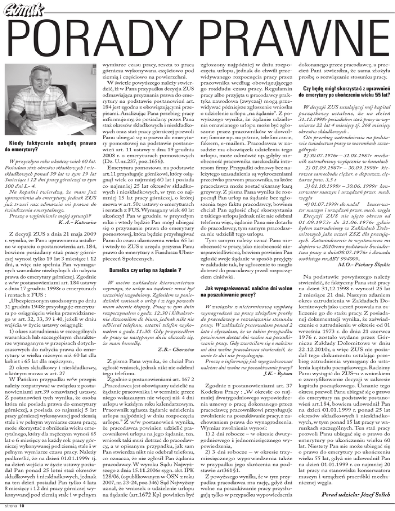 PORADY PRAWNE Kiedy faktycznie nabędę prawo do emerytury? W przyszłym roku ukończę wiek 60 lat. Posiadam staż okresów składkowych i nieskładkowych ponad 39 lat w tym 19 lat 3miesiące i 12 dni pracy górniczej w tym 100 dni L- 4. Na kopalni twierdzą, że mam już uprawnienia do emerytury, jednak ZUS już trzeci raz odmawia mi prawa do świadczenia emerytalnego. Proszę o wyjaśnienie mojej sytuacji? K. A.- Katowice Z decyzji ZUS z dnia 21 maja 2009 r. wynika, że Pana uprawnienia ustalono w oparciu o postanowienia art. 184, bowiem posiadany staż pracy górniczej wynosi tylko 19 lat 3 miesiące i 12 dni, a więc nie spełnia Pan wymaganych warunków niezbędnych do nabycia prawa do emerytury górniczej. Zgodnie z w/w postanowieniami art. 184 ustawy z dnia 17 grudnia 1998r o emeryturach i rentach z FUS : „Ubezpieczonym urodzonym po dniu 31 grudnia 1948r przysługuje emerytura po osiągnięciu wieku przewidzianego w art. 32, 33, 39 i 40, jeżeli w dniu wejścia w życie ustawy osiągnęli: 1) okres zatrudnienia w szczególnych warunkach lub szczególnym charakterze wymaganym w przepisach dotychczasowych do nabycia prawa do emerytury w wieku niższym niż 60 lat dla kobiet i 65 lat dla mężczyzn, 2) okres składkowy i nieskładkowy, o którym mowa w art. 27 W Pańskim przypadku w/w przepis należy rozpatrywać w związku z postanowieniami art.39 omawianej ustawy. Z postanowień tych wynika, że osoba która nie posiada prawa do emerytury górniczej, a posiada co najmniej 5 lat pracy górniczej wykonywanej pod ziemią stale i w pełnym wymiarze czasu pracy, może skorzystać z obniżenia wieku emerytalnego, który dla mężczyzn wynosi 65 lat o 6 miesięcy za każdy rok pracy górniczej wykonywanej pod ziemią stale i w pełnym wymiarze czasu pracy. Należy podkreślić, że na dzień 01.01.1999r tj. na dzień wejścia w życie ustawy posiadał Pan ponad 25 letni staż okresów składkowych i nieskładkowych, jednak na ten dzień posiadał Pan tylko 4 lata 8 miesięcy i 12 dni pracy górniczej wykonywanej pod ziemią stale i w pełnym strona 10 wymiarze czasu pracy, reszta to praca górnicza wykonywana częściowo pod ziemią i częściowo na powierzchni. W świetle powyższego należy stwierdzić, iż w Pana przypadku decyzja ZUS odmawiająca przyznania prawa do emerytury na podstawie postanowień art. 184 jest zgodna z obowiązującymi przepisami. Analizując Pana przebieg pracy informujemy, że posiadany przez Pana staż okresów składkowych i nieskładkowych oraz staż pracy górniczej pozwoli Panu ubiegać się o prawo do emerytury pomostowej na podstawie postanowień art. 11 ustawy z dna 19 grudnia 2008 r. o emeryturach pomostowych (Dz. U.nr.237, poz.1656). Emerytura pomostowa na podstawie art.11 przysługuje górnikowi, który osiągnął wiek co najmniej 60 lat i posiada co najmniej 25 lat okresów składkowych i nieskładkowych, w tym co najmniej 15 lat pracy górniczej, o której mowa w art. 50c ustawy o emeryturach i rentach z FUS. Wymagany wiek 60 lat ukończył Pan w grudniu w przyszłym roku i wtedy będzie Pan mógł ubiegać się o przyznanie prawa do emerytury pomostowej, która będzie przysługiwać Panu do czasu ukończenia wieku 65 lat i wtedy to ZUS z urzędu przyzna Panu prawo do emerytury z Funduszu Ubezpieczeń Społecznych. Bumelka czy urlop na żądanie ? W moim zakładzie kierownictwo wymaga, że urlop na żądanie musi być wcześniej uzgodniony. Zgłosiłem w poniedziałek wniosek o urlop i z tego powodu mam obecnie kłopoty. Pracę w tym dniu rozpoczynałem o godz. 12:30 i kilkakrotnie dzwoniłem do biura, jednak nikt nie odbierał telefonu, ostatni telefon wykonałem o godz.11:30. Gdy przyszedłem do pracy w następnym dniu okazało się, że mam bumelkę. Z.B.- Chorzów Z pisma Pana wynika, że chciał Pan zgłosić wniosek, jednak nikt nie odebrał tego telefonu. Zgodnie z postanowieniami art. 167 2 „Pracodawca jest obowiązany udzielić na żądanie pracownika i w terminie przez niego wskazanym nie więcej niż 4 dni urlopu w każdym roku kalendarzowym. Pracownik zgłasza żądanie udzielenia urlopu najpóźniej w dniu rozpoczęcia urlopu.” Z w/w postanowień wynika, że pracodawca powinien udzielić pracownikowi urlopu na jego żądanie, tzn. wniosek taki musi dotrzeć do pracodawcy, a w opisanym przypadku, jak sam Pan stwierdza nikt nie odebrał telefonu, co oznacza, że nie zgłosił Pan żądania pracodawcy. W wyroku Sądu Najwyższego z dnia 15.11.2006r sygn. akt. IPK 128/06, (opublikowanym w OSN z roku 2007, nr. 23-24, poz.346) Sąd Najwyższy uznał, że wniosek o udzielenie urlopu na żądanie (art.1672 Kp) powinien być zgłoszony najpóźniej w dniu rozpoczęcia urlopu, jednak do chwili przewidywanego rozpoczęcia pracy przez pracownika według obowiązującego go rozkładu czasu pracy. Regulamin pracy albo przyjęta u pracodawcy praktyka zawodowa (zwyczaj) mogą przewidywać późniejsze zgłoszenie wniosku o udzielenie urlopu „na żądanie”. Z powyższego wynika, że żądanie udzielenia omawianego urlopu może być zgłoszone przez pracowników w dowolnej formie np. na piśmie, telefonicznie, faksem, e-mailem. Pracodawca w zasadzie ma obowiązek udzielenia tego urlopu, może odmówić np. gdyby nieobecność pracownika zaszkodziła interesom firmy. Przypadki odmowy bez należytego uzasadnienia są wykroczeniami przeciwko prawom pracownika, za które pracodawca może zostać ukarany karą grzywny. Z pisma Pana wynika że rozpoczął Pan urlop na żądanie bez zgłoszenia tego faktu pracodawcy, bowiem chciał Pan zgłosić chęć skorzystania z takiego urlopu jednak nikt nie odebrał telefonu więc, żądanie Pana nie dotarło do pracodawcy, tym samym pracodawca nie udzielił tego urlopu. Tym samym należy uznać Pana nieobecność w pracy, jako nieobecność nieusprawiedliwioną, bowiem powinien Pan zgłosić swoje żądanie w sposób przyjęty w zakładzie tak, by zgłoszenie to mogło dotrzeć do pracodawcy przed rozpocz
