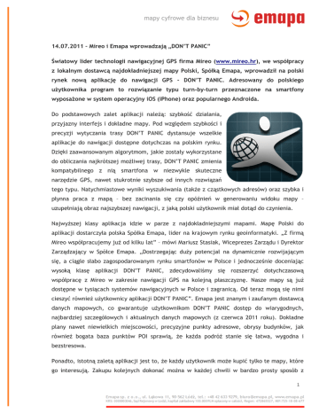 mapy cyfrowe dla biznesu 14.07.2011 – Mireo i Emapa wprowadzają „DON’T PANIC” Światowy lider technologii nawigacyjnej GPS firma Mireo (www.mireo.hr), we współpracy z lokalnym dostawcą najdokładniejszej mapy Polski, Spółką Emapa, wprowadził na polski rynek nową aplikację do nawigacji GPS - DON’T PANIC. Adresowany do polskiego użytkownika program to rozwiązanie typu turn-by-turn przeznaczone na smartfony wyposażone w system operacyjny iOS (iPhone) oraz popularnego Androida. Do podstawowych zalet aplikacji należą: szybkość działania, przyjazny interfejs i dokładne mapy. Pod względem szybkości i precyzji wytyczania trasy DON’T PANIC dystansuje wszelkie aplikacje do nawigacji dostępne dotychczas na polskim rynku. Dzięki zaawansowanym algorytmom, jakie zostały wykorzystane do obliczania najkrótszej możliwej trasy, DON’T PANIC zmienia kompatybilnego z nią smartfona w niezwykle skuteczne narzędzie GPS, nawet stukrotnie szybsze od innych rozwiązań tego typu. Natychmiastowe wyniki wyszukiwania (także z cząstkowych adresów) oraz szybka i płynna praca z mapą – bez zacinania się czy opóźnień w generowaniu widoku mapy – uzupełniają obraz najszybszej nawigacji, z jaką polski użytkownik miał dotąd do czynienia. Najwyższej klasy aplikacja idzie w parze z najdokładniejszymi mapami. Mapę Polski do aplikacji dostarczyła polska Spółka Emapa, lider na krajowym rynku geoinformatyki. „Z firmą Mireo współpracujemy już od kilku lat” – mówi Mariusz Stasiak, Wiceprezes Zarządu i Dyrektor Zarządzający w Spółce Emapa. „Dostrzegając duży potencjał na dynamicznie rozwijającym się, a ciągle słabo zagospodarowanym rynku smartfonów w Polsce i jednocześnie doceniając wysoką klasę aplikacji DON’T PANIC, zdecydowaliśmy się rozszerzyć dotychczasową współpracę z Mireo w zakresie nawigacji GPS na kolejną płaszczyznę. Nasze mapy są już dostępne w tysiącach systemów nawigacyjnych w Polsce i zagranicą. Od teraz mogą się nimi cieszyć również użytkownicy aplikacji DON’T PANIC”. Emapa jest znanym i zaufanym dostawcą danych mapowych, co gwarantuje użytkownikom DON’T PANIC dostęp do wiarygodnych, najbardziej szczegółowych i aktualnych danych mapowych (z czerwca 2011 roku). Dokładne plany nawet niewielkich miejscowości, precyzyjne punkty adresowe, obrysy budynków, jak również bogata baza punktów POI sprawią, że każda podróż stanie się łatwa, wygodna i bezstresowa. Ponadto, istotną zaletą aplikacji jest to, że każdy użytkownik może kupić tylko te mapy, które go interesują. Zakupu kolejnych dokonać można w każdej chwili w bardzo prosty sposób z 1 mapy cyfrowe dla biznesu poziomu aplikacji. Dzięki mapom offline, dostępnym na terenie danego kraju razem z aplikacją, posiadanie bezprzewodowego dostępu do sieci czy pokrywanie kosztów roamingu nie są konieczne. DON’T PANIC to aplikacja dotykowa, całkowicie zintegrowana z ruchami palców, która umożliwia użytkownikom swobodne i wygodne przesuwanie, powiększanie i obracanie map. Przejrzysty i funkcjonalny interfejs użytkownika został zaprojektowany tak, aby uczynić pracę z nawigacją tak intuicyjną, jak to tylko możliwe. „Nasi inżynierowie sięgnęli po kreatywne rozwiązania, aby stworzyć najszybszą, najbardziej inteligentną i najprostszą w użytkowaniu aplikację GPS na rynku. Razem z naszym partnerem, firmą Emapa, stworzyliśmy doskonałą ofertę dla klientów z Polski” - mówi Leonardo Siladić, dyrektor generalny w Mireo. Aplikacja w wersji dla użytkowników iPhone’ów jest dostępna w App store na stronie: http://itunes.apple.com/pl/app/mireo-dont-panic-poland/id441719762?mt=8. Wersję obsługującą system Android można znaleźć natomiast w Android Market: https://market.android.com/details?id=hr.mireo.dp. Przykładowe zrzuty programu: 2 mapy cyfrowe dla biznesu ### Kontakt dla mediów: Marcin Maroszek Menedżer Działu Marketingu [email protected] tel. kom.: +48 693 356 128 INFORMACJE DODATKOWE: Emapa Spółka Emapa powstała w 2001 roku jako spółka-córka firmy Cartall – jednego z najdłużej działających w Polsce Wydawnictw Multimedialnych. Celem Spółki Emapa od samego początku było zaspokojenie coraz bardziej wyspecjalizowanych potrzeb klientów w zakresie profesjonalnych systemów logistycznych i systemów informacji przestrzennej oraz wysokiej jakości map cyfrowych. Efektem pracy zespołu specjalistów GIS jest rodzina systemów Emapa, tworzonych przy uwzględnieniu specyfiki poszczególnych branż. Asortyment Spółki Emapa obejmuje same dane cyfrowe (najdokładniejsza mapa Polski, kompletna mapa Europy i przejazdowa mapa Azji), zaawansowaną technologię umożliwiającą ich wykorzystywanie zgodnie z potrzebami Klienta (serwer MapCenter), jednostanowiskowe aplikacje do profesjonalnego wytyczania tras, współpracy z monitoringiem (Emapa Transport+, Emapa Transport Europa, Emapa Transport+ Europa) analiz geoprzestrzennych (Emapa GeoMarketing) oraz ich sieciowe odpowiedniki (seria GeoNet). Priorytetem biznesowym Emapy są zaawansowane technologicznie rozwiązania dla wymagającego klienta biznesowego. Więcej informacji o firmie można uzyskać na stronie www.emapa.pl. 3