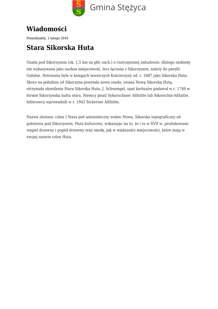 Wiadomości Poniedziałek, 1 lutego 2016 Stara Sikorska Huta Osada pod Sikorzynem (ok. 1,5 km na płd.-zach.) o roztrzęsionej zabudowie, dlatego niekiedy nie wykazywana jako osobna miejscowość, lecz łączona z Sikorzynem, należy do parafii Gołubie. Notowana była w księgach ławniczych Kościerzyny od. r. 1687 jako Sikorska Huta. Skoro na południu od Sikorzyna powstała nowa osada, zwana Nową Sikorską Hutą, otrzymała określenie Stara Sikorska Huta. J. Schwengel, opat kartuzów podawał w r. 1749 w formie Sikorzynska hutta stara. Niemcy pisali Sykorschiner Althiitte lub Sikorschin-Althiitte, hitlerowcy wprowadzili w r. 1942 Sickerner Althiitte. Nazwa złożona: człon I Stara jest antonimiczny wobec Nowa, Sikorska topograficzny od położenia pod Sikorzynem, Huta kulturowy, wskazując na to, że i tu w XVII w. produkowano węgiel drzewny i popiół drzewny oraz smołę, jak w większości miejscowości, które mają w swojej nazwie człon Huta.
