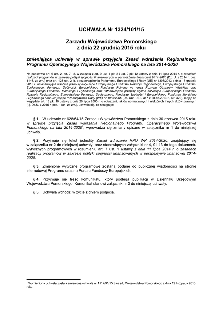 UCHWAŁA Nr 1324/101/15 Zarządu Województwa Pomorskiego z dnia 22 grudnia 2015 roku zmieniająca uchwałę w sprawie przyjęcia Zasad wdrażania Regionalnego Programu Operacyjnego Województwa Pomorskiego na lata 2014-2020 Na podstawie art. 6 ust. 2, art. 7 i 8, w związku z art. 9 ust. 1 pkt 2 i ust. 2 pkt 12 ustawy z dnia 11 lipca 2014 r. o zasadach realizacji programów w zakresie polityki spójności finansowanych w perspektywie finansowej 2014-2020 (Dz. U. z 2014 r. poz. 1146, ze zm.) oraz art. 125 ust. 2 lit. c rozporządzenia Parlamentu Europejskiego i Rady (UE) nr 1303/2013 z dnia 17 grudnia 2013 r. ustanawiające wspólne przepisy dotyczące Europejskiego Funduszu Rozwoju Regionalnego, Europejskiego Funduszu Społecznego, Funduszu Spójności, Europejskiego Funduszu Rolnego na rzecz Rozwoju Obszarów Wiejskich oraz Europejskiego Funduszu Morskiego i Rybackiego oraz ustanawiające przepisy ogólne dotyczące Europejskiego Funduszu Rozwoju Regionalnego, Europejskiego Funduszu Społecznego, Funduszu Spójności i Europejskiego Funduszu Morskiego i Rybackiego oraz uchylające rozporządzenie Rady (WE) nr 1083/2006 (Dz. Urz. UE L 347 z 20.12.2013 r., str. 320), mając na względzie art. 13 pkt 10 ustawy z dnia 20 lipca 2000 r. o ogłaszaniu aktów normatywnych i niektórych innych aktów prawnych (t.j. Dz.U. z 2015 r, poz. 1484, ze zm.), uchwala się, co następuje: § 1. W uchwale nr 628/54/15 Zarządu Województwa Pomorskiego z dnia 30 czerwca 2015 roku w sprawie przyjęcia Zasad wdrażania Regionalnego Programu Operacyjnego Województwa 1 Pomorskiego na lata 2014-2020 , wprowadza się zmiany opisane w załączniku nr 1 do niniejszej uchwały. § 2. Przyjmuje się tekst jednolity Zasad wdrażania RPO WP 2014-2020, znajdujący się w załączniku nr 2 do niniejszej uchwały, oraz stanowiących załączniki nr 4, 9 i 13 do tego dokumentu wytycznych programowych w rozumieniu art. 7 ust. 1 ustawy z dnia 11 lipca 2014 r. o zasadach realizacji programów w zakresie polityki spójności finansowanych w perspektywie finansowej 20142020. § 3. Zmienione wytyczne programowe zostaną podane do publicznej wiadomości na stronie internetowej Programu oraz na Portalu Funduszy Europejskich. § 4. Przyjmuje się treść komunikatu, który podlega publikacji w Dzienniku Urzędowym Województwa Pomorskiego. Komunikat stanowi załącznik nr 3 do niniejszej uchwały. § 5. Uchwała wchodzi w życie z dniem podjęcia. 1 Wymieniona uchwała została zmieniona uchwałą nr 1117/91/15 Zarządu Województwa Pomorskiego z dnia 12 listopada 2015 roku. UZASADNIENIE Zarząd Województwa Pomorskiego, jako Instytucja Zarządzająca Regionalnym Programem Operacyjnym Województwa Pomorskiego na lata 2014-2020 (zwana dalej: IZ RPO WP 2014-2020), 2 zobowiązany jest, w świetle art. 125 ust. 2 lit. c rozporządzenia ogólnego , między innymi do zapewnienia instytucjom zaangażowanym we wdrażanie Programu oraz beneficjentom właściwych informacji, które są istotne dla wykonywania ich zadań i realizacji projektów. Z uwagi na ogólny charakter zapisów RPO WP 2014-2020 konieczne jest przygotowanie dodatkowych dokumentów przedstawiających szczegółowo sposób wdrażania Programu. Jednym z tych dokumentów są Zasady wdrażania RPO WP 2014-2020 – przyjęte uchwałą nr 628/54/15 Zarządu Województwa Pomorskiego z dnia 30 czerwca 2015 r. i zmienione ostatnio uchwałą nr 1117/91/15 z dnia 12 listopada 2015 r. – stanowiące zbiór wszystkich niezbędnych informacji dla potencjalnych beneficjentów chcących pozyskać wsparcie w ramach RPO WP 20142020. Ich podstawowym celem jest uszczegółowienie metod wdrażania RPO WP 2014-2020, w tym reguł przygotowania wniosków o dofinansowanie projektów, ich naboru i oceny, zawierania umów oraz realizacji i rozliczenia projektów podlegających wsparciu ze środków Programu. Dodatkowo zawierają one rekomendacje, zalecenia oraz interpretacje postanowień dokumentów oraz aktów prawnych regulujących sposób wdrażania Programu, dokonane przez IZ RPO WP 2014-2020. Należy zatem uznać, że dokument ten ma charakter poradnika dla wnioskodawców i beneficjentów Programu, a IZ RPO WP 2014-2020 zaleca zapoznanie się z jego zapisami, ponieważ to na ich podstawie formułowane będą postanowienia regulaminów konkursów oraz wezwań do złożenia wniosków w ramach naborów prowadzonych w trybie pozakonkursowym. W myśl przepisów art. 7 ust. 1 ustawy z dnia 11 lipca 2014 r. o zasadach realizacji programów w zakresie polityki spójności finansowanych w perspektywie finansowej 2014-2020 (zwanej dalej: ustawą wdrożeniową), IZ RPO WP 2014-2020 może także wydać wytyczne programowe dotyczące kwestii szczegółowych Programu, doprecyzowujące oraz uzupełniające warunki i procedury określone w wytycznych horyzontalnych opublikowanych przez ministra właściwego do spraw rozwoju regionalnego. Zgodnie z art. 6 ust. 2 ustawy wdrożeniowej to m.in. wytyczne horyzontalne i programowe stanowią podstawę systemu realizacji programu operacyjnego. Załączniki nr 4, 9 i 13 do Zasad wdrażania RPO WP 2014-2020 – na podstawie których instytucje udzielające dofinansowania na realizację projektów będą dokonywać oceny kwalifikowalności wydatków i prawidłowości udzielania zamówień publicznych przez beneficjentów oraz zgodności programowanych przedsięwzięć rewitalizacyjnych z celami i wymogami Programu – mają status wytycznych programowych. Do stosowania tych wytycznych IZ RPO WP 2014-2020 zobowiązuje beneficjentów Programu postanowieniami umowy o dofinansowanie albo decyzji o dofinansowaniu projektu oraz instytucje pośredniczące we wdrażaniu wybranych Działań i Poddziałań RPO WP 20142020 na mocy podpisanych z nimi umów lub porozumień. Obecnie, z uwagi na zaplanowane do ogłoszenia w IV kwartale bieżącego roku konkursy w ramach Poddziałania 1.1.1 Ekspansja przez innowacje – wsparcie dotacyjne i 2.2.1 Inwestycje profilowane – wsparcie d