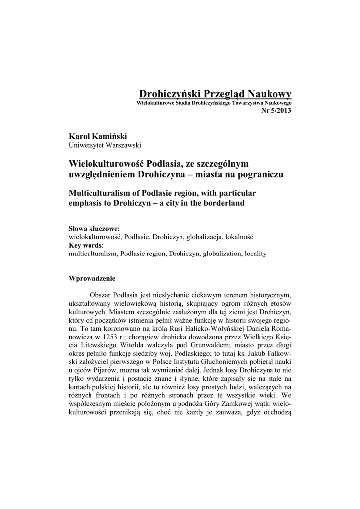 Drohiczyński Przegląd Naukowy Wielokulturowe Studia Drohiczyńskiego Towarzystwa Naukowego Nr 5/2013 Karol Kamiński Uniwersytet Warszawski Wielokulturowość Podlasia, ze szczególnym uwzględnieniem Drohiczyna – miasta na pograniczu Multiculturalism of Podlasie region, with particular emphasis to Drohiczyn ‒ a city in the borderland Słowa kluczowe: wielokulturowość, Podlasie, Drohiczyn, globalizacja, lokalność Key words: multiculturalism, Podlasie region, Drohiczyn, globalization, locality Wprowadzenie Obszar Podlasia jest niesłychanie ciekawym terenem historycznym, ukształtowany wielowiekową historią, skupiający ogrom różnych etosów kulturowych. Miastem szczególnie zasłużonym dla tej ziemi jest Drohiczyn, który od początków istnienia pełnił ważne funkcję w historii swojego regionu. To tam koronowano na króla Rusi Halicko-Wołyńskiej Daniela Romanowicza w 1253 r.; chorągiew drohicka dowodzona przez Wielkiego Księcia Litewskiego Witolda walczyła pod Grunwaldem; miasto przez długi okres pełniło funkcję siedziby woj. Podlaskiego; to tutaj ks. Jakub Falkowski założyciel pierwszego w Polsce Instytutu Głuchoniemych pobierał nauki u ojców Pijarów, można tak wymieniać dalej. Jednak losy Drohiczyna to nie tylko wydarzenia i postacie znane i słynne, które zapisały się na stałe na kartach polskiej historii, ale to również losy prostych ludzi, walczących na różnych frontach i po różnych stronach przez te wszystkie wieki. We współczesnym mieście położonym u podnóża Góry Zamkowej wątki wielokulturowości przenikają się, choć nie każdy je zauważa, gdyż odchodzą 234 Karol Kamiński w zapomnienie, co nie znaczy że nie istnieją ani nie istniały. Drohiczyn i ziemia podlaska stoi przed wyzwaniem „przetrwania”, w nowoczesnym czy też ponowoczesnym świecie, zachowania swojej tożsamości i historii, a w dobie globalizacji może okazać się to trudne lecz nie niewykonalne. Drohiczyn – zarys historyczny1 Etymologia słowa Drohiczyn nie jest do końca znana, jednak: Legenda mówi, że jakiś Drogita założył ten gród. Inni mówią, że było plemię nad Dnieprem. Są językoznawcy, a wśród nich Stanisław Rosłond, który powiada, że ludy bałtyjskie miały nazwę – darges – droga. Drohiczyn to najpewniej miasto na drodze. Na jakiej drodze. Na szlaku podróży, bo wtedy Podlasie było bezmiarem puszczy, najłatwiej było poruszać się rzekami. A Bug to przecież ówczesna autostrada, Bugiem się płynęło, Bugiem woziło towary, przemieszczali się wojowie, kupcy, duchowni. A na tej drodze było miasto Drohiczyn. Ta nazwa miasto na drodze ma uzasadnienie tak, że Drohiczyn stał na zawadzie i obce plemiona, które tutaj podbijały, niszczyły, paliły Drohiczyn. On się jednak odradzał jak Feniks z popiołów – o tym napisze Franciszek Gaudenty Żera w jednej ze swoich książek znajdującej się w rękopisie w bibliotece wileńskiej2. Aby zrozumieć fenomen Drohiczyna, „miasta na drodze”, należy prześledzić jego dzieje ze szczególnym uwzględnieniem zmian terytorialnych i przynależności miasta do poszczególnych bytów politycznych. Pogranicze polsko-ruskie W średniowieczu na obecnych terenach Podlasia mieliśmy do czynienia zarówno z osadnictwem mazowieckim jak i ruskim. Grody pełniły funkcje polityczno-administracyjne, mazowieckie założono w Łomży, Wiźnie, Tykocinie i Święcku, natomiast ruskie osadnictwo grodowe powstało w Drohiczynie, Bielsku, Brańsku i Surażu3. Osadnictwo to datowane jest na 1 W rozdziale tym prezentuję skrótową historię Drohiczyna. Szerzej o tym zagadnieniu patrz w: F. Z. Weremiej Stolica Jaćwieży: monografia miasta Drohiczyna nad Bugiem w zarysie historycznym, Drohiczyn 1938. 2 Urszula Tomasik, opracowanie własne na przykładach tekstu z konferencji naukowej ks. infułata Eugeniusza Borowskiego. [w:] Strona Internetowa Urzędu Miejskiego w Drohiczynie: http://www.drohiczyn.pl/index.php?id=11 3 Marcin Kamiński, Między Koroną a Wielkim Księstwem Litewskim. Historia Ziemi Podlaskiej ze szczególnym uwzględnieniem Ziemi Drohickiej, [w:] Disputatio, Perspektywa Wschodnia, Tom X, Gdańsk 2010, s. 99. Wielokulturowość Podlasia, ze szczególnym uwzględnieniem Drohiczyna… 235 IX w n. e., ale wcześniejszymi dziejami tych ziem nie będziemy się w tekście zajmować. W roku 960 ziemie Piastów obejmowały: Wielkopolskę, Kujawy, ziemie lubuską, Sandomierszczyznę, ziemię Sieradzko-Łęczycką, Mazowsze, Pomorze Gdańskie i Grody Czerwieńskie. W 1018 r. Bolesław Chrobry zajął Grody Czerwieńskie i rejon Brześcia (wraz z miastem), a utracił Morawy i Słowacczyznę, tym samym linia rzeki Bug stała się granicą ziem piastowskich na kolejnych pięć lat, a po drugiej stronie rzeki Bug był położony Drohiczyn. W 1047 r. teren Podlasia Drohickiego uzyskał Jarosław Mądry w wyniku sojuszu z Kazimierzem Odnowicielem przeciwko władcy Mazowsza – Masławowi4, który w wyniku buntu około 1037 r. przejął władze nad tym regionem. W 1142 roku gród drohicki należał do Wsiewołoda Olegowicza, o tej wzmiance możemy przeczytać w tzw. Latopisie Kijowskim. Drohiczyn w XII wieku wchodził w skład ziemi brzeskodrohickiej, znajdującej się pod zwierzchnictwem ruskim5. W tamtym okresie był częścią nadbużańskiego szlaku handlowego łączącego Gdańsk – Toruń – Płock – Drohiczyn – Brześć Litewski i który dalej rozwidla się do Horodła – Włodzimierza lub Chełma albo przez Prypeć i Dniepr do Kijowa, co potwierdzają latopisy6. Następne 40 lat historii Drohiczyna nie są znane7. Leszek Mazowiecki udziela pomocy zbrojnej Wasylowi Jaropełkowi przed napaścią ze strony księcia mińskiego, za co w zamian w roku 1172 otrzymał Drohiczyn. Po bezpotomnej śmierci Leszka Mazowieckiego gród trafia w ręce Kazimierza Sprawiedliwego, który musiał walczyć o tę ziemię w roku 1190 z Jadźwingami. Po Kazimierzu gród ten otrzymał w 1230 r.
