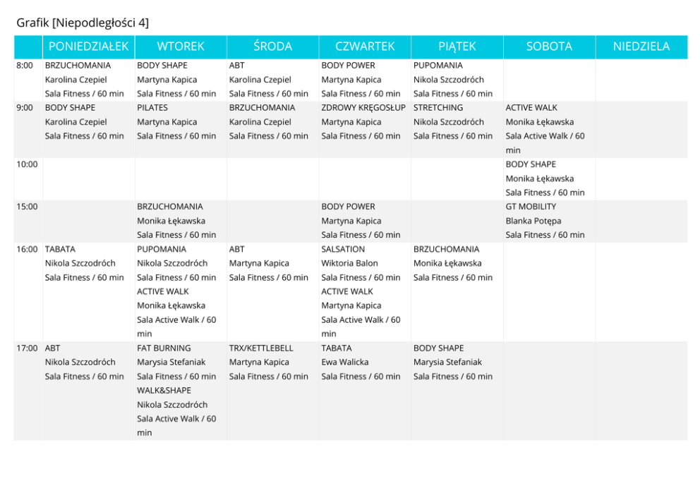 Grafik [Niepodległości 4] PONIEDZIAŁEK 8:00 9:00 WTOREK ŚRODA CZWARTEK PIĄTEK SOBOTA BRZUCHOMANIA BODY SHAPE ABT BODY POWER PUPOMANIA Karolina Czepiel Martyna Kapica Karolina Czepiel Martyna Kapica Nikola Szczodróch Sala Fitness / 60 min Sala Fitness / 60 min Sala Fitness / 60 min Sala Fitness / 60 min Sala Fitness / 60 min BODY SHAPE PILATES BRZUCHOMANIA ZDROWY KRĘGOSŁUP STRETCHING ACTIVE WALK Karolina Czepiel Martyna Kapica Karolina Czepiel Martyna Kapica Nikola Szczodróch Monika Łękawska Sala Fitness / 60 min Sala Fitness / 60 min Sala Fitness / 60 min Sala Fitness / 60 min Sala Fitness / 60 min Sala Active Walk / 60 min 10:00 BODY SHAPE Monika Łękawska Sala Fitness / 60 min 15:00 16:00 TABATA BRZUCHOMANIA BODY POWER GT MOBILITY Monika Łękawska Martyna Kapica Blanka Potępa Sala Fitness / 60 min Sala Fitness / 60 min Sala Fitness / 60 min PUPOMANIA ABT SALSATION BRZUCHOMANIA Nikola Szczodróch Nikola Szczodróch Martyna Kapica Wiktoria Balon Monika Łękawska Sala Fitness / 60 min Sala Fitness / 60 min Sala Fitness / 60 min Sala Fitness / 60 min Sala Fitness / 60 min 17:00 ABT ACTIVE WALK ACTIVE WALK Monika Łękawska Martyna Kapica Sala Active Walk / 60 Sala Active Walk / 60 min min FAT BURNING TRX/KETTLEBELL TABATA BODY SHAPE Nikola Szczodróch Marysia Stefaniak Martyna Kapica Ewa Walicka Marysia Stefaniak Sala Fitness / 60 min Sala Fitness / 60 min Sala Fitness / 60 min Sala Fitness / 60 min Sala Fitness / 60 min WALK&SHAPE Nikola Szczodróch Sala Active Walk / 60 min NIEDZIELA 18:00 XCO BODY POWER GT CORE PILATES ZUMBA® Monika Łękawska Marysia Stefaniak Blanka Potępa Ewa Walicka Wiktoria Balon Sala Fitness / 60 min Sala Fitness / 60 min Sala Fitness / 60 min Sala Fitness / 60 min Sala Fitness / 60 min WALK&TBC ACTIVE WALK WALK&SHAPE Nikola Szczodróch Martyna Kapica Nikola Szczodróch Sala Active Walk / 60 Sala Active Walk / 60 Sala Active Walk / 60 min min min 19:00 ZUMBA® ZDROWY KRĘGOSŁUP ZUMBA® XCO PUMP Alicja Ożóg Ewa Walicka Wiktoria Balon Nikola Szczodróch Nikola Szczodróch Sala Fitness / 60 min Sala Fitness / 60 min Sala Fitness / 60 min Sala Fitness / 60 min Sala Fitness / 60 min WALK&TBC Nikola Szczodróch Sala Active Walk / 60 min 20:00 GT STRENGTH ZUMBA® BRZUCHOMANIA BODY SHAPE ABT Blanka Potępa Alicja Ożóg Nikola Szczodróch Marysia Stefaniak Nikola Szczodróch Sala Fitness / 60 min Sala Fitness / 60 min Sala Fitness / 60 min Sala Fitness / 60 min Sala Fitness / 60 min WALK&TBC WALK&SHAPE Ewa Walicka Nikola Szczodróch Sala Active Walk / 60 Sala Active Walk / 60 min min