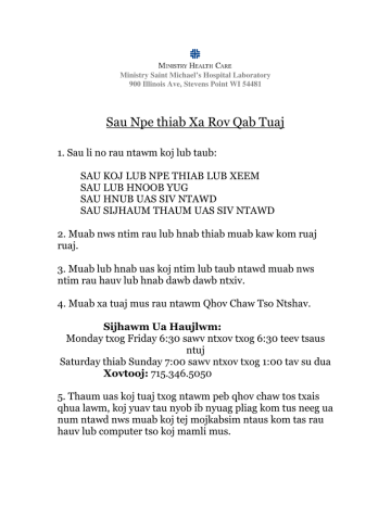 Ministry Saint Michael’s Hospital Laboratory 900 Illinois Ave, Stevens Point WI 54481 Sau Npe thiab Xa Rov Qab Tuaj 1. Sau li no rau ntawm koj lub taub: SAU KOJ LUB NPE THIAB LUB XEEM SAU LUB HNOOB YUG SAU HNUB UAS SIV NTAWD SAU SIJHAUM THAUM UAS SIV NTAWD 2. Muab nws ntim rau lub hnab thiab muab kaw kom ruaj ruaj. 3. Muab lub hnab uas koj ntim lub taub ntawd muab nws ntim rau hauv lub hnab dawb dawb ntxiv. 4. Muab xa tuaj mus rau ntawm Qhov Chaw Tso Ntshav. Sijhawm Ua Haujlwm: Monday txog Friday 6:30 sawv ntxov txog 6:30 teev tsaus ntuj Saturday thiab Sunday 7:00 sawv ntxov txog 1:00 tav su dua Xovtooj: 715.346.5050 5. Thaum uas koj tuaj txog ntawm peb qhov chaw tos txais qhua lawm, koj yuav tau nyob ib nyuag pliag kom tus neeg ua num ntawd nws muab koj tej mojkabsim ntaus kom tas rau hauv lub computer tso koj mamli mus.