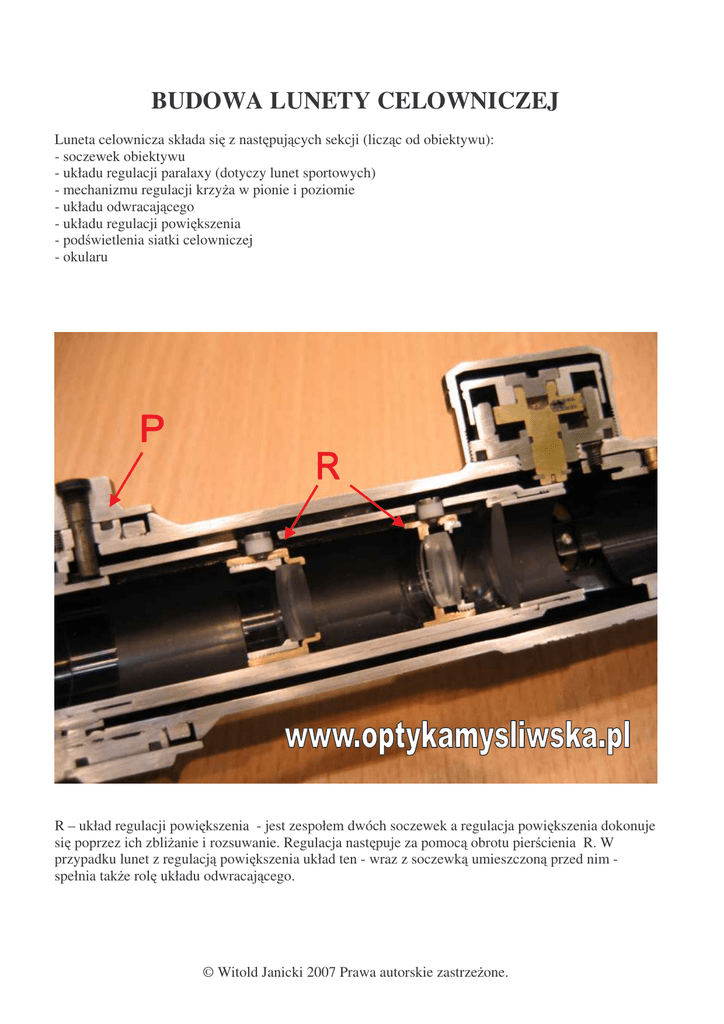 BUDOWA LUNETY CELOWNICZEJ Luneta celownicza składa si z nast puj cych sekcji (licz c od obiektywu): - soczewek obiektywu - układu regulacji paralaxy (dotyczy lunet sportowych) - mechanizmu regulacji krzy a w pionie i poziomie - układu odwracaj cego - układu regulacji powi kszenia - pod wietlenia siatki celowniczej - okularu R – układ regulacji powi kszenia - jest zespołem dwóch soczewek a regulacja powi kszenia dokonuje si poprzez ich zbli anie i rozsuwanie. Regulacja nast puje za pomoc obrotu pier cienia R. W przypadku lunet z regulacj powi kszenia układ ten - wraz z soczewk umieszczon przed nim spełnia tak e rol układu odwracaj cego. © Witold Janicki 2007 Prawa autorskie zastrze one. układ regulacji paralaxy – na pokr tle oznaczonym cyfr X (wyst puje z lewej strony tubusu – na zdj ciu znajduje si pod przekrojem i dotyka podło a) zamontowany jest mimo rodowo popychacz (a wła ciwie korbowód K), który przesuwa tulej z układem soczewek S do przodu i do tyłu zmieniaj c ogniskow układu a co za tym idzie przesuwaj c miejsce powstawania pozornego obrazu celu (chcemy aby zawsze znajdował si w płaszczy nie krzy a - je eli ten obraz tworzy si przed lub za krzy em to mo emy mówi o bł dzie paralaxy. Na zdj ciu doskonale widoczna jest tak e zapadka Z w wie yczce regulacji krzy a w pionie. Dzi ki tej zapadce regulacja krzy a odbywa si skokowo (klikni cia). © Witold Janicki 2007 Prawa autorskie zastrze one. Układ regulacji powi kszenia razem z krzy em jest umieszczony wewn trz tulei T regulowanej w pionie i poziomie za pomoc pokr teł w wie yczkach. Aby umo liwi ruch wahliwy tuleja uło yskowana jest na ło ysku Ł. © Witold Janicki 2007 Prawa autorskie zastrze one. To zdj cie przedstawia widok mechanizmu pod wietlenia siatki celowniczej: D – dioda pod wietlenia lunety. Jak wida dioda nie znajduje si w rodku krzy a ale na jego obr bie i działa jak latarka która go o wietla. Na rysunku wida dobrze ło ysko Ł mocuj ce tulej układu odwracaj cego. Prosz zwróci uwag jak luneta jest starannie wyczerniona w rodku (aby zapobiec wewn trznym odbiciom wiatła). W przypadku tej lunety krzy został umieszczony w 2giej płaszczy nie obrazu zwanej tak e płaszczyzn okularu. W konsekwencji pozostaje niezmieniony w całym zakresie powi ksze lunety. Rozwi zanie to ma jednak pewn wad – najdrobniejsze niedoskonało ci mechaniki regulacji powi kszenia wpływaj na zmienianie si punktu trafienia przy zmianie powi kszenia. Luneta musi by najwy szej klasy aby to zjawisko nie wyst powało. © Witold Janicki 2007 Prawa autorskie zastrze one. Dzi ki temu elementowi mo liwe jest skokowe ustawienie regulacji nat enia pod wietlenia krzy a (Z- zapadka). W miejscu baterii na przekroju umieszczona jest spr yna. © Witold Janicki 2007 Prawa autorskie zastrze one. Wida tu dokładnie z ilu soczewek składa si okular. Zespół pierwszej soczewki jest poł czeniem soczewki wkl słej i wypukłej. Takie rozwi zanie jest powszechnie stosowane tak e dla układu soczewek obiektywu (achromat) i umo liwia korekt bł dów optycznych. Soczewki wykonane s z ró nego rodzaju szkła a wi c inaczej załamuj wiatło wzajemnie koryguj c bł dy optyczne. Jak wida na przekroju obrót zewn trznego pier cienia regulacji powi kszenia jest przenoszony na obrót tulei układu odwracaj cego za po rednictwem ruby S. W efekcie obrotu rowki naci te spiralnie w tulei za po rednictwem rolek (białe kr ki) przekładaj obrót tulei na ruch osiowy soczewek wymuszaj c ich zsuwanie i rozsuwanie w zale no ci w któr stron regulujemy. © Witold Janicki 2007 Prawa autorskie zastrze one. Jako P oznaczony został zewn trzny pier cie regulacji powi kszenia. Prosz zwróci uwag jak cienki jest tubus lunety – szczególnie w miejscu przej cia rodkowej, cylindrycznej cz ci tubusu w sto ek okularu. Zdarza si czasami e tubus nie wytrzymuje zbyt silnego dokr cania obejm i ulega deformacji – wgnieceniu a nawet p kni ciu. Jak wida nawet niewielkie wgniecenie tubusu mo e mie negatywny wpływ na poprawne funkcjonowanie mechanizmów wewn trznych (wewn trz lunety jest stosunkowo „ciasno”). Aby unikn zagniecenia tubusu zachowuj c jednocze nie mocne poł czenie lunety z obejmami (sztucery mocnych kalibrów) zaleca si stosowanie kleju który oprócz wzmocnienia poł czenia spowoduje równie zmniejszenie napr e jednostkowych poprzez wnikni cie w nierówno ci ł czonych powierzchni. © Witold Janicki 2007 Prawa autorskie zastrze one. To zdj cie przedstawia budow obiektywu – podobnie jak w przypadku okularu tutaj tak e wyst puj sklejone razem dwie soczewki wypukła i wkl sła - jest to obiektyw typu achromatycznego. Aby umo liwi regulacj układ ten umieszczono wewn trz nagwintowanej tulei umo liwiaj c tym samym przesuwanie soczewek w osi lunety. © Witold Janicki 2007 Prawa autorskie zastrze one.