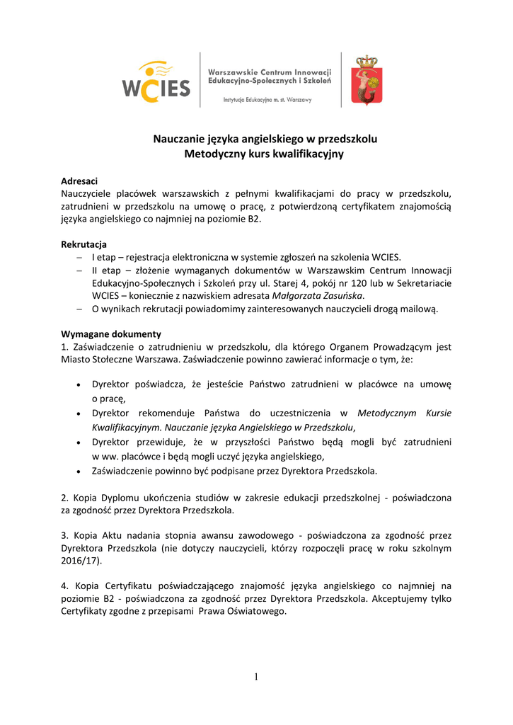 Nauczanie języka angielskiego w przedszkolu Metodyczny kurs kwalifikacyjny Adresaci Nauczyciele placówek warszawskich z pełnymi kwalifikacjami do pracy w przedszkolu, zatrudnieni w przedszkolu na umowę o pracę, z potwierdzoną certyfikatem znajomością języka angielskiego co najmniej na poziomie B2. Rekrutacja I etap – rejestracja elektroniczna w systemie zgłoszeń na szkolenia WCIES. II etap – złożenie wymaganych dokumentów w Warszawskim Centrum Innowacji Edukacyjno-Społecznych i Szkoleń przy ul. Starej 4, pokój nr 120 lub w Sekretariacie WCIES – koniecznie z nazwiskiem adresata Małgorzata Zasuńska. O wynikach rekrutacji powiadomimy zainteresowanych nauczycieli drogą mailową. Wymagane dokumenty 1. Zaświadczenie o zatrudnieniu w przedszkolu, dla którego Organem Prowadzącym jest Miasto Stołeczne Warszawa. Zaświadczenie powinno zawierać informacje o tym, że: Dyrektor poświadcza, że jesteście Państwo zatrudnieni w placówce na umowę o pracę, Dyrektor rekomenduje Państwa do uczestniczenia w Metodycznym Kursie Kwalifikacyjnym. Nauczanie języka Angielskiego w Przedszkolu, Dyrektor przewiduje, że w przyszłości Państwo będą mogli być zatrudnieni w ww. placówce i będą mogli uczyć języka angielskiego, Zaświadczenie powinno być podpisane przez Dyrektora Przedszkola. 2. Kopia Dyplomu ukończenia studiów w zakresie edukacji przedszkolnej - poświadczona za zgodność przez Dyrektora Przedszkola. 3. Kopia Aktu nadania stopnia awansu zawodowego - poświadczona za zgodność przez Dyrektora Przedszkola (nie dotyczy nauczycieli, którzy rozpoczęli pracę w roku szkolnym 2016/17). 4. Kopia Certyfikatu poświadczającego znajomość języka angielskiego co najmniej na poziomie B2 - poświadczona za zgodność przez Dyrektora Przedszkola. Akceptujemy tylko Certyfikaty zgodne z przepisami Prawa Oświatowego. 1 Opis Kurs Nauczanie języka angielskiego w przedszkolu skierowany jest do nauczycieli posiadających kwalifikacje do kształcenia dzieci w przedszkolu, którzy chcieliby uzupełnić swoje kompetencje nauczycielskie o kompetencje do nauczania języka angielskiego dzieci w wieku przedszkolnym. Kurs prowadzony jest w formie warsztatowej z elementami formy wykładowej, która ma na celu bezpośrednie wykorzystanie przekazanej wiedzy w praktyce. Integralną częścią kursu jest praktyka nauczycielska, którą uczestnicy kursu odbywają pod opieką nauczyciela akademickiego (opiekuna praktyk) oraz mentora – opiekuna praktyk w przedszkolu. Kurs prowadzony jest na terenie Wydziału Pedagogicznego oraz WCIES. Uczestnicy otrzymują materiały szkoleniowe (UW) oraz niezbędne publikacje (WCIES) do realizacji kursu. Uczestnicy otrzymują zaświadczenie potwierdzające zaliczenie kursu. Cel kursu Celem kursu jest przygotowanie metodyczne nauczycieli wychowania przedszkolnego do prowadzenia zajęć z języka angielskiego oraz doskonalenie językowe przygotowujące do posługiwania się językiem angielskim podczas całego dnia pracy z dziećmi podczas zajęć i zabaw oraz czynności dnia codziennego i samoobsługowych. Uczestnicy zostaną też przygotowani do rozwijania wrażliwości interkulturowej i świadomości różnojęzycznej u dzieci. Przedmioty 1. Metodyka nauczania dzieci języka angielskiego 60 godzin (ćwiczenia). 2. Wprowadzenie do wiedzy o przyswajaniu języka pierwszego i drugiego 15 godzin (wykład). 3. Fonetyka praktyczna w kontekście pedagogicznym 30 godzin (ćwiczenia). 4. Praktyczna znajomość języka angielskiego pracy pedagogicznej w przedszkolu 30 godzin (ćwiczenia). 5. Rozwijanie wrażliwości interkulturowej i różnojęzycznej 30 godzin (ćwiczenia). 6. CLIL 30 godzin (ćwiczenia). 7. Pracownia metodyczna – opieka nad praktykami w przedszkolu (obserwacje zajęć przez prowadzącego) 60 godzin (obserwacji). 8. Praktyki pedagogiczne w przedszkolu (opieka mentora) 60 godzin. Czas trwania kursu: 255 godzin dydaktycznych + 60 godzin praktyk. Przewidywany czas rozpoczęcia i zakończenia szkolenia: po zrekrutowaniu grupy nauczycieli – nie wcześniej niż w drugiej połowie listopada 2016. Przewidywany harmonogram: co dwa tygodnie, piątki w godz. 15.00-19.00 i soboty w godz. 9.00-17.00. Osoby prowadzące kurs: pracownicy Katedry Edukacji Wczesnoszkolnej i Kształcenia Nauczycieli, Katedry Edukacji Początkowej, metodycy współpracujący z WP UW oraz z WCIES. Kierownicy kursu Małgorzata Zasuńska – WCIES, kierownik organizacyjny Agnieszka Dwojak-Matras – UW, kierownik merytotyczny 2 Efekty kształcenia W zakresie wiedzy uczestnik kursu potrafi: Ma uporządkowaną wiedzę na temat przyswajania i uczenia się języka obcego, zarówno w aspekcie biologicznym, jak i psychologicznym oraz społecznym ze szczególnym uwzględnieniem dzieci w wieku od 3 do 6 r.ż. Posiada uporządkowaną wiedzę na temat metod nauczania języka obcego w przedszkolu. Zna i podstawową terminologię z zakresu psycholingwistyki oraz metodyki nauczania języka obcego w języku polskim oraz w języku angielskim. Zna i wykorzystuje dokument podstawy programowej określający efekty i organizację przygotowania do nauki języka obcego w przedszkolu. Ma pogłębioną wiedzę na temat celów i sposobów pracy dydaktycznej z dziećmi w nauce języka angielskiego w przedszkolu. Ma pogłębioną wiedzę o różnorodnych technikach oceniania umiejętności językowych uczniów w wieku przedszkolnym. Posiada uporządkowaną wiedzę na temat sposobów indywidualizacji nauczania ze względu na różne potrzeby i style uczenia się dzieci. Posiada uporządkowaną wiedzę o języku angielskim, zwłaszcza w kontekście trudności jakie ten język przysparza polskim uczniom. Ma uporządkowaną wiedzę na temat wymowy i systemu fonetycznego języka angielskiego zwłaszcza w obszarze trudności na jakie natrafiają polscy uczniowie. Posiada uporządkowaną wiedzę o kulturze krajów anglosaskich niezbędną do rozwijania wrażliwości kulturowej uczniów. W zakresie umieję