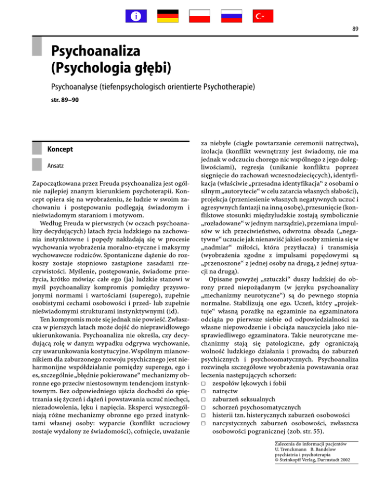 89 Psychoanaliza (Psychologia głębi) Psychoanalyse (tiefenpsychologisch orientierte Psychotherapie) str. 89–90 Koncept Ansatz Zapoczątkowana przez Freuda psychoanaliza jest ogólnie najlepiej znanym kierunkiem psychoterapii. Koncept opiera się na wyobrażeniu, że ludzie w swoim zachowaniu i postępowaniu podlegają świadomym i nieświadomym staraniom i motywom. Według Freuda w pierwszych (w oczach psychoanalizy decydujących) latach życia ludzkiego na zachowania instynktowne i popędy nakładają się w procesie wychowania wyobrażenia moralno-etyczne i maksymy wychowawcze rodziców. Spontaniczne dążenie do rozkoszy zostaje stopniowo zastąpione zasadami rzeczywistości. Myślenie, postępowanie, świadome przeżycia, krótko mówiąc całe ego (ja) ludzkie stanowi w myśl psychoanalizy kompromis pomiędzy przyswojonymi normami i wartościami (superego), zupełnie osobistymi cechami osobowości i przed- lub zupełnie nieświadomymi strukturami instynktywnymi (id). Ten kompromis może się jednak nie powieść.Zwłaszcza w pierszych latach może dojść do nieprawidłowego ukierunkowania. Psychoanaliza nie określa, czy decydującą rolę w danym wypadku odgrywa wychowanie, czy uwarunkowania kostytucyjne. Wspólnym mianownikiem dla zaburzonego rozwoju psychicznego jest nieharmonijne współdziałanie pomiędzy superego, ego i es, szczególnie „błędnie pokierowane“ mechanizmy obronne ego przeciw niestosownym tendencjom instynktownym. Bez odpowiedniego ujścia dochodzi do spiętrzania się życzeń i dążeń i powstawania uczuć niechęci, niezadowolenia, lęku i napięcia. Eksperci wyszczególniają różne mechanizmy obronne ego przed instynktami własnej osoby: wyparcie (konflikt uczuciowy zostaje wydalony ze świadomości), cofnięcie, uważanie za niebyłe (ciągłe powtarzanie ceremonii natręctwa), izolacja (konflikt wewnętrzny jest świadomy, nie ma jednak w odczuciu chorego nic wspólnego z jego dolegliwościami), regresja (unikanie konfliktu poprzez sięgnięcie do zachowań wczesnodziecięcych), identyfikacja (właściwie „przesadna identyfikacja“ z osobami o silnym „autorytecie“ w celu zatarcia własnych słabości), projekcja (przeniesienie własnych negatywnych uczuć i agresywnych fantazji na inną osobę),przesunięcie (konfliktowe stosunki międzyludzkie zostają symbolicznie „rozładowane“ w jednym narządzie), przemiana impulsów w ich przeciwieństwo, odwrotna obsada („negatywne“ uczucie jak nienawiść jakieś osoby zmienia się w „nadmiar“ miłości, która przytłacza) i transmisja (wyobrażenia zgodne z impulsami popędowymi są „przenoszone“ z jednej osoby na drugą, z jednej sytuacji na drugą). Opisane powyżej „sztuczki“ duszy ludzkiej do obrony przed niepożądanym (w języku psychoanalizy „mechanizmy neurotyczne“) są do pewnego stopnia normalne. Stabilizują one ego. Uczeń, który „projektuje“ własną porażkę na egzaminie na egzaminatora odciąża po pierwsze siebie od odpowiedzialności za własne niepowodzenie i obciąża nauczyciela jako niesprawiedliwego egzaminatora. Takie neurotyczne mechanizmy stają się patologiczne, gdy ograniczają wolność ludzkiego działania i prowadzą do zaburzeń psychicznych i psychosomatycznych. Psychoanaliza rozwinęła szczegółowe wyobrażenia powstawania oraz leczenia następujących schorzeń: zespołów lękowych i fobii natręctw zaburzeń seksualnych schorzeń psychosomatycznych histerii tzn. histerycznych zaburzeń osobowości narcystycznych zaburzeń osobowości, zwłaszcza osobowości pogranicznej (zob. str. 55). Zalecenia do informacji pacjentów U. Trenckmann B. Bandelow psychiatria i psychoterapia © Steinkopff Verlag, Darmstadt 2002 90 Psychoanaliza (Psychologia głębi) Przeprowadzenie i metoda ? Jakie istnieją możliwości i granice? Vorgehen und Methode ? Welche Möglichkeiten und Grenzen gibt es? Psychoterapie, które opierają się na psychoanalizie i psychologii głębi odbywają się w grupach oraz w formie indywidualnej. Ważnym „wspólnym mianownikiem“ różnych kierunków psychoterapii opierających się na tezach Freuda jest umożliwienie pacjentowi tzw. „wolnej asocjacji“, tzn. pozwolenie na możliwie spontaniczne i niecenzurowane uwagi (skojarzenia) na dowolny, wybrany przez niego temat. Terapeuta jako osoba stoi przede wszystkim w początkowych fazach terapii na uboczu. Zachowuje „abstynencję“. Rozumie swą funkcję, jako podłoże rezonansowe ze wzmacniaczem w procesie wolnej asocjacji dla sytuacji przypominanych z przeszłości, a mających coś wspólnego z obecnymi przeżyciami i aktualnymi dolegliwościami. Poprzez powtórne przeżycie w myślach, lecz przede wszystkim emocjonalne, obciążających wydarzeń między innymi z wczesnego dzieciństwa pacjenci mogą w najlepszym przypadku dojść do nowej ich oceny, ewentualnie pozbyć się dawnych „uwięzionych“ uczuć. Psychoanalityk oferuje interpretację powstających oporów i analizuje tzw. procesy przeniesienia i przeciwprzeniesienia. Rozumiemy przez to, że ludzie nieświadomie skłonni są do przenoszenia przeszłości do teražniejszości np. przygniatający autorytet ojca z dzieciństwa na ich obecną pozycję w świecie dorosłych. Rezultuje z tego być może socjalny lęk i niepewność wobec rzeczywistych, czy rzekomych autorytetów. Poprzez terapeutyczną analizę i unaocznienie takich nieadekwatnych przesunięć, pacjent otrzymuje szansę na nową ocenę swych przeżyć: „Byłem może jako dziecko wydany na pastwę ojca tyrana, bezbronny i zalękniony. Wobec autorytetu mego ojca stoję dzisiaj jako osoba dorosła . . .“ Psychoanaliza jest od momentu jej powstania szeroko dyskutowaną i sporną metodą leczenia psychoterapeutycznego. Wiele jej tez jest spekulatywnych i trudnych lub niedostępnych naukowemu sprawdzeniu. Równie trudne jest standaryzowanie postępowania analityków w procesie terapeutycznym. Tak więc brak jest badań jej skutecznoś