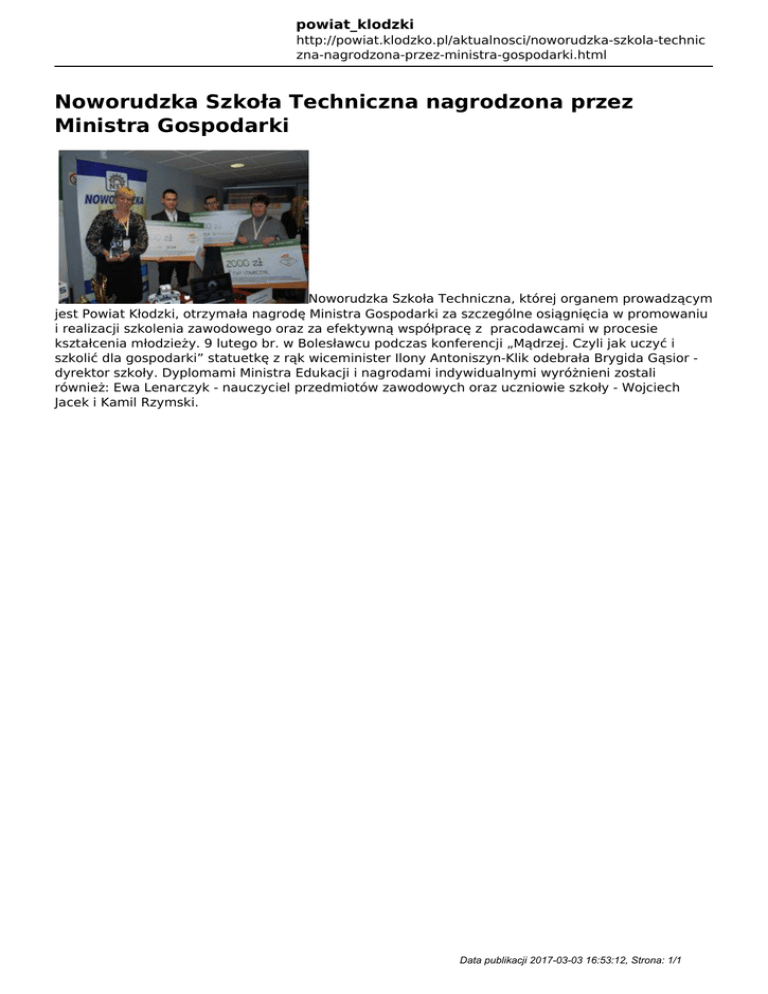 powiat_klodzki http://powiat.klodzko.pl/aktualnosci/noworudzka-szkola-technic zna-nagrodzona-przez-ministra-gospodarki.html Noworudzka Szkoła Techniczna nagrodzona przez Ministra Gospodarki Noworudzka Szkoła Techniczna, której organem prowadzącym jest Powiat Kłodzki, otrzymała nagrodę Ministra Gospodarki za szczególne osiągnięcia w promowaniu i realizacji szkolenia zawodowego oraz za efektywną współpracę z pracodawcami w procesie kształcenia młodzieży. 9 lutego br. w Bolesławcu podczas konferencji „Mądrzej. Czyli jak uczyć i szkolić dla gospodarki” statuetkę z rąk wiceminister Ilony Antoniszyn-Klik odebrała Brygida Gąsior dyrektor szkoły. Dyplomami Ministra Edukacji i nagrodami indywidualnymi wyróżnieni zostali również: Ewa Lenarczyk - nauczyciel przedmiotów zawodowych oraz uczniowie szkoły - Wojciech Jacek i Kamil Rzymski. Data publikacji 2017-03-03 16:53:12, Strona: 1/1